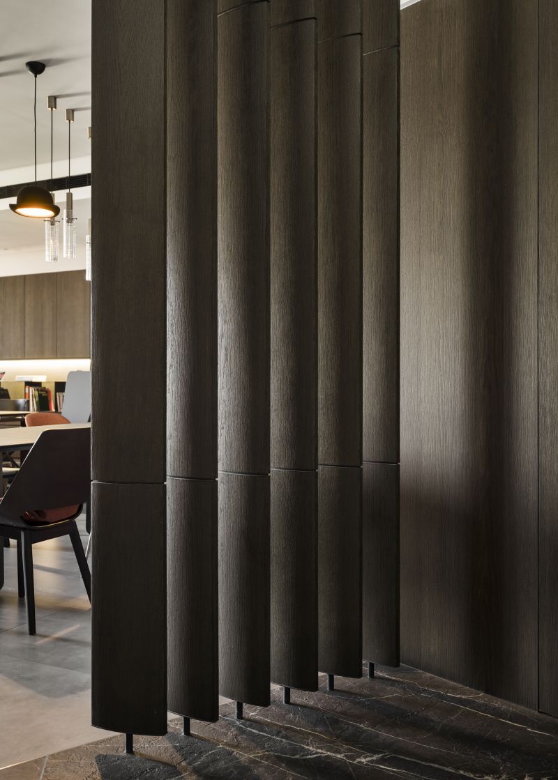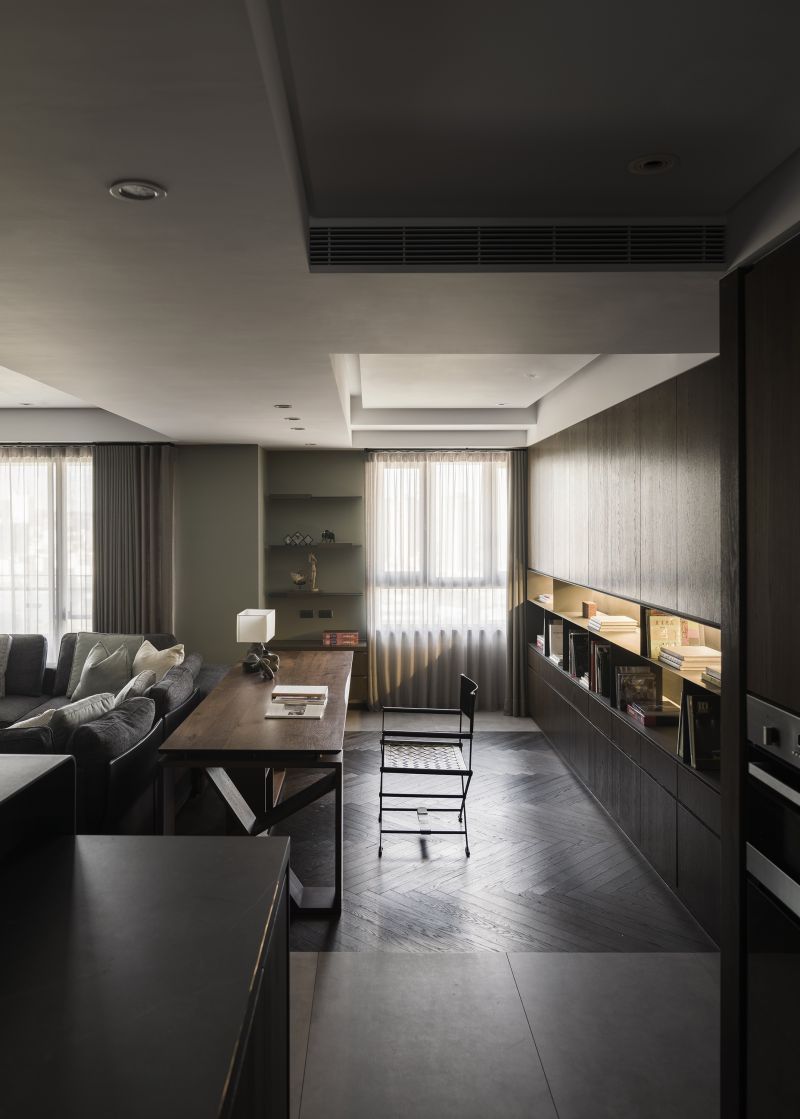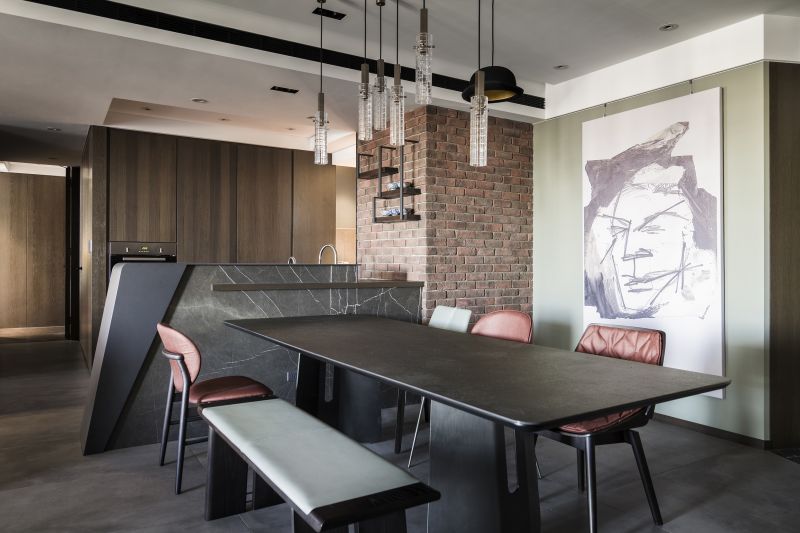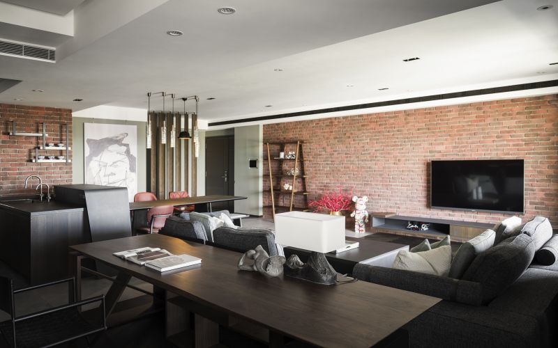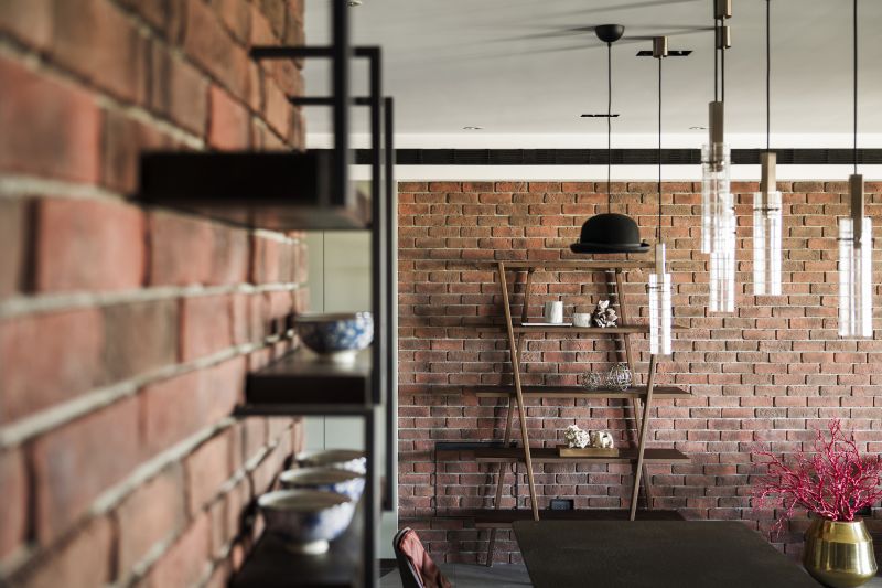 A series of perforated folding panels and the irregular division of floor patterns demarcate a porch space. Here the artistic styling of the chairs and paintings on the wall suggests the alternative role of the house as a gallery. The six-meter-long brick wall in the living room integrates the living and dining areas. The manner of continuity expands the transversal vision with a prominent figure in sight. The materiality of metal and woods reveals the stability of a brown datum, in which different shades of the gradient allocate the functionality of each component.