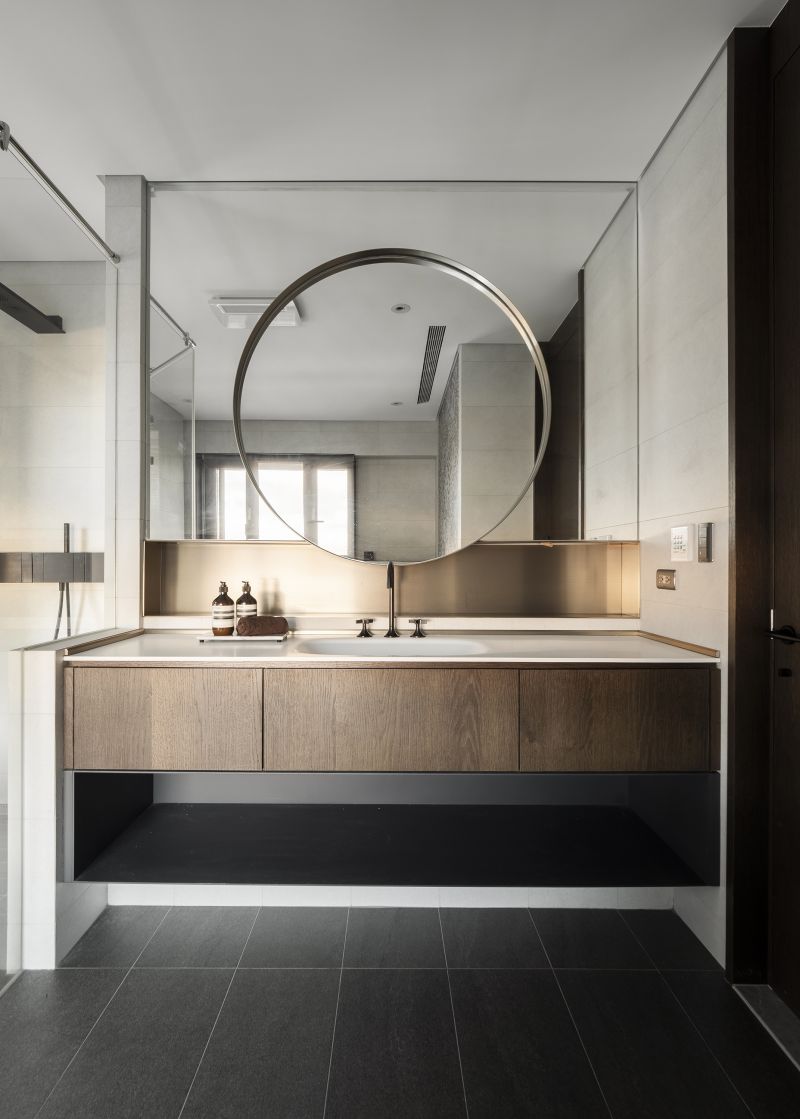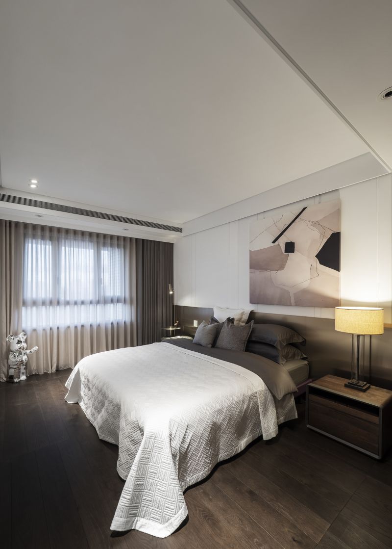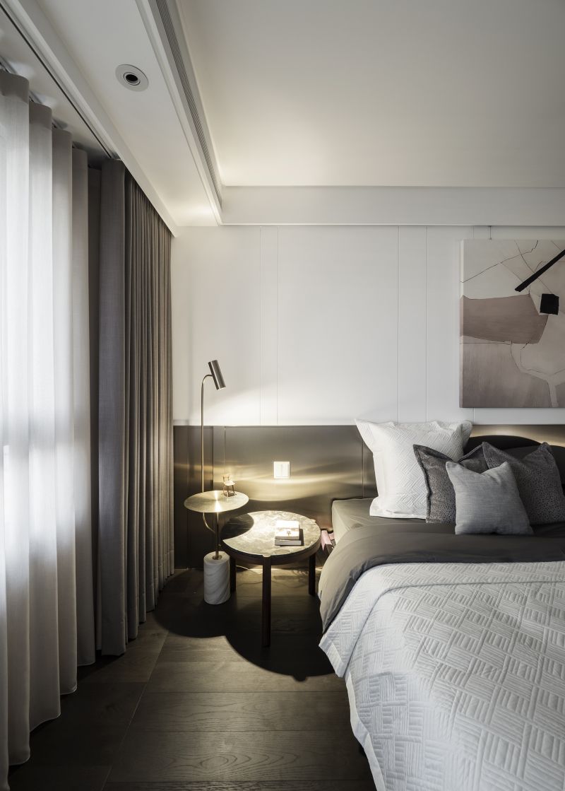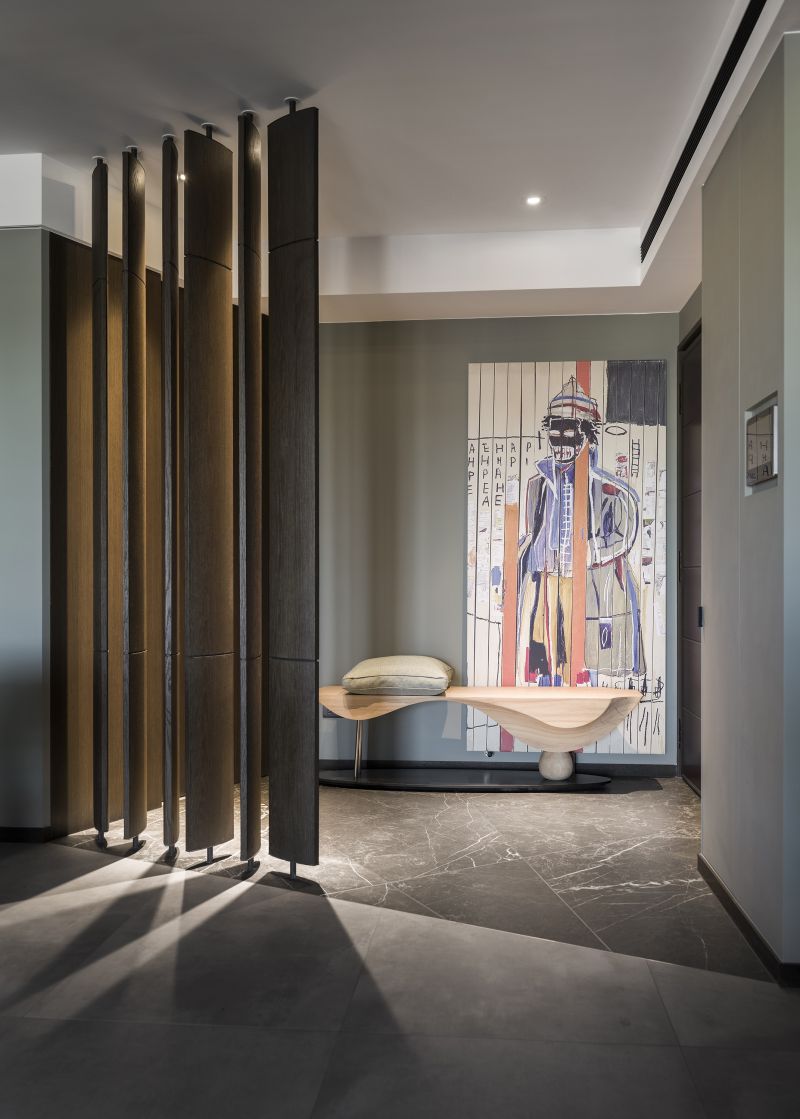 A series of perforated folding panels and the irregular division of floor patterns demarcate a porch space. Here the artistic styling of the chairs and paintings on the wall suggests the alternative role of the house as a gallery. The six-meter-long brick wall in the living room integrates the living and dining areas. The manner of continuity expands the transversal vision with a prominent figure in sight. The materiality of metal and woods reveals the stability of a brown datum, in which different shades of the gradient allocate the functionality of each component.