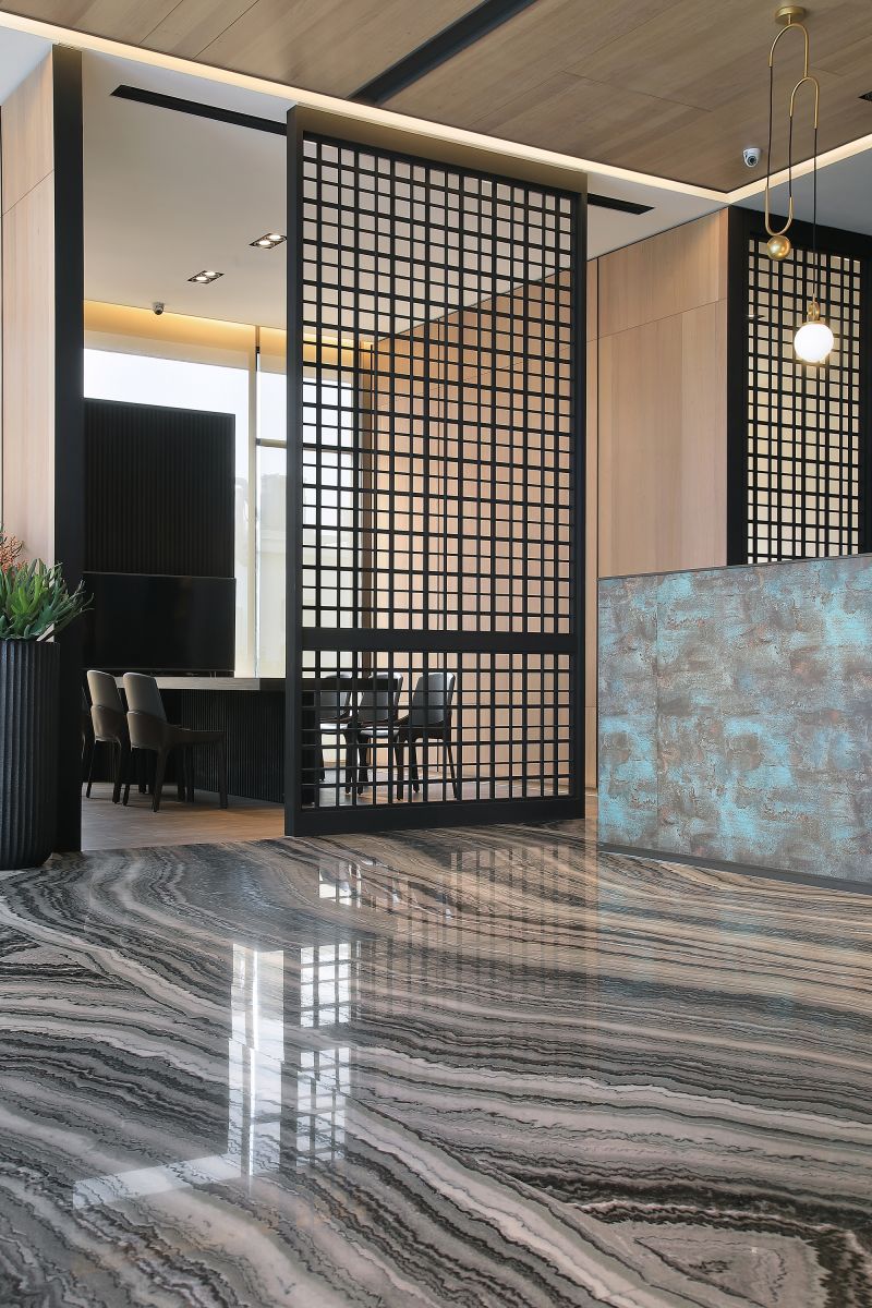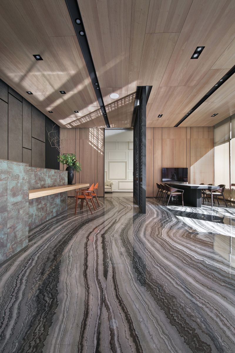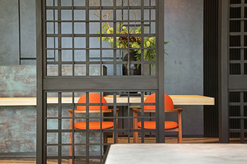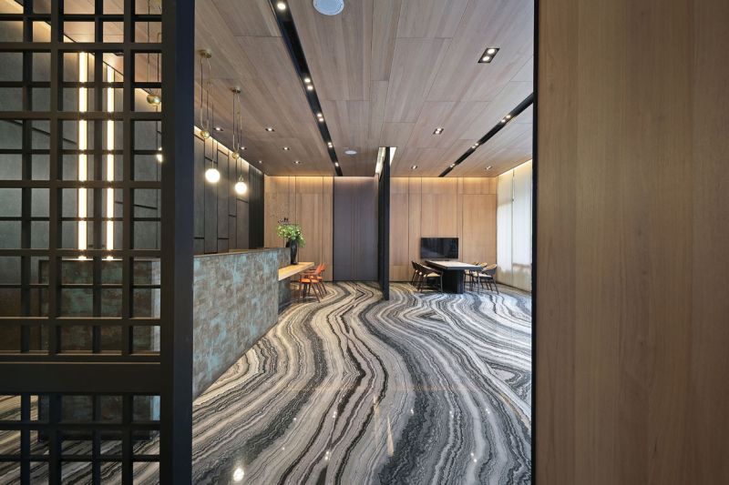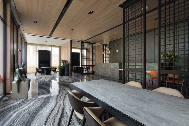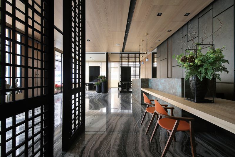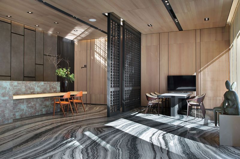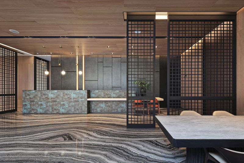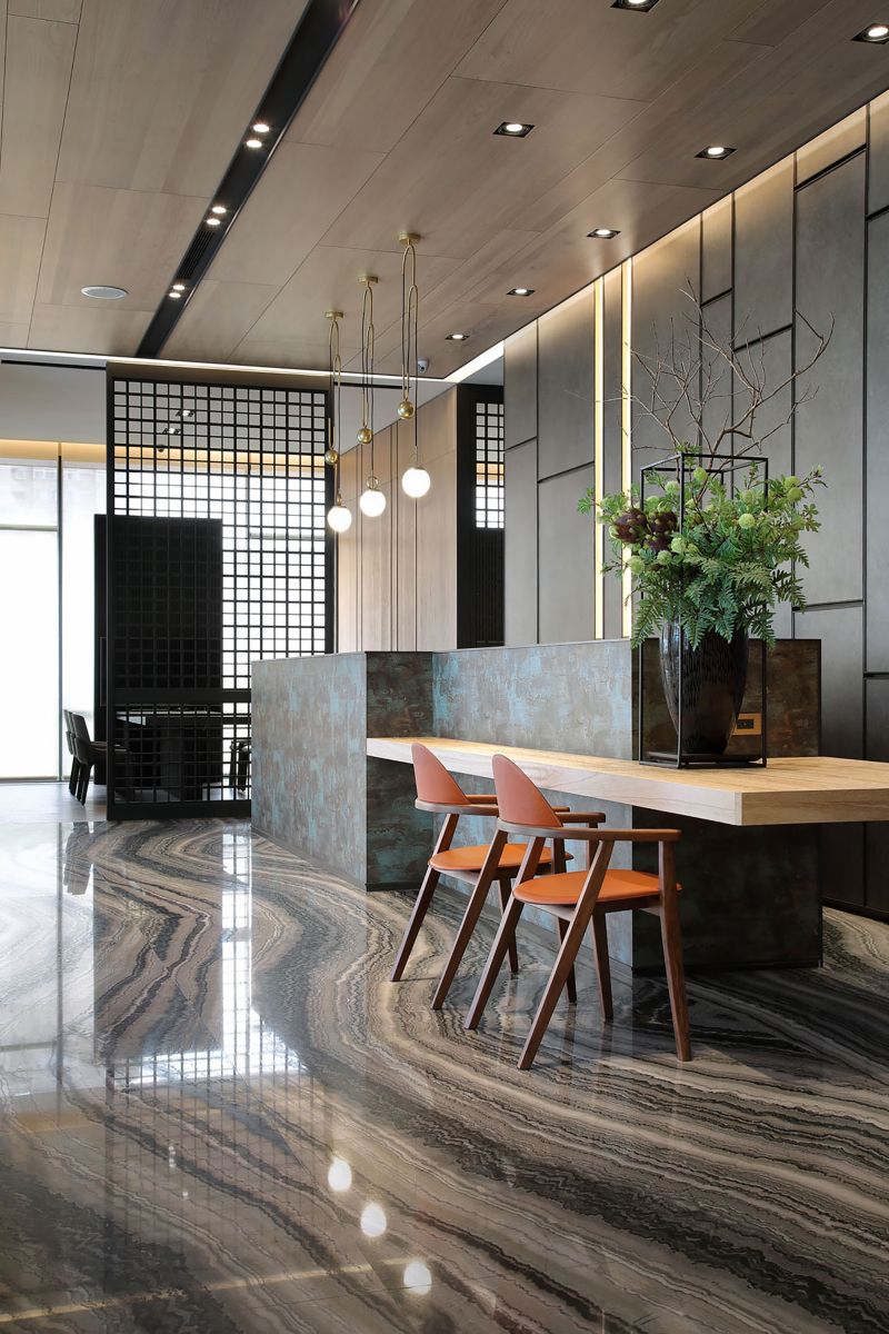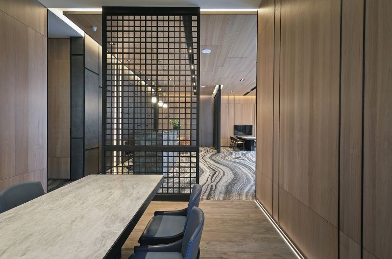 The building is an exquisite sales center, where light-toned wooden veneers adorn the ceiling and walls, delicately diffusing the ambient lighting to create a warm and pleasant atmosphere. We cleverly install multiple lacquered wooden grid partitions within, illuminating the lush greenery and lobby figurines that co-exist in harmony with nature and resulting in a serene and contemporary Zen situation. Contrasting to the hustle and bustle of the city, the center aims to provide a calming ambiance akin to the feeling of returning home for the guests.