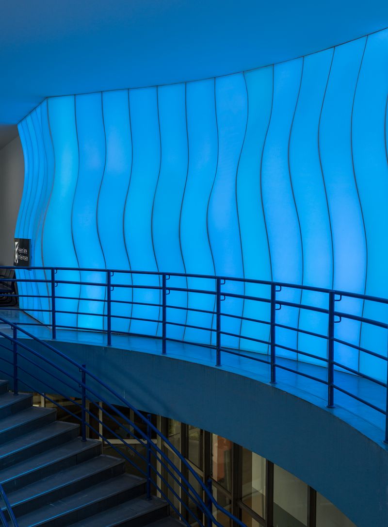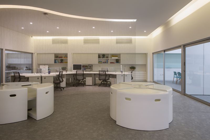 O design surgiu a partir da escolha de acabamentos claros e leves, com uma iluminação artificial que minimizasse a ausência de luz natural através de rasgos de luz indireta, p