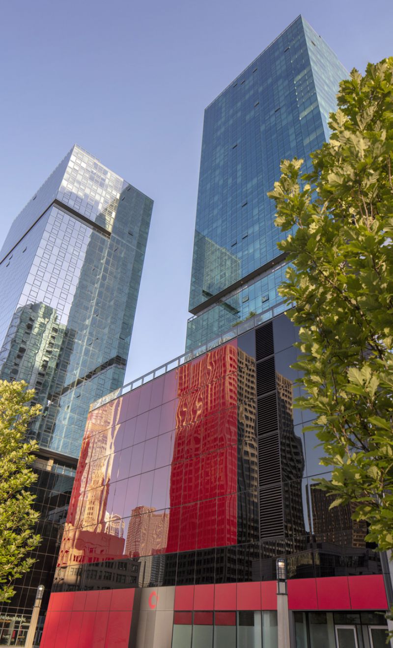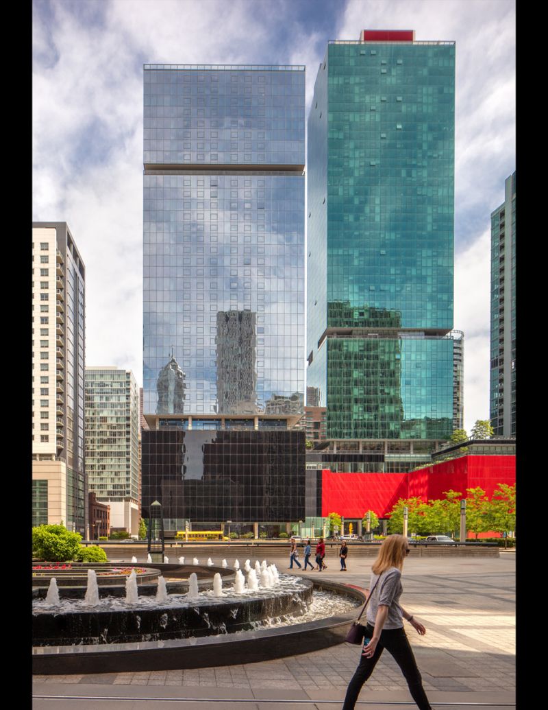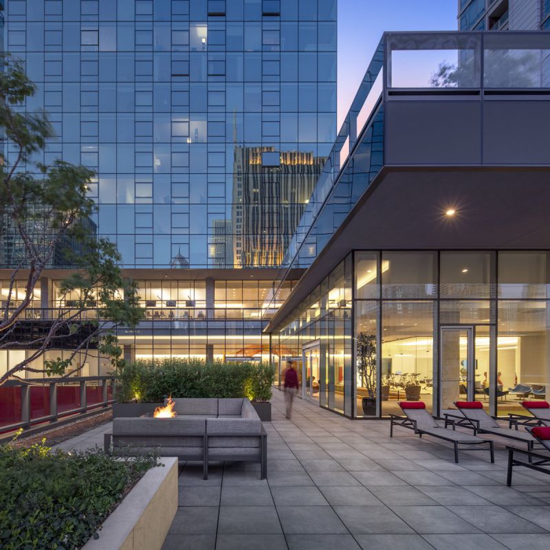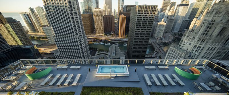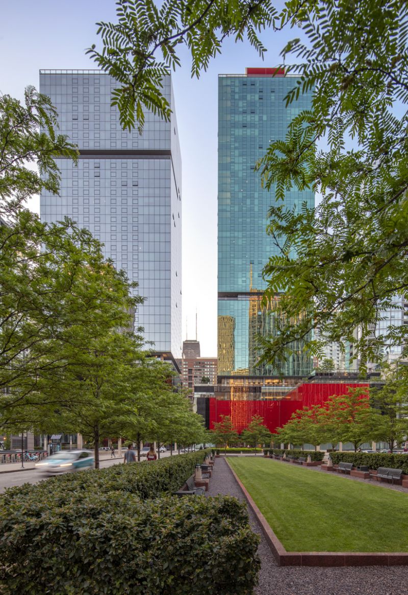 Located in Chicago, Optima Signature is 57 stories with 490 apartments, featuring views of Lake Michigan to the east and the city in all other directions. Signature has a geometrically simple and clean architectural vocabulary with a straightforward use of materials, in contrast to the historic buildings nearby. Above the podium, Signature wraps the residential levels in a transparent green glass. Deep slots are made in the curtainwall of the tower to announce the change of use from residential to amenity levels.