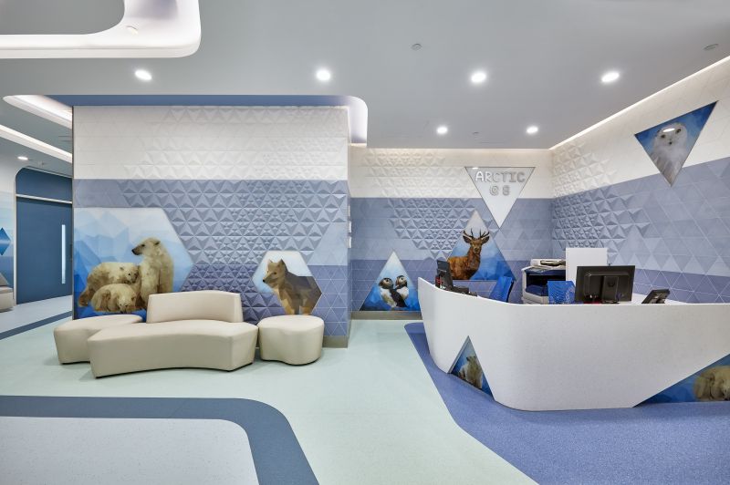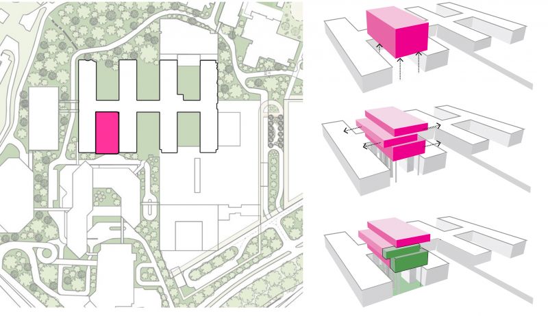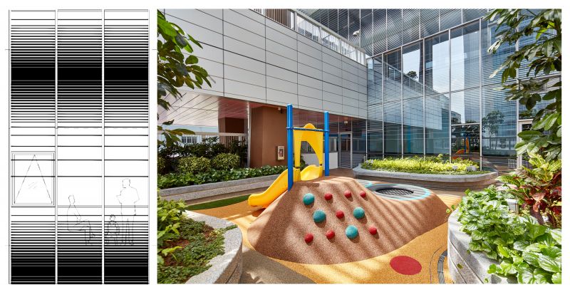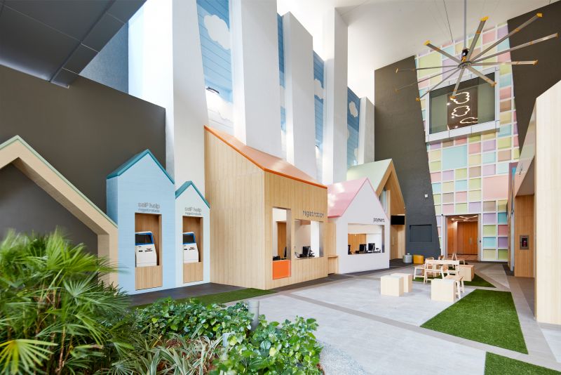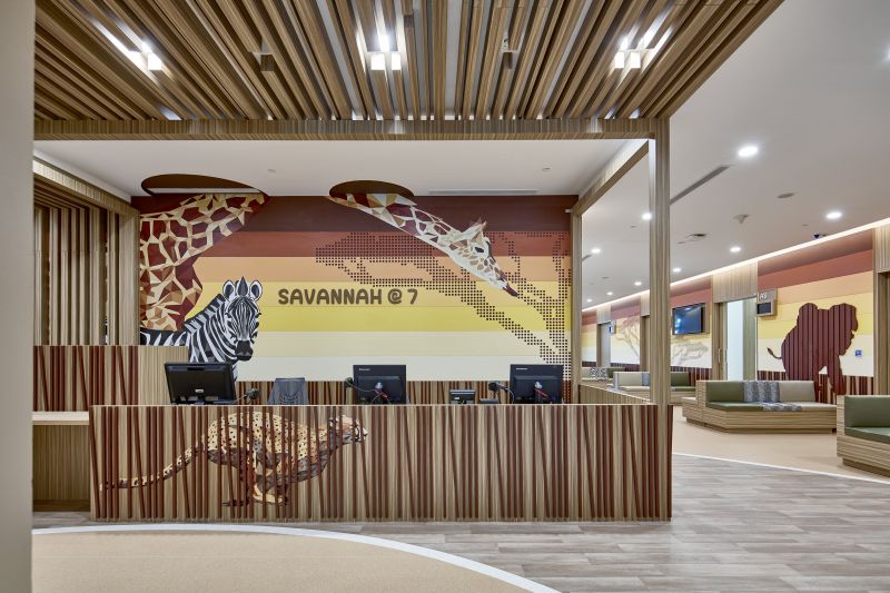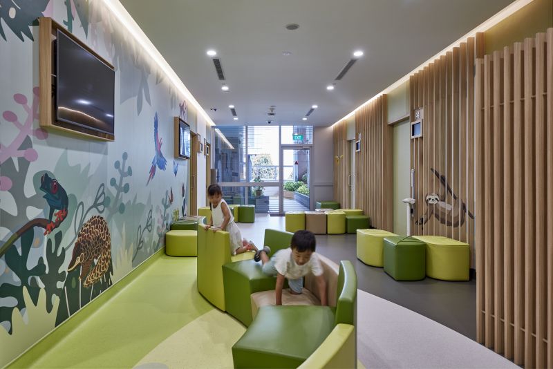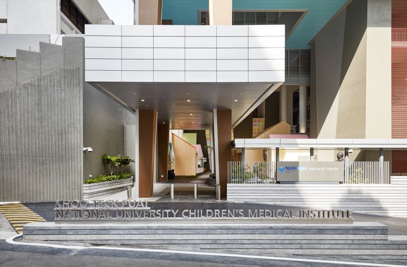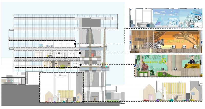 The building is situated on a compact site and is carefully inserted and lifted above the existing NUH main buildings. This creates for a large naturally ventilated atrium which incorporated a child scale cityscape. The architectural intent is based on ' Managed Playscape' where the users 'playground' inspired by nature. Each unique playscape inspired by Rainforest, Savannah, Artic is manifested geographically up the lifted massing. The massing is in terms 'shifted' to create jengga like boxes, creating institial shaded sky gardens. The consultation room is inspired by child-centric play-pan.