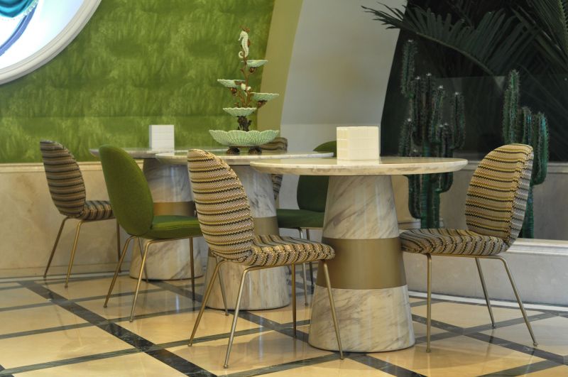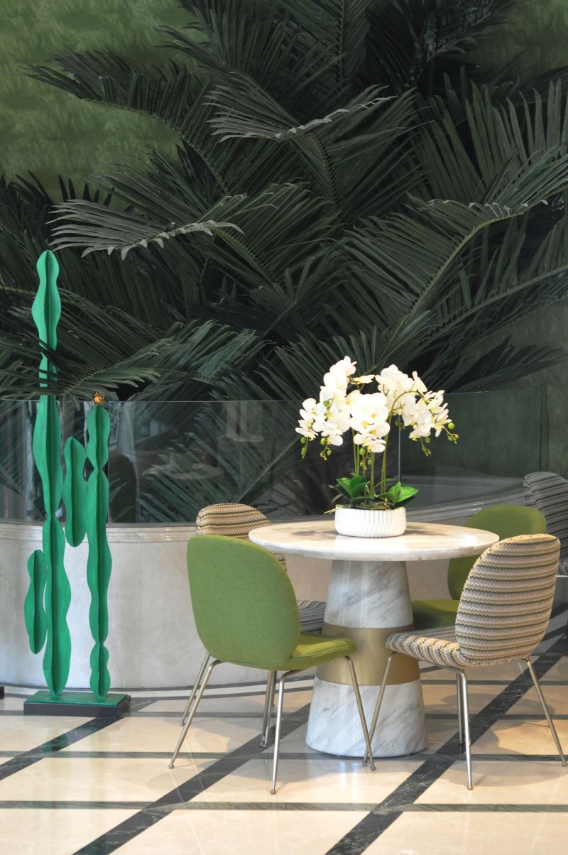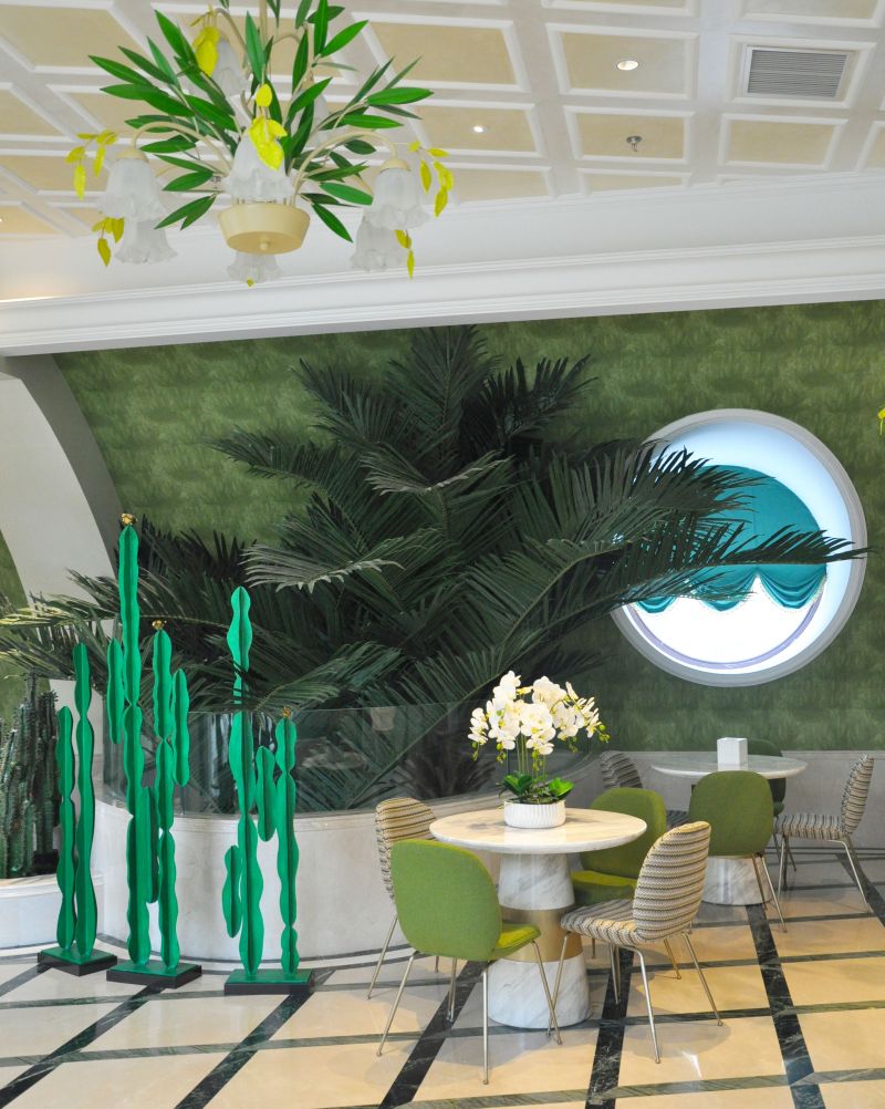 As the “summer” of the four-season restaurant in the club, this restaurant chose the most representative palm grove on the southern coast of France as the source of inspiration for the entire design. The plant wall design on the wall was mainly inspired by the French garden layout, and the scene of the French garden was erected on the wall. The marine-themed decorative discs correspond to the water features, and different types of ferns and fishing plants stagger to reflect the plant layout of the garden. With the sound of gurgling water, it is romantically refreshing s if you are by the sea..