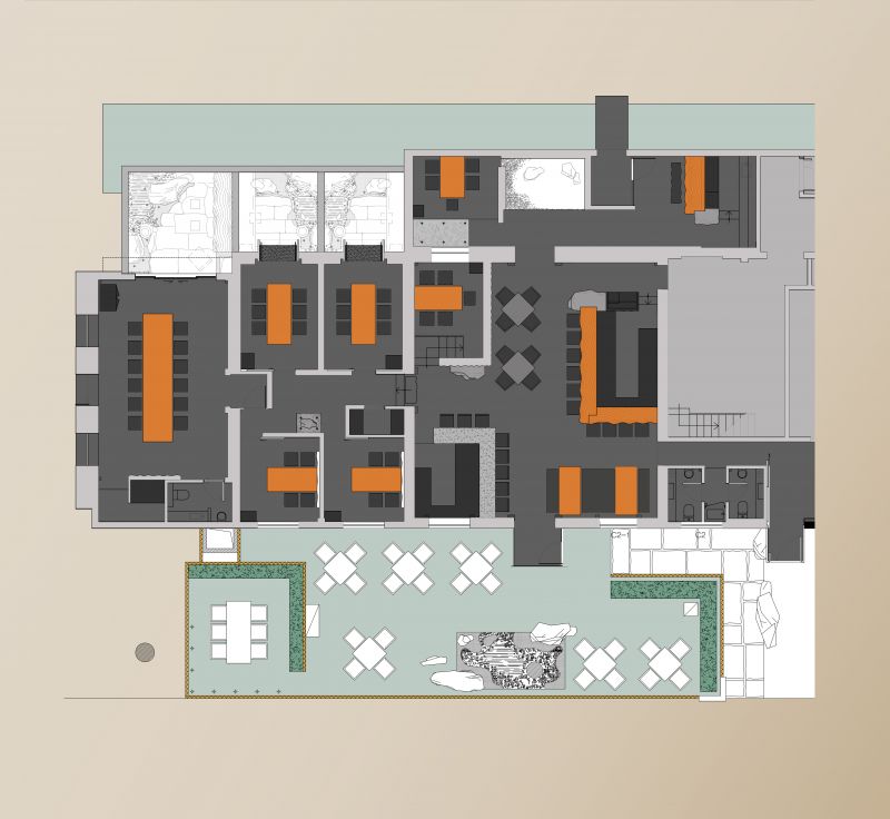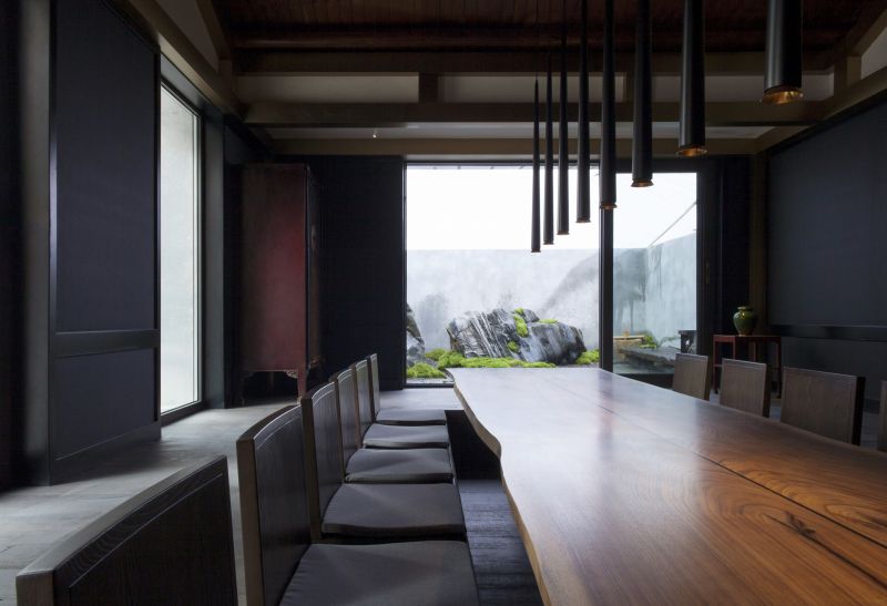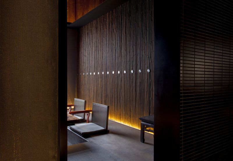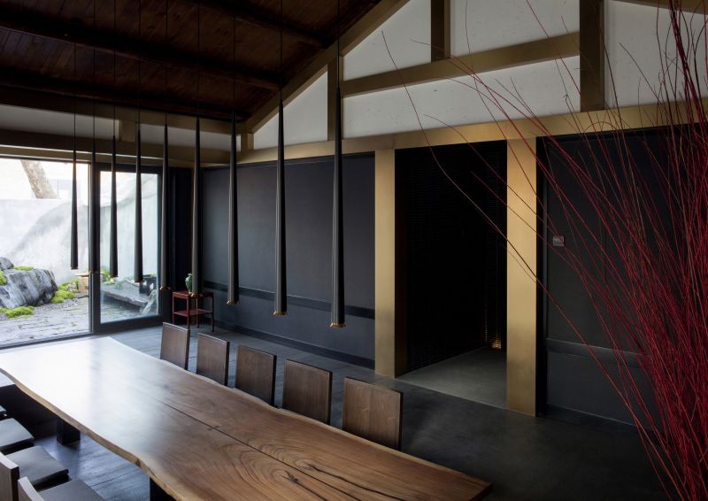The old brick and wood structure warehouse is transformed into "Hong" Japanese style cuisine, which retains its original roof structure, and the whole building is restoring the old as before. The unique traditional Japanese style is built in the interior, the modern material context is skillfully used to enhance the spatial experience, the light effect and the sense of rhythm are used to create the spatial atmosphere, embody the traditional humanistic feelings and seek the contemporary spiritual value, and create a unique poetic landscape space.