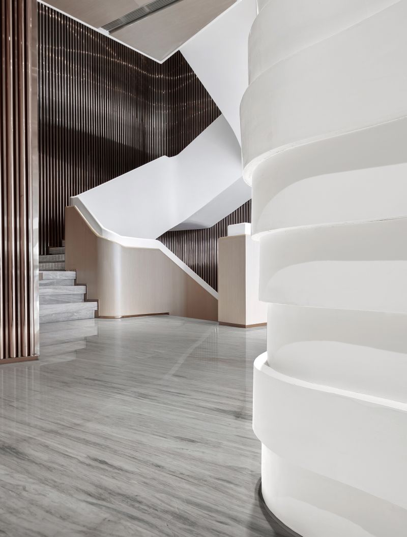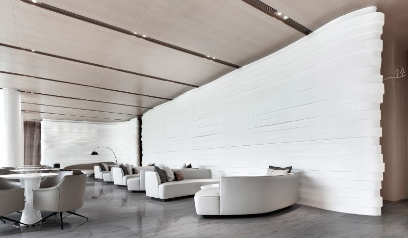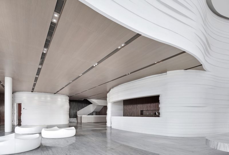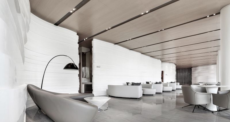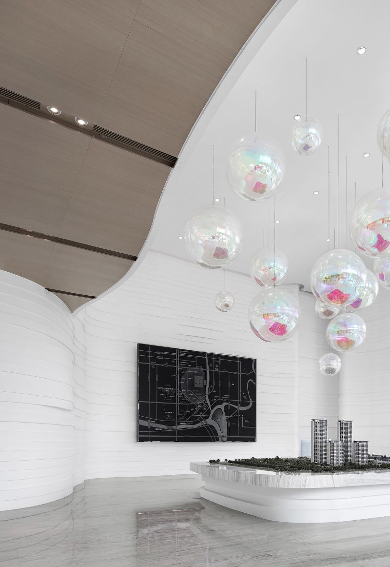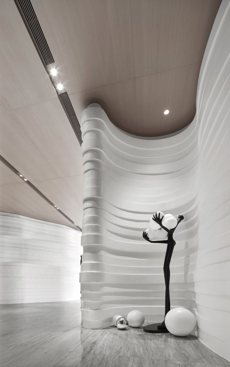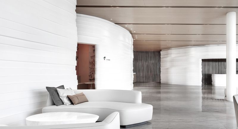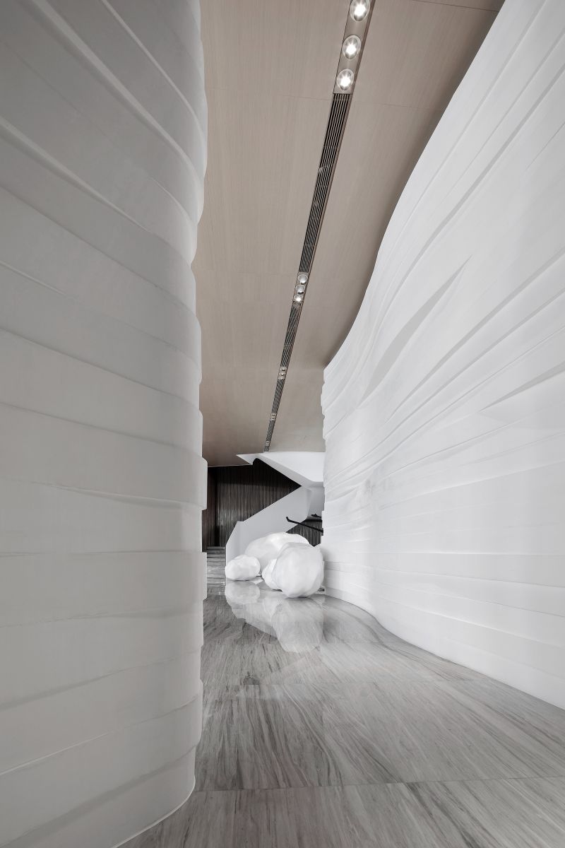 From the entrance, customer go through landscape pool. They could see the beginning of rhythmic line. Following the rhythmic line, the whole space is getting open, and reaches climax in the sand table area. Vertical metal line as the base of space, built the feeling of the ancient city. White rhythmic line enwinds around vertical metal lines, expressing the concept "rhythmic ancient city". Architecture, landscape and soft outfit are also harmonious with the interior space, which all have curved shape.