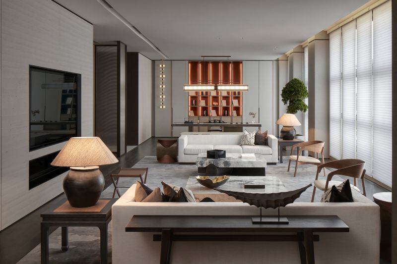 We hope to present a dynamic, graceful and unique oriental style in this urban living room, which not only looks graceful and but also stately.