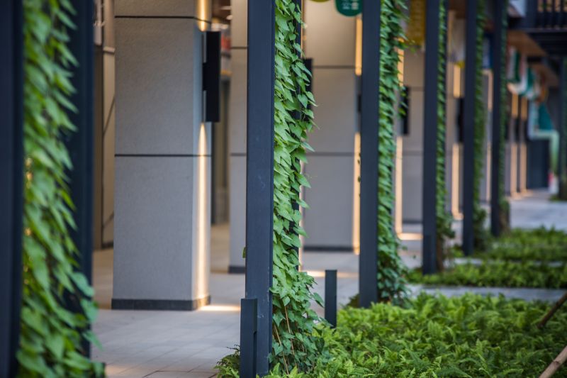 The six buildings constitute the central axis of the park. As the public corridors connect the buildings, the plants integrate the varied functions of offices, gymnasium, restaurant, and exhibition into a sylvan environment for working.