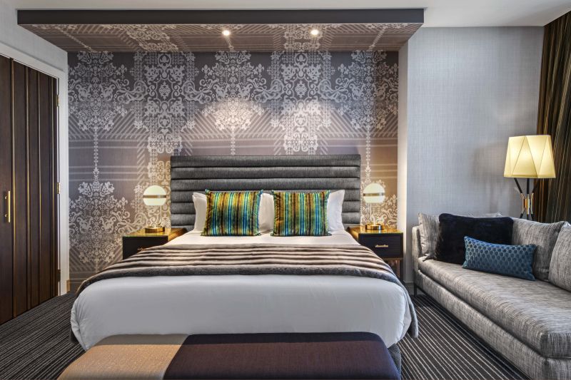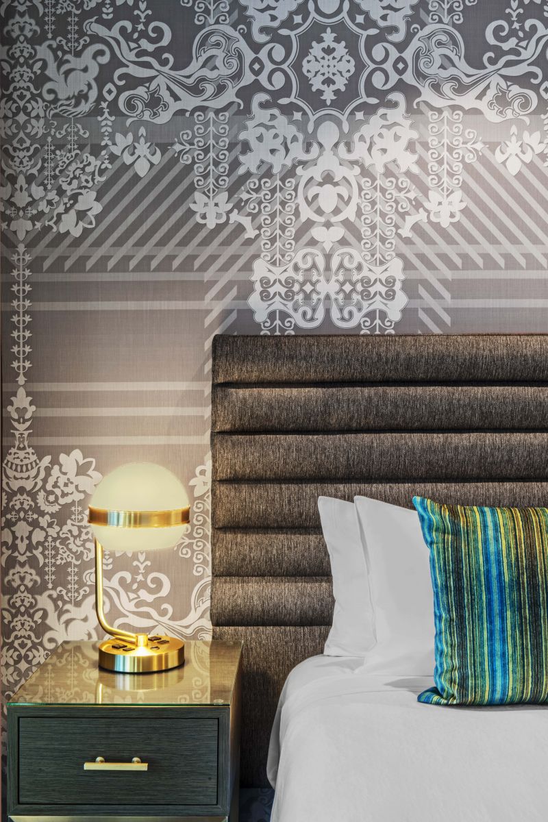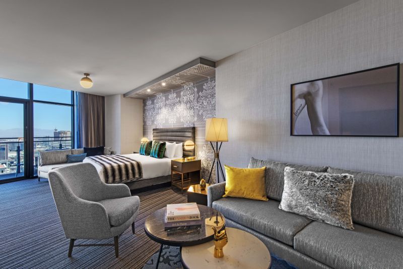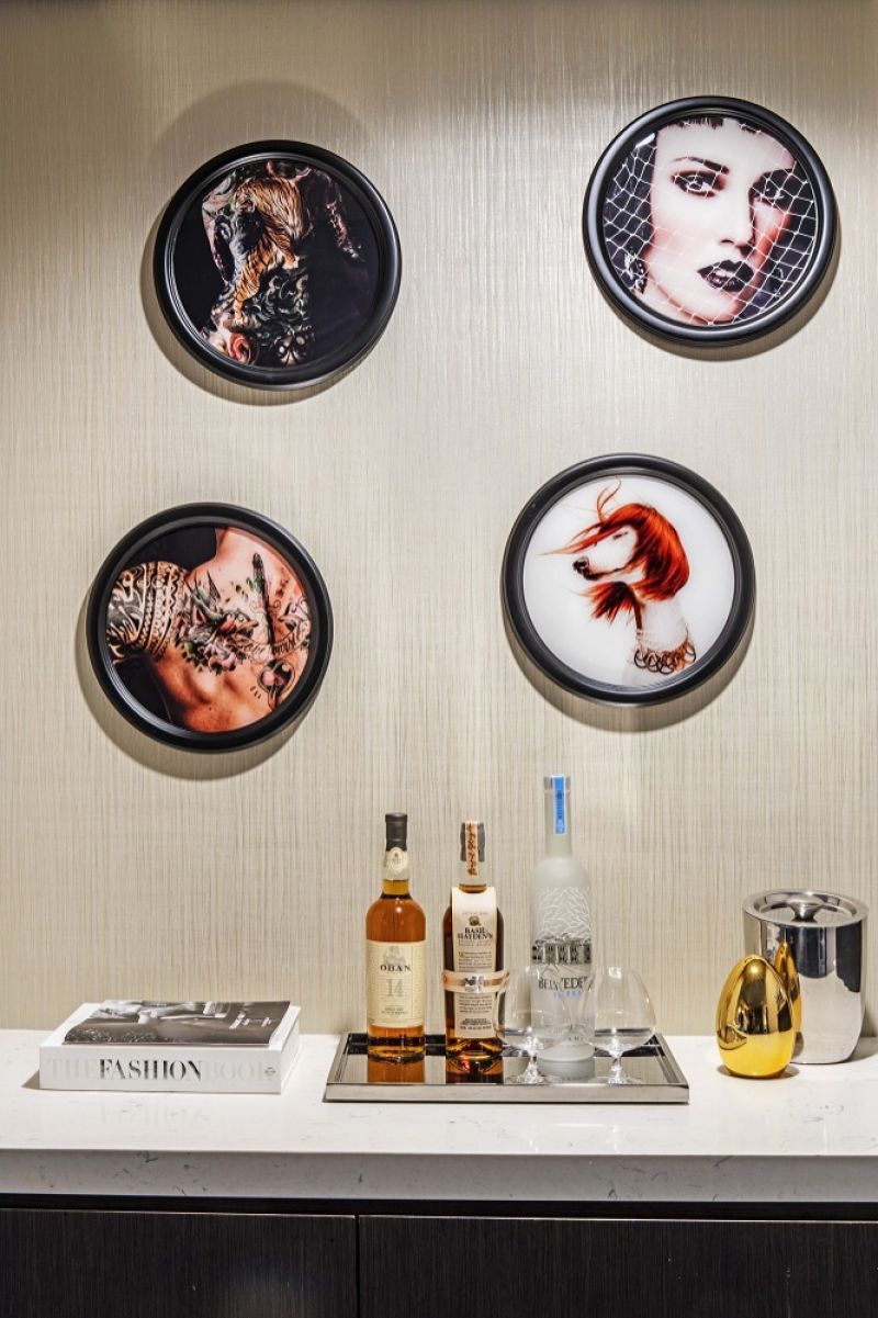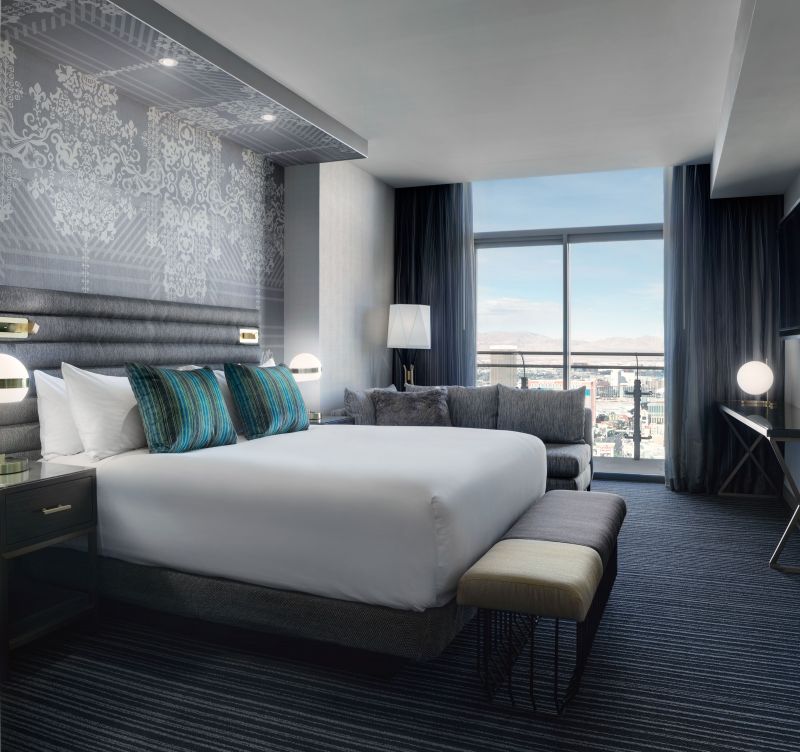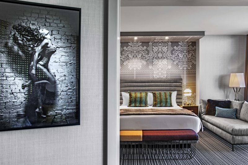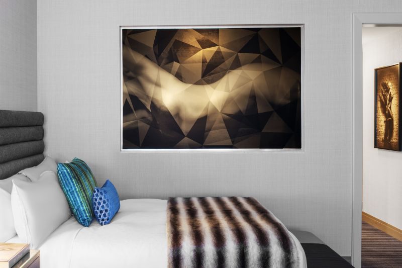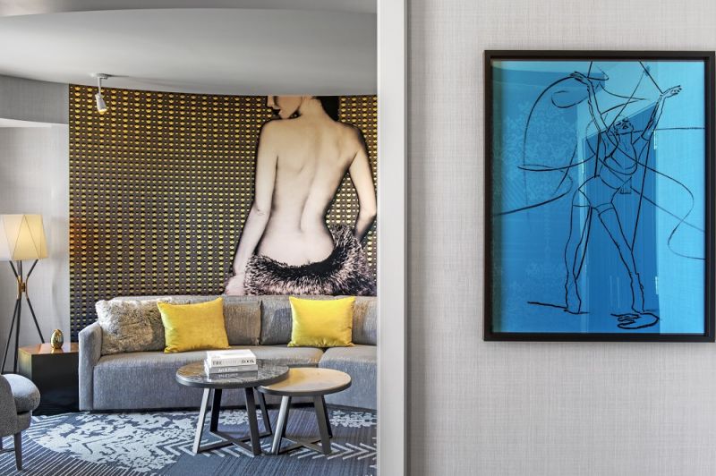 The concept was our take on The Cosmopolitan’s slogan, "Just the Right Amount of Wrong." We wanted to re-energize the design and set the hotel apart from all others on the Vegas Strip by keeping its mystique and drama. The focus was on the artwork in the spaces, featuring theatre stage players who introduce ideas to guests as to what the hotel's slogan could mean, playing to their fantasies while leaving them open to interpretation. We implemented numerous special techniques to bring edge and sophistication to the art, which elevated the rooms and gave them depth and whimsy.