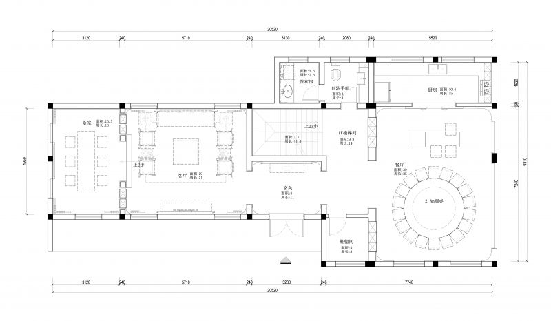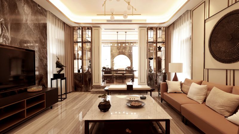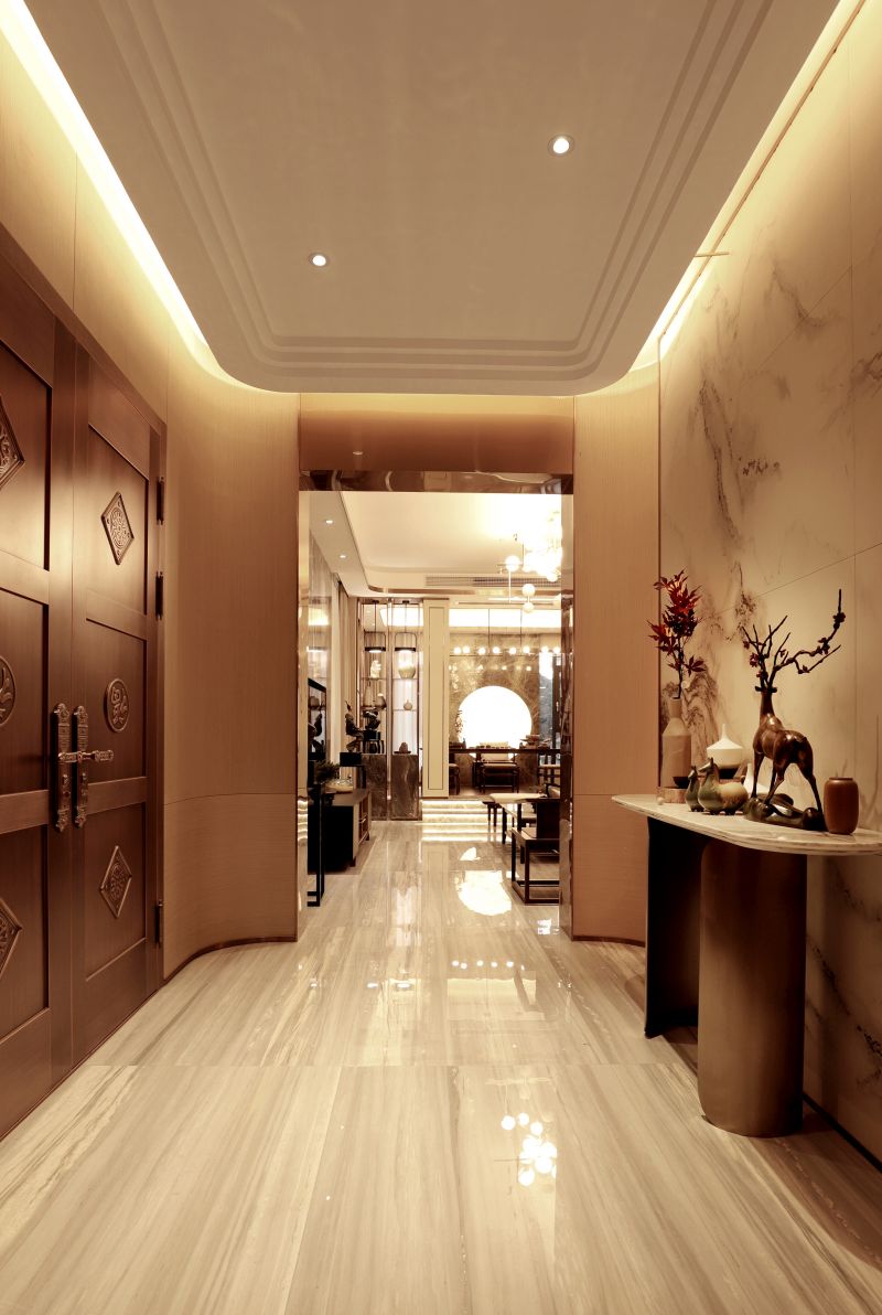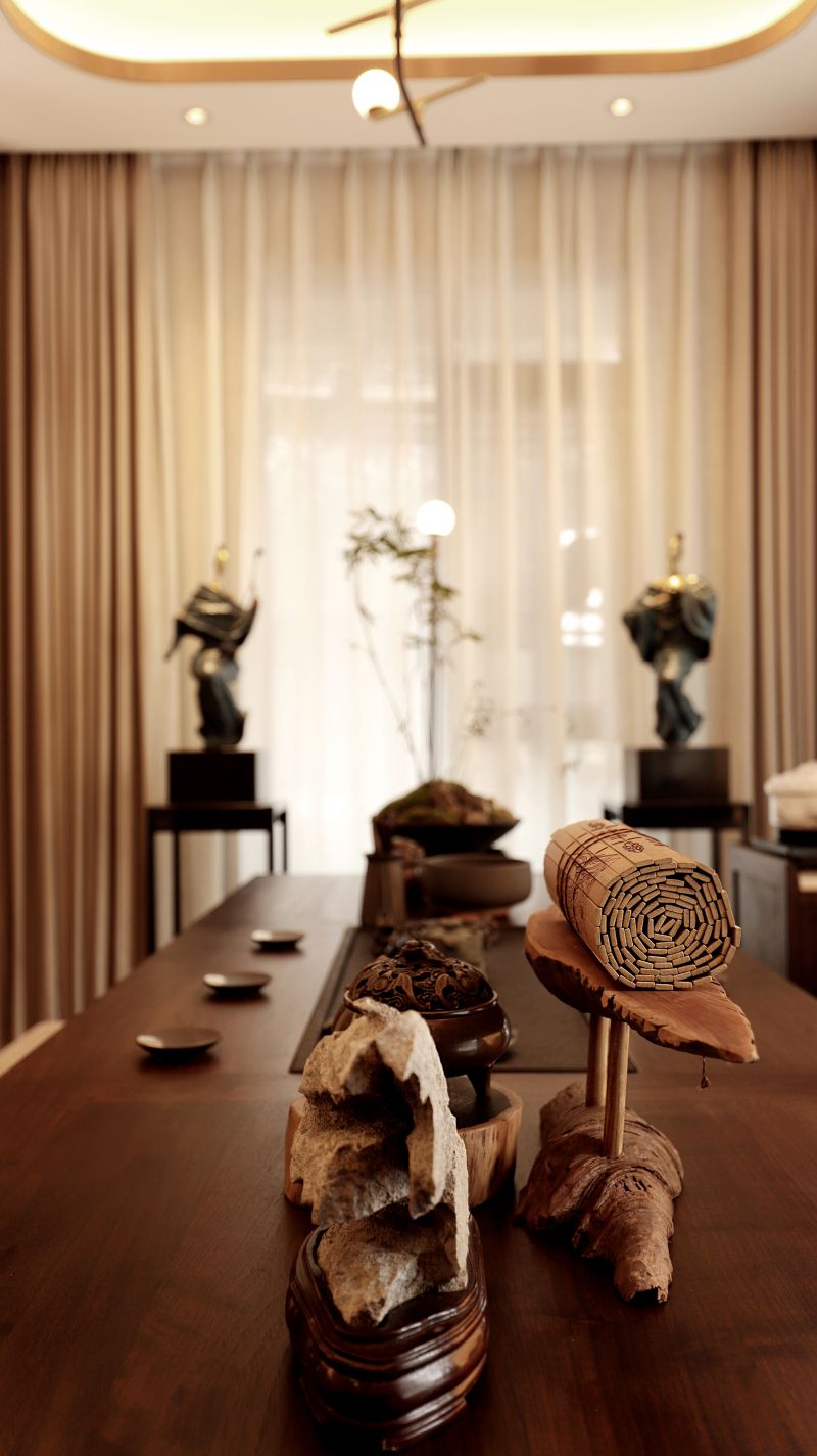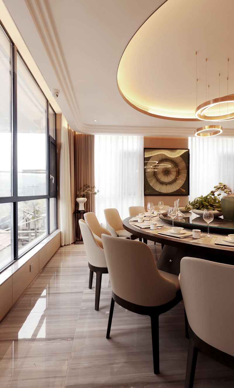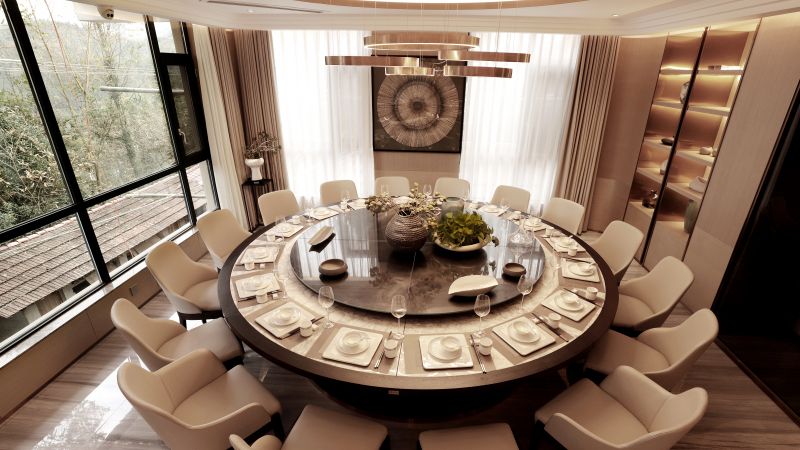 The space follows the traditional Chinese symmetrical layout, and the traditional cultural concept of "a round day and a round place" permeates into every inch of space. The round table carries the implication that the whole family will be reunited and complete during the meal.