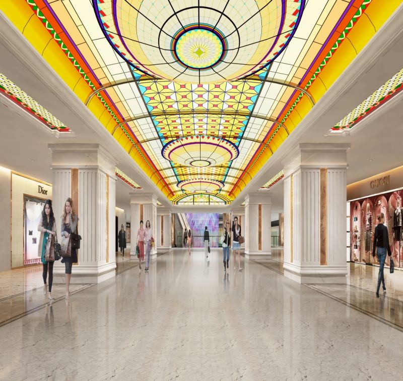 The stained glass of the ceiling presents a visually intertwined beauty with the help of a rich color gradation, like a rose blooming with gentle charm