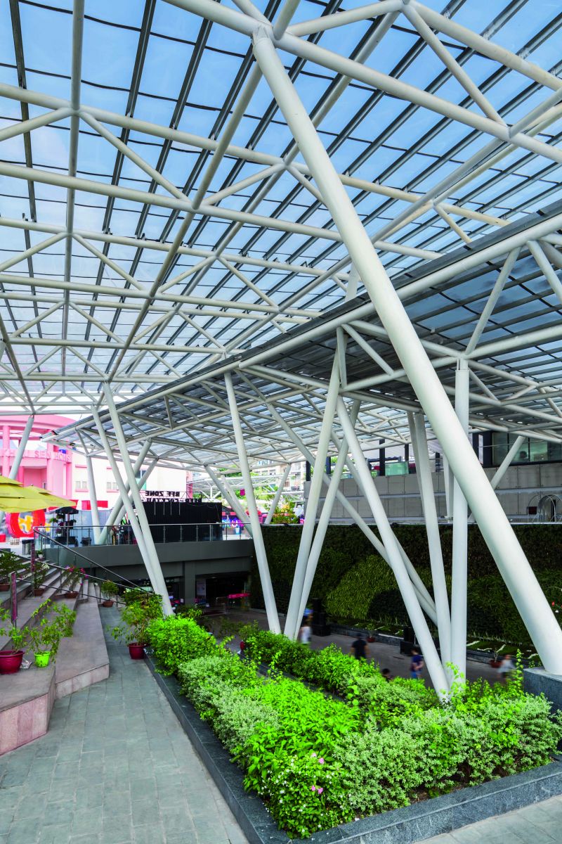 The translucent roof construction is visually stimulating and allows for an activation of the square all year round – it lets enough light through to the lower floors, offers shade from the sun and safety from the heavy monsoon rains.