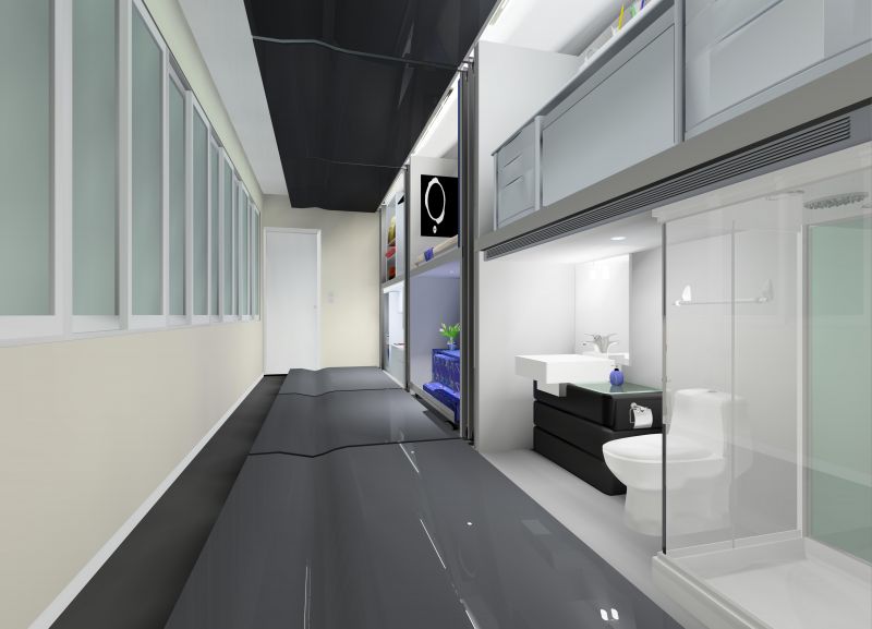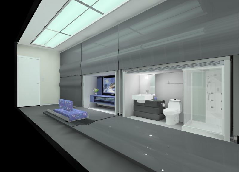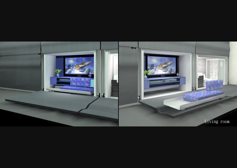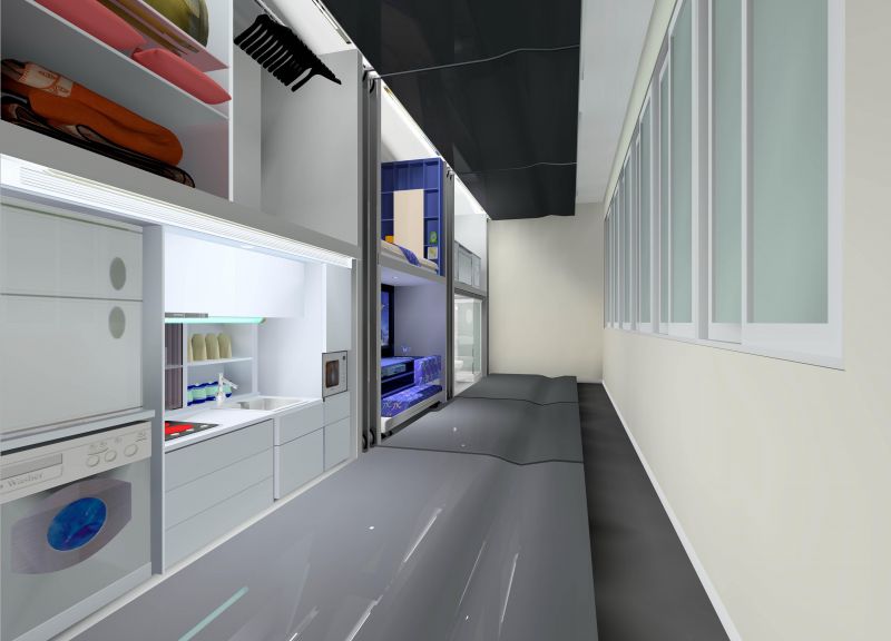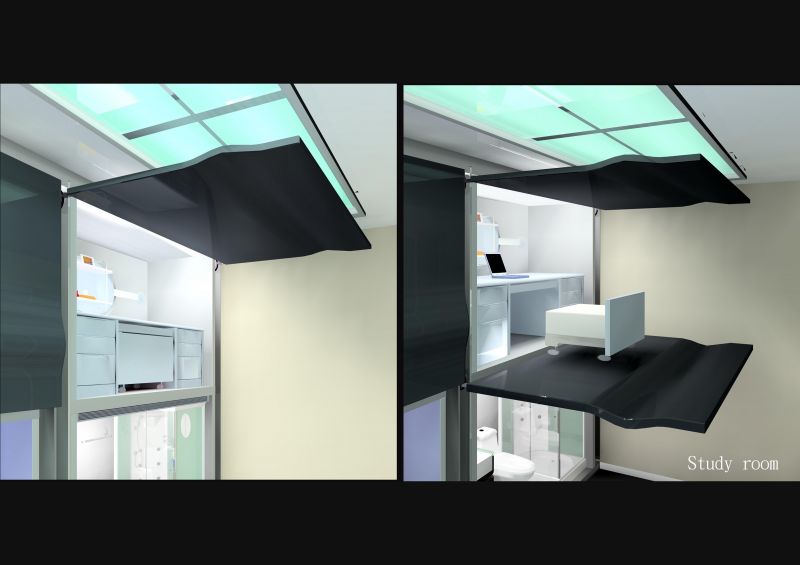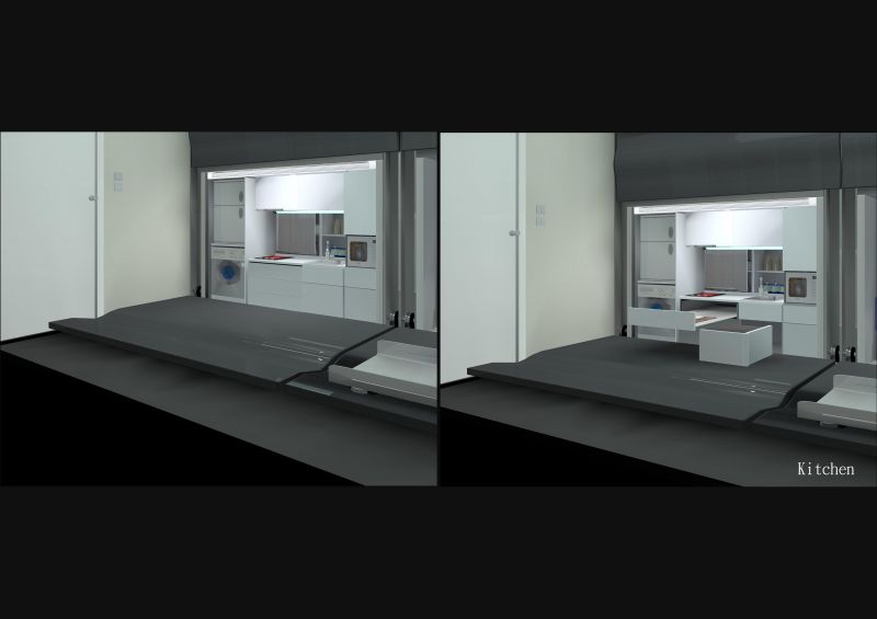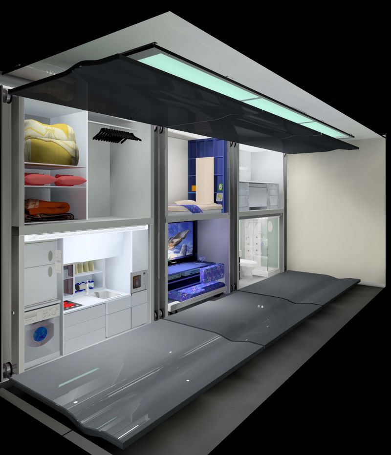 This room is designed with 6 containers which divided different living areas. The lower part is the kitchen with dining area, the living area and the bathroom. The upper part is the cloakroom, sleeping area and workplace. Each part of the room can be used independently. When you want to use the lower region & upper region, you only need to pull down the doors.