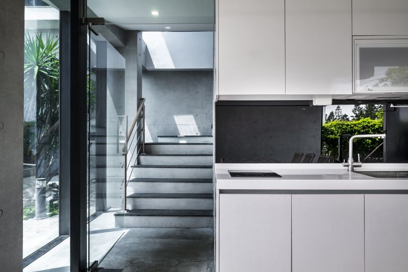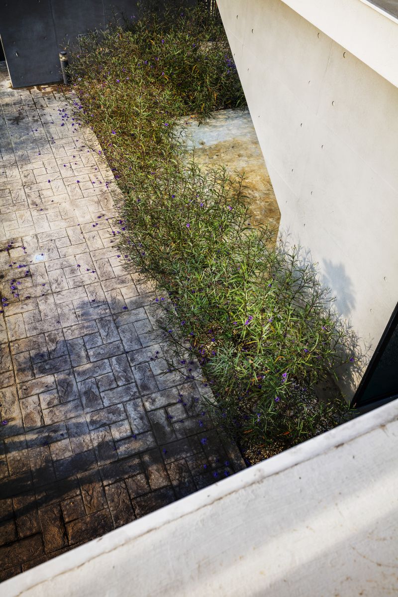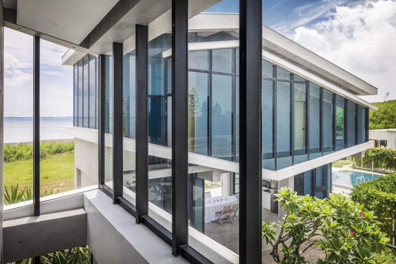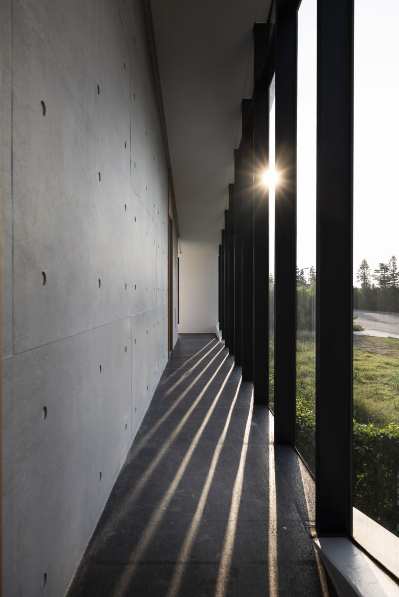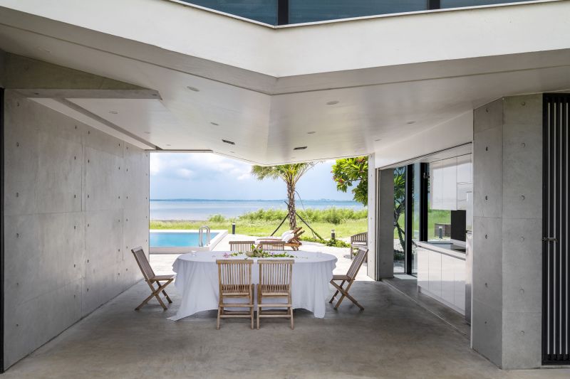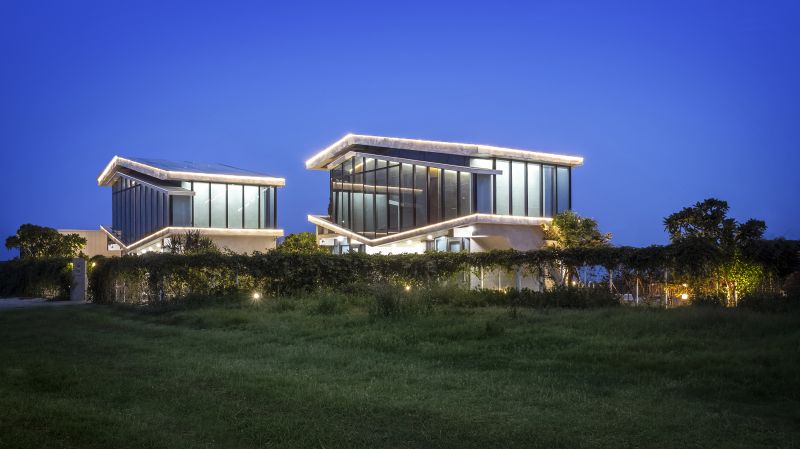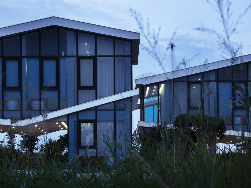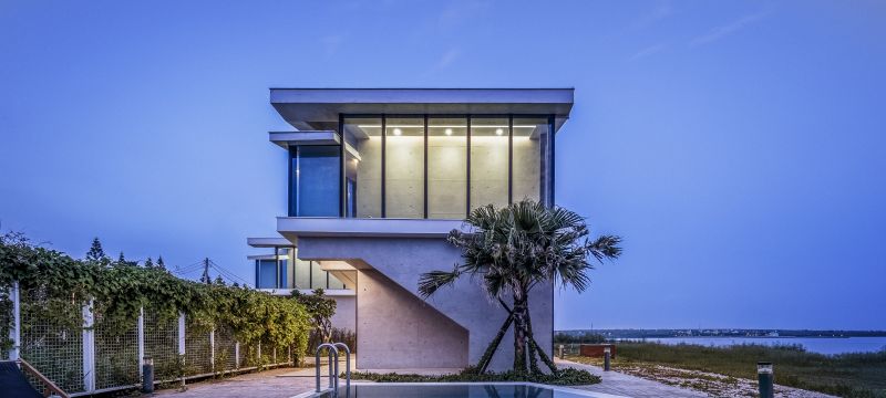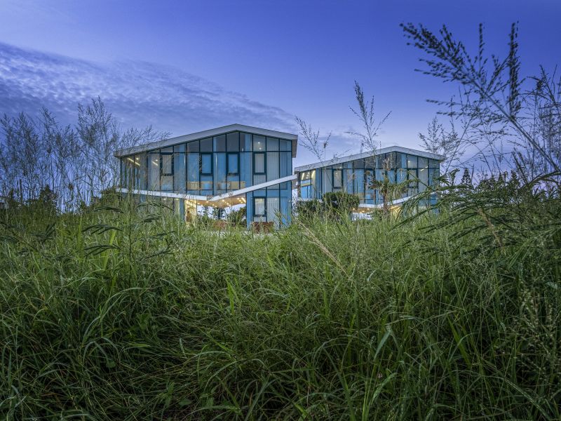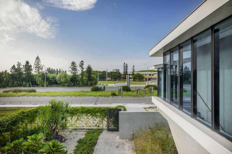 The building is aligned with the linear hinterland between the coast and roadway, forming three parallel edges that accommodate the coastal topography and the greenery. The metaphorical dialogues between the land and the sea open up the privacy of living and dining rooms. The surging surfaces of blue and white embody the undulating sea and wave. Here humans and architecture merge into the environment and become part of the seaboard. People enjoy the airy, translucent spaces nestled in the interstices between the diagonal formation and greenery taken from the idea of the waves.