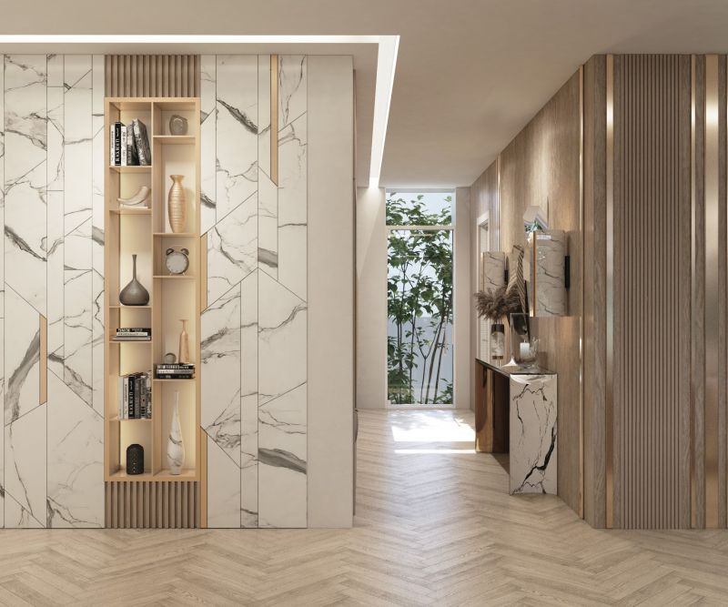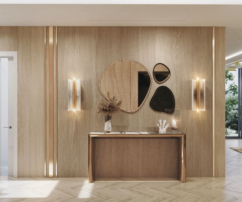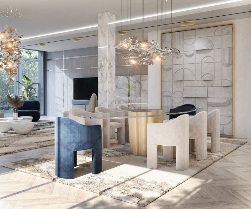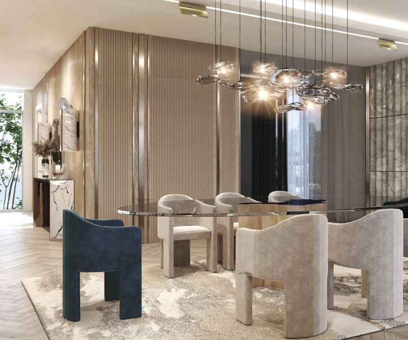 Many elements, such as dining table, wall panels, decorative wall art, have particular motifs and are made from quality and noble materials.