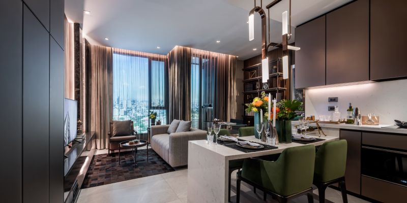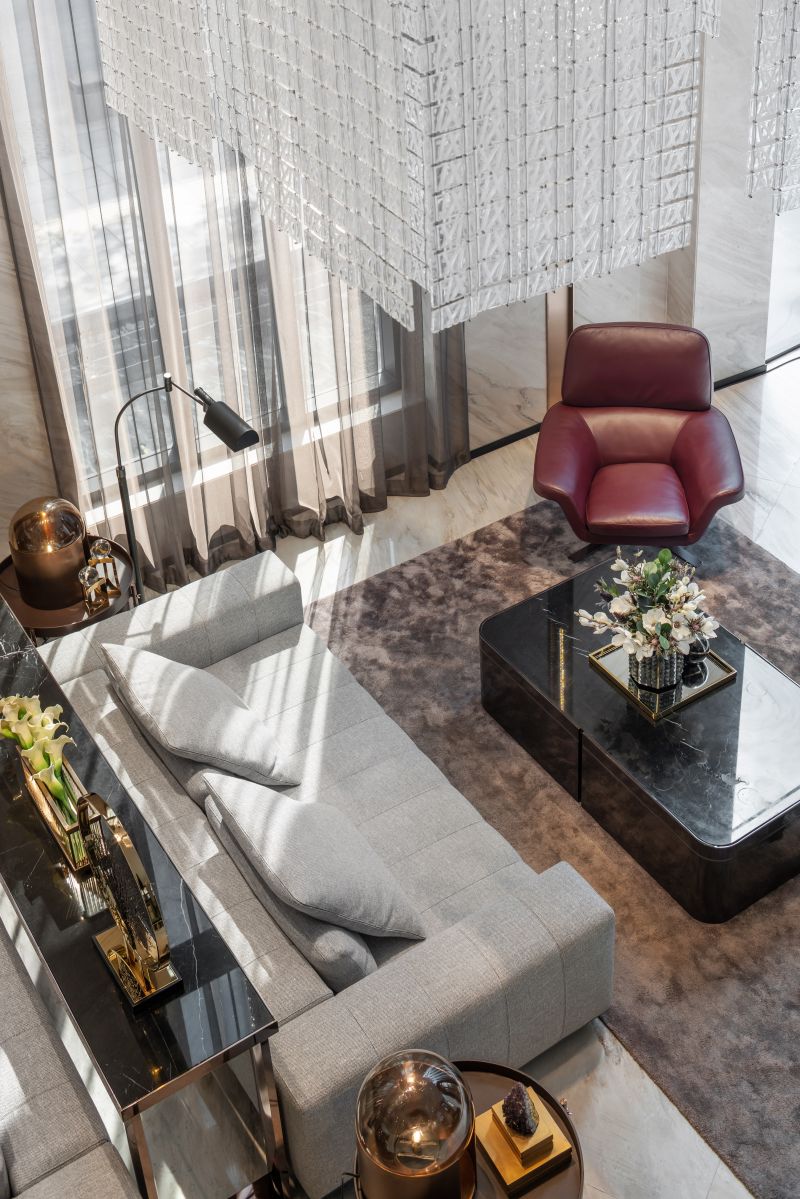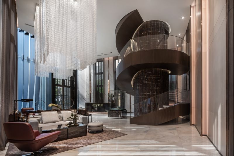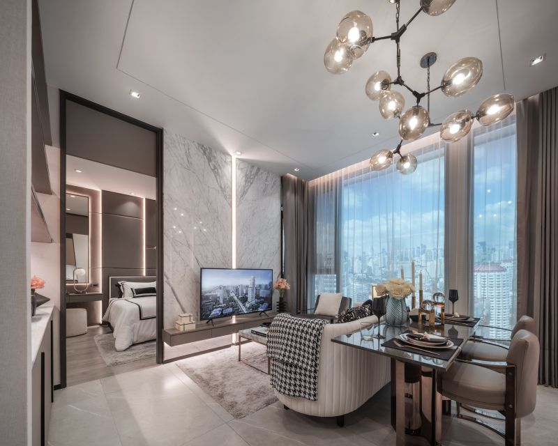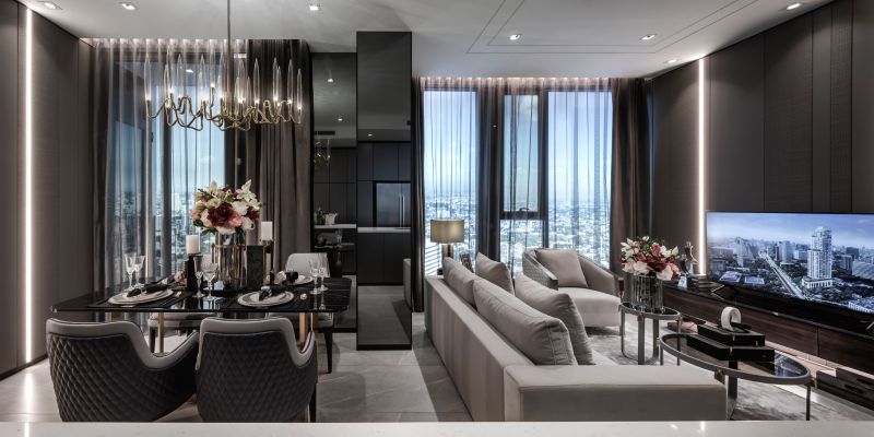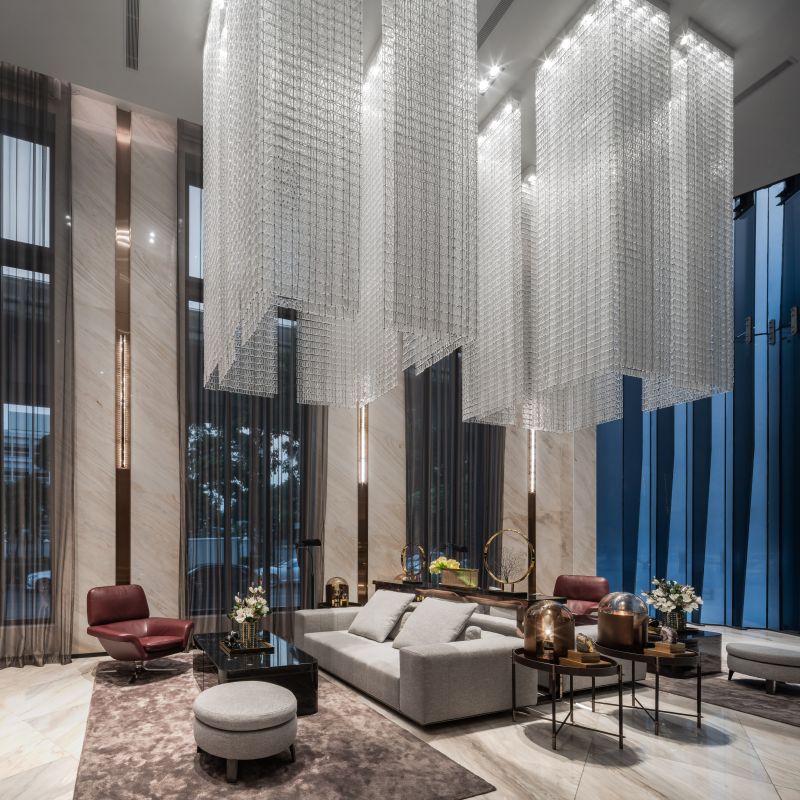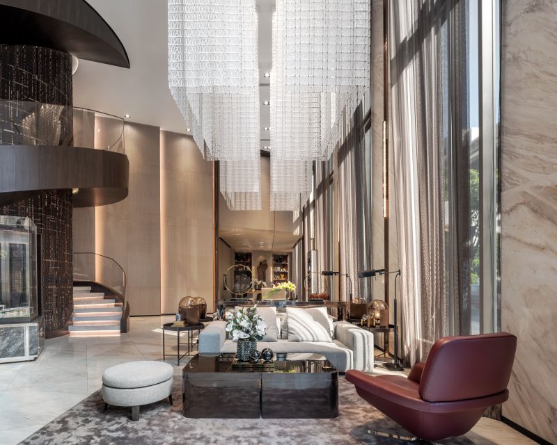 THIS SALES GALLERY AND SHOW UNITS ARE THE SHOWCASE OF THE PRESTIGIOUS DEVELOPMENT LOCATED IN THE MOST SOPHISTICATED AREA IN BANGKOK. THE OVERALL DESIGN IS UNDERSTATED WITH A TOUCH OF ART AND CRAFT IN DETAILS, FURNITURE AND ELEMENTS TO ENSURE THAT THE BEST QUALITY HOME WILL BE DELIVERED AND PASS THIS LUXURIOUS HERITAGE THROUGH GENERATIONS. . ALL MATERIALS AND FINISHES ARE THE FINEST QUALITY. A 12-METER HIGH HAND WOVEN LEATHER AND BRONZE STAINLESS STEEL STRIPS WHICH SPECIALLY DESIGNED EXCLUSIVELY FOR THIS PROJECT WRAPPING AROUND THE LIFT CORE IS ONE THE MAIN ART & CRAFT ELEMENTS IN THE LOBBY.