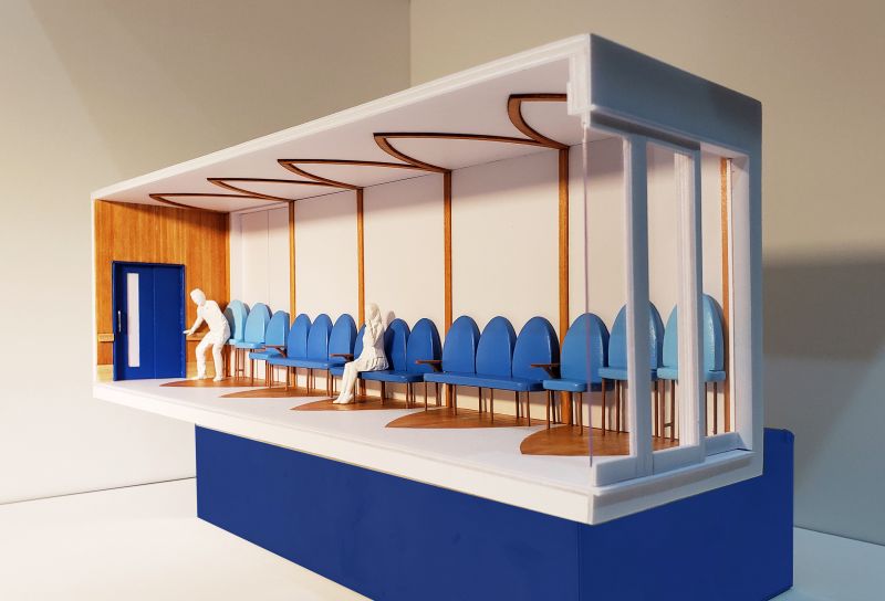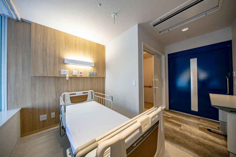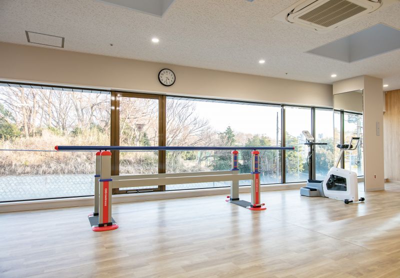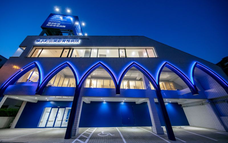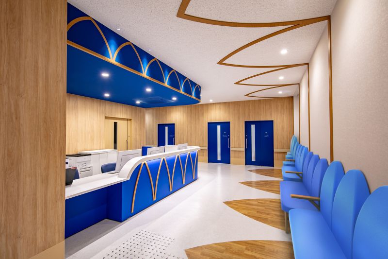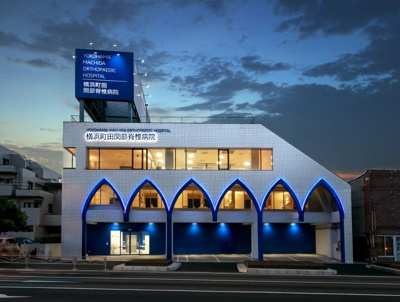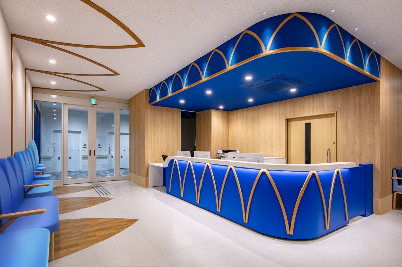 Patients experiencing joint pain often face challenges in finding comfortable sitting positions. To accommodate patients' individual needs, such as body size, posture, and symptoms, we designed chairs of variable height and depth. Additionally, when converting the building (which was formerly used as a showroom for automobiles) we retained the existing arch patterns, which resemble vertebrae. The shade of blue used here is the hospital's signature color.