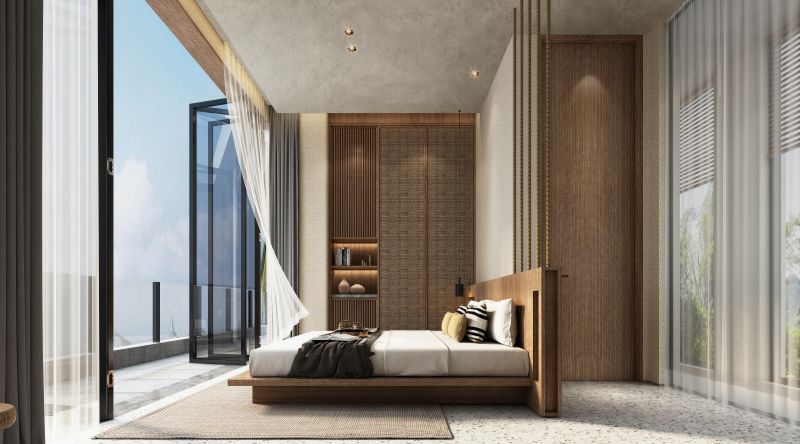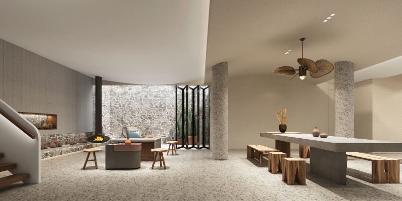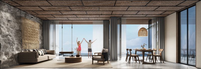The designer's childhood was spent in the seaside fishing village, so he reinterpreted his childhood in this seaside villa - fishing nets, oars and grandmother. Childhood is a return, is a kind of primitive, simple simplicity, is the fierce waves beat on the beach and faded white waves. The living room is full of French windows facing the sea, and the interior design will retain the complete large space, only highlighting the original and wild in the wall and ceiling. The irregular stone walls and rattan plaited ceiling vividly depict the primitive and natural features of fishermen on the seas