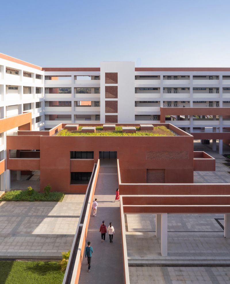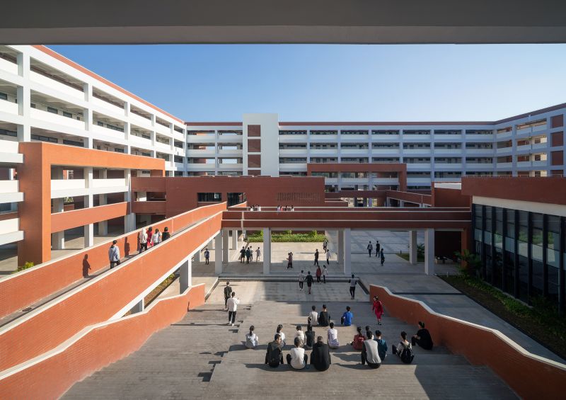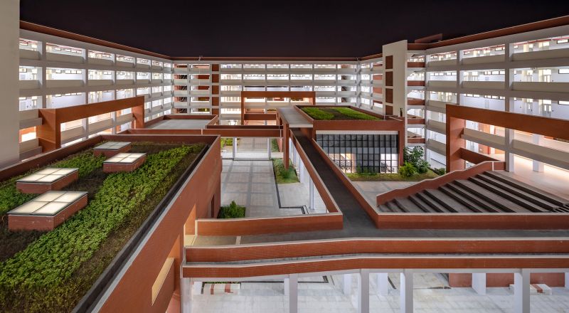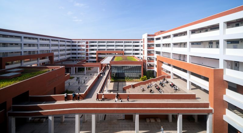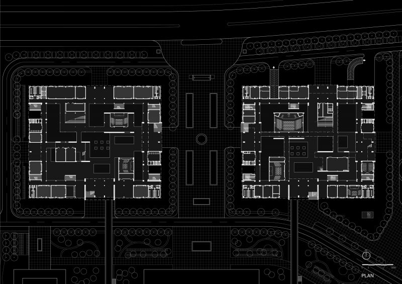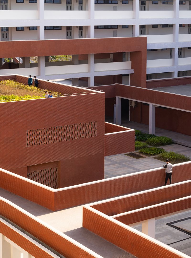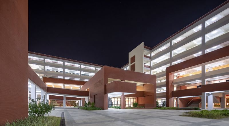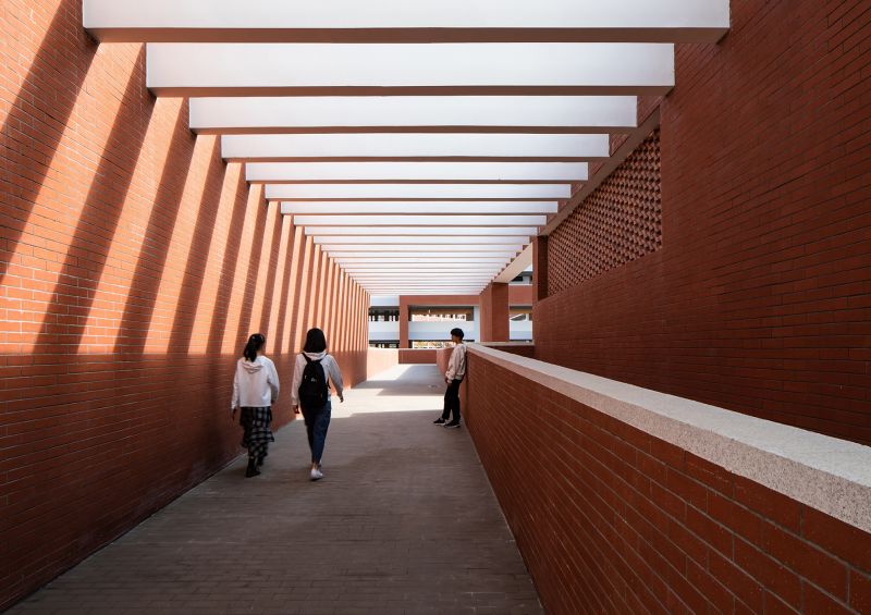 Teaching Block A&B are the biggest twin buildings in the Jinjiang Campus. The entire campus plan was inspired by the "Red Brick Cuo Village" preserved from Ming Dynasty, which is constructed in a unique way with white stone embedded in red brick wall. Instead of setting up 12 separated buildings, we integrated various modules into two micro villages with united courtyards, linking all departments to share all teaching resources. The integrated teaching blocks not only save land for the campus, but also connect different schools together to encourage interdisciplinary exchange and research.