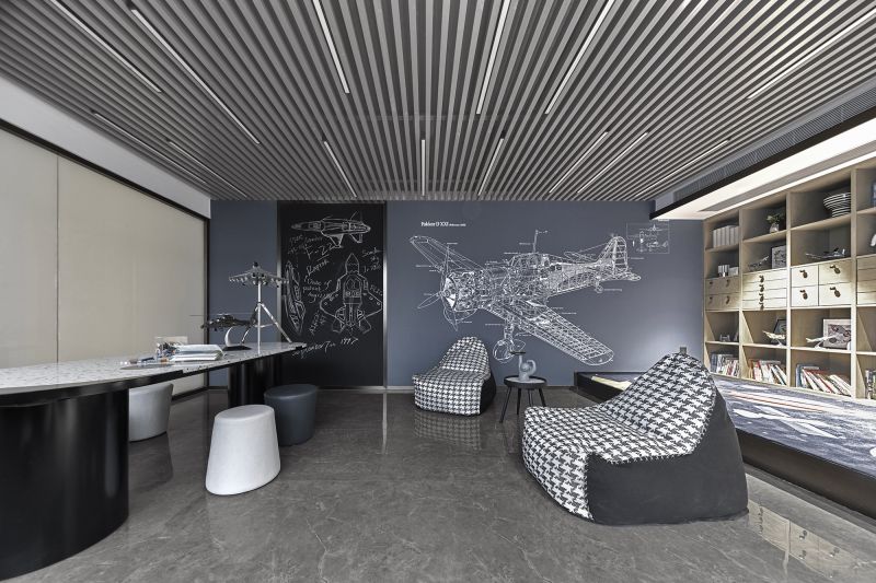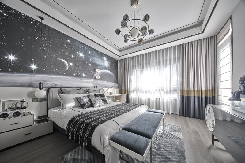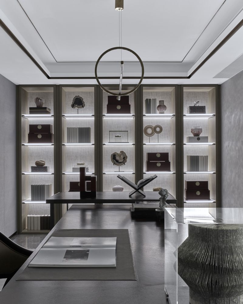 The master bedroom is elegant, calming and peaceful. The French window brightens the space. The walls are clad in large white marbles featuring dynamic grain, which echoes the marble walls in the living room. With a flexible form, the pendent lighting fixture emits star-like lights. The study room is a semi-open space, which is set right above the family activity area.