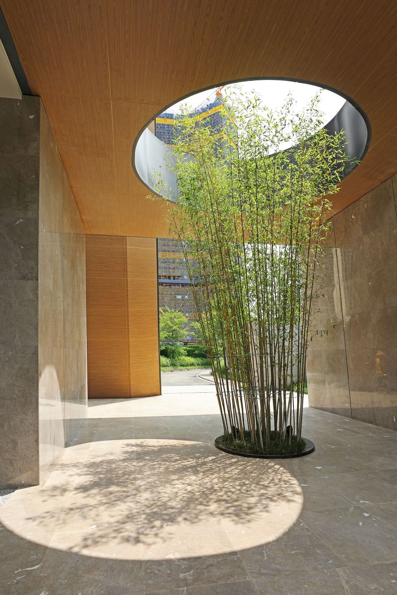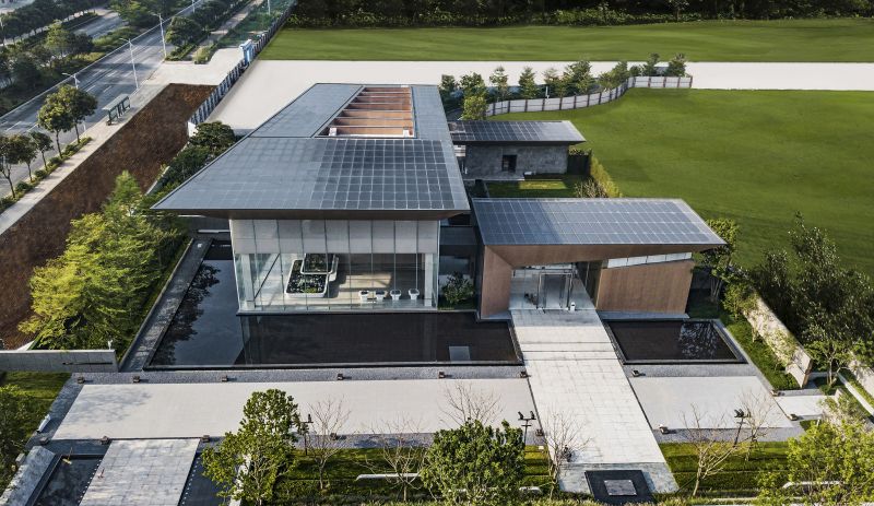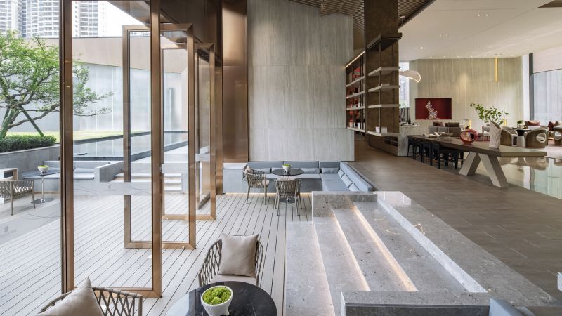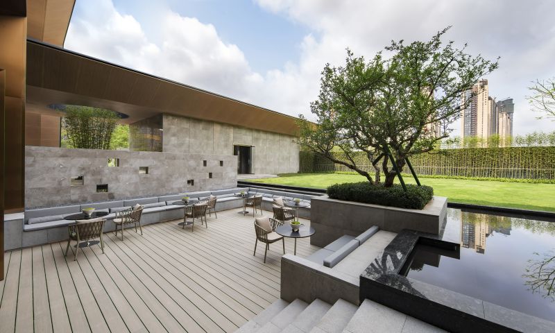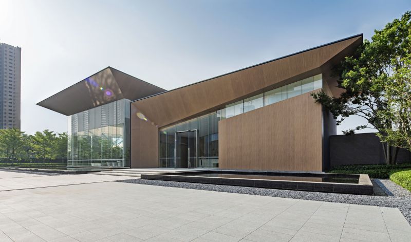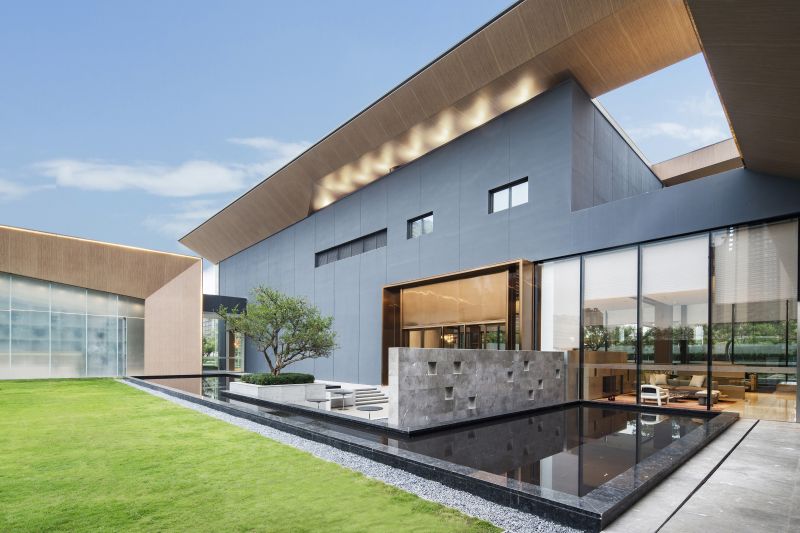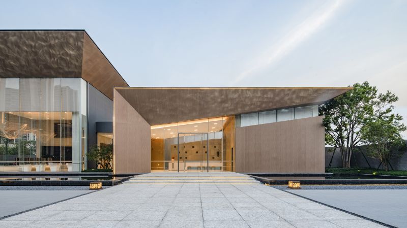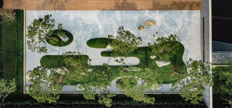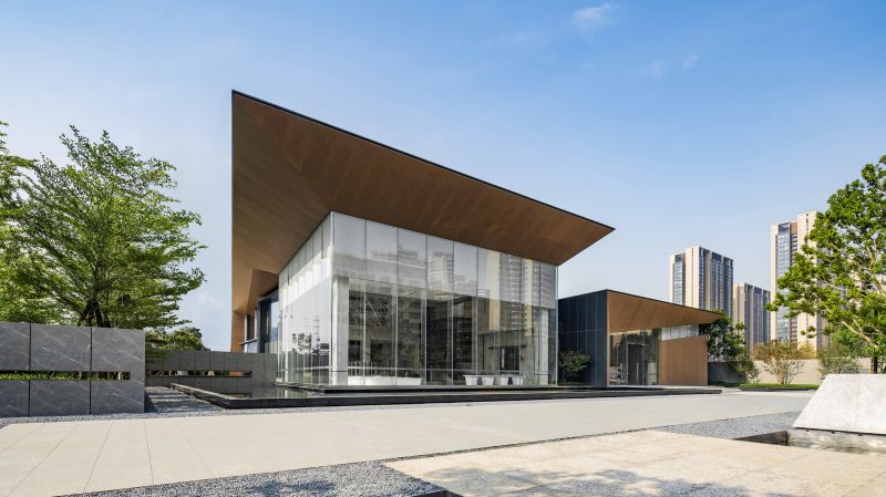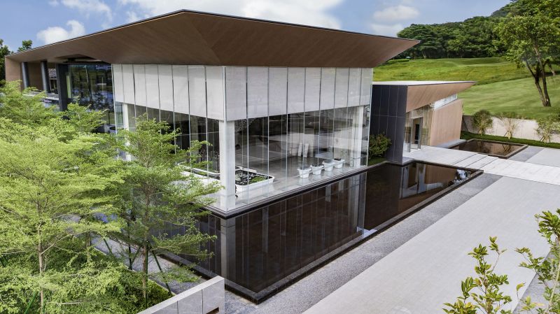 The designers utilized the minimalist architectural design concept to create a Chinese style building. A transparent “glass box” realizes the natural transition between architecture and environment. The spatial layout takes cues from classic Chinese courtyard residence, which enjoys different views at every step and layered arrangement of landscape. Warm wood and grey and white stone materials set a calm tone for the spacious interior space.