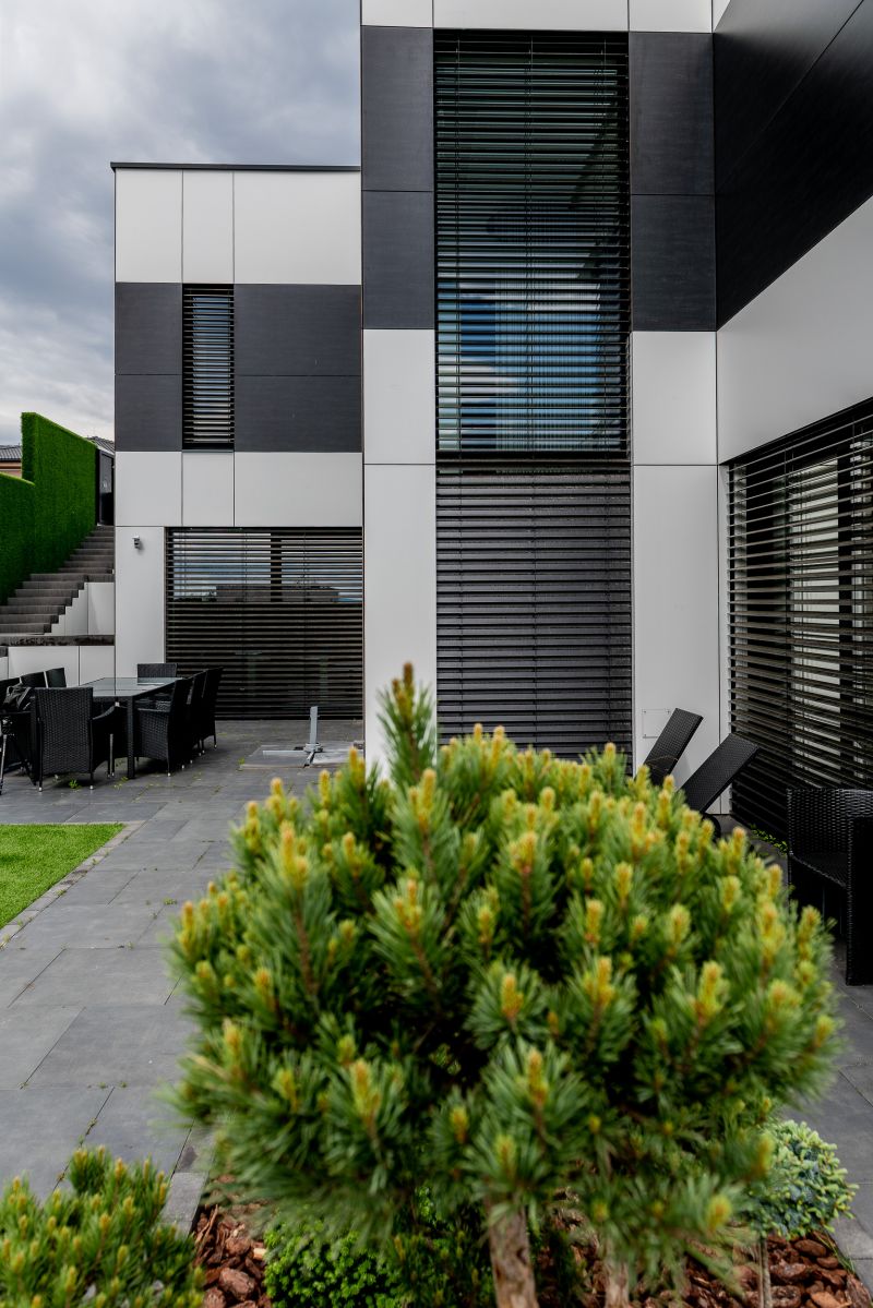 The completed project of Black and White villa near Košice was conceived as an idea of above-standard family housing in sloping terrain. The challenge was to incorporate the design into the steep slope of a new site in the Mecca of the East satellite. The entrance and driveway to the family house is in the upper position from the adjacent street. The villa continues to spill over the next floor down the slope into the garden.