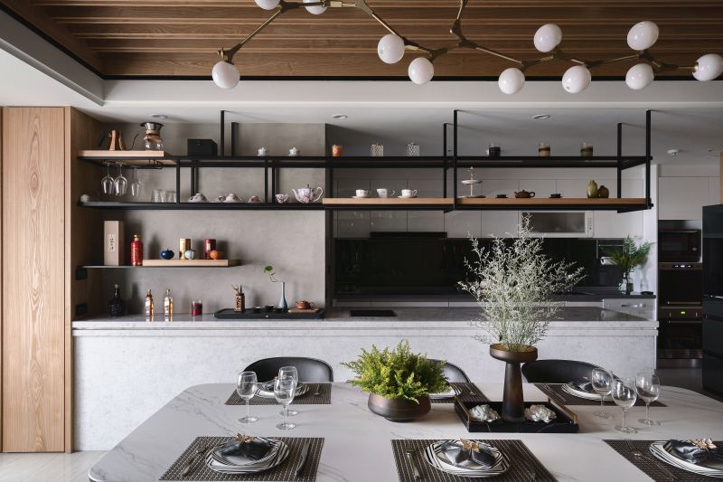 The homeowner who returns from the United States has a wish list of the dream house - a spacious public area, an open-pattern kitchen, and independent private spaces. Besides the required layout, set the TV wall to screen the entrances of the private areas, which artfully makes the public domain looks refined and stress-free. And then, makes use of wood to set the ceiling of uneven pattern, moreover, adopt the gray and black color schemes, successfully bring about the cozy yet distinguished ambiance of the humanistic mansion.
