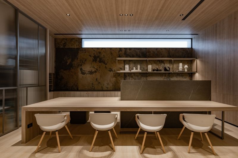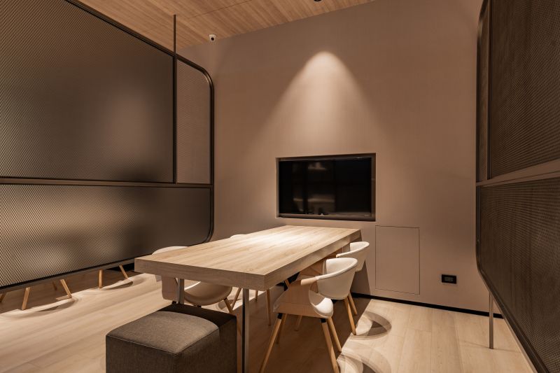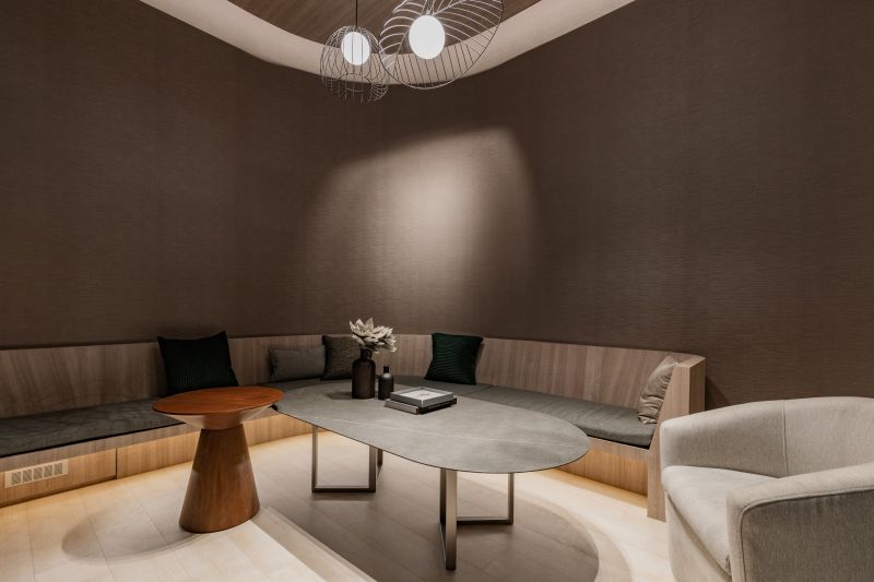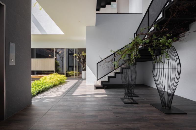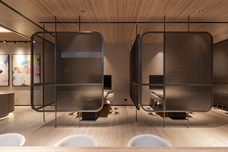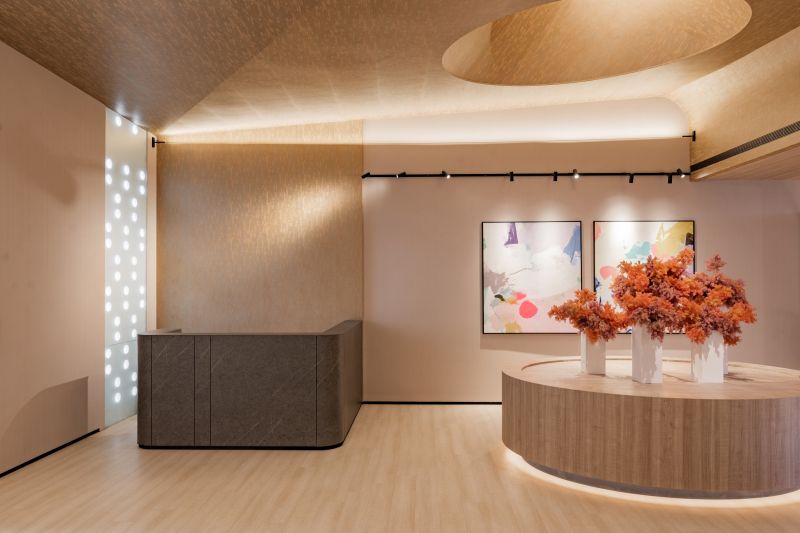 The circular lines and shape of the oval ceiling in the lobby greet visitors at first sight as they enter the building. The concave and convex curved design brought a refreshing visual effect to the office space. The patio design with a spacious atrium allowed the staff to have a respite from the busy schedule and contact with nature. The case replicated the relationship between the sun and the moon and light and darkness. The paradoxical concept allows curved lines and precise furniture placements to form beautiful layers of light and shadow that immensely enhance the surrounding's mood.