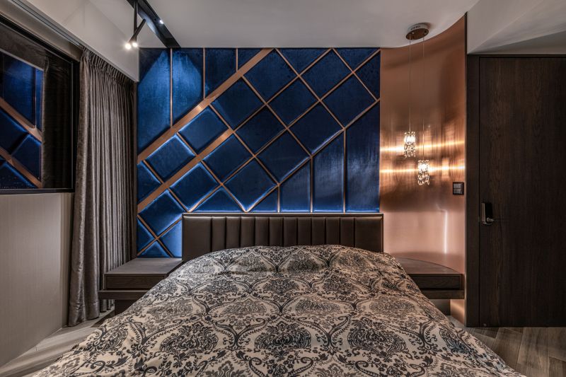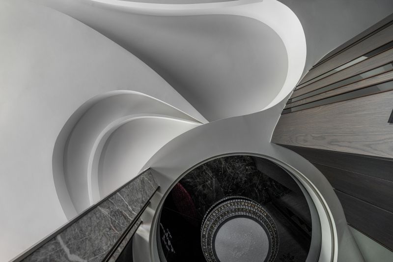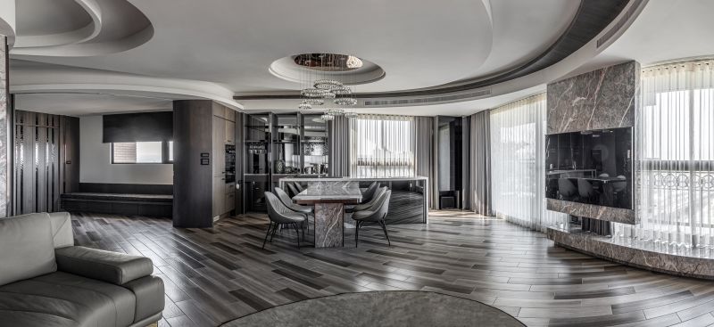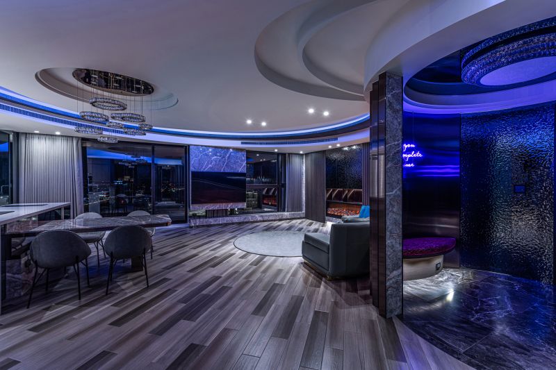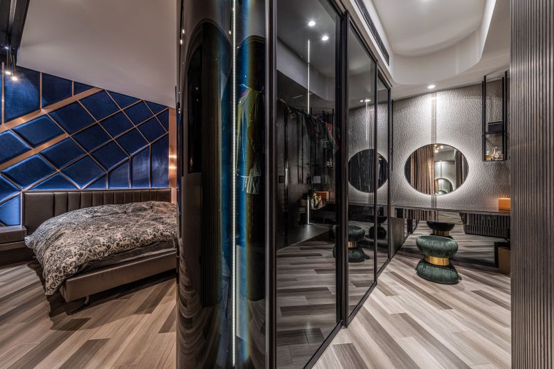 Groove comes from the rhythm, which includes the melody of high and low, strength and weakness, and the sense of rhythm that can make people relax, follow the vibe and flow of the music. In this apartment, the designer brings the rhythm of groove dance into the space with irregular curved lines, through the layered curved ceiling and sloping flooring pattern, creating a visual effect of groove in the space. Through lighting design and reflection of reflective materials, creating a natural and lively dance effect and bringing out a modern sense of style.