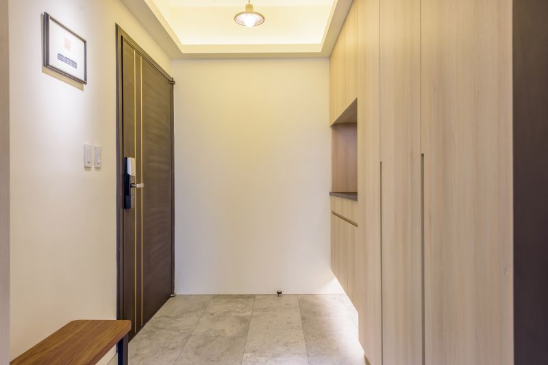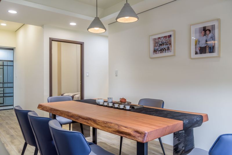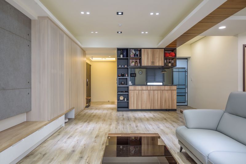 "To bring people to a state of peace of mind.” The project uses colors and materials to express Japanese tranquility, allowing people to feel the aesthetics and philosophy of the tea ceremony in the design. There is no excessive decoration, only the wood grain flooring conveys the theme. In the public area, the collection cabinet in the living room fully expresses the client's preference for art. The foyer and living room are decorated with different materials such as stone and wood grain, and the spacious living room is an eye-catching feature.