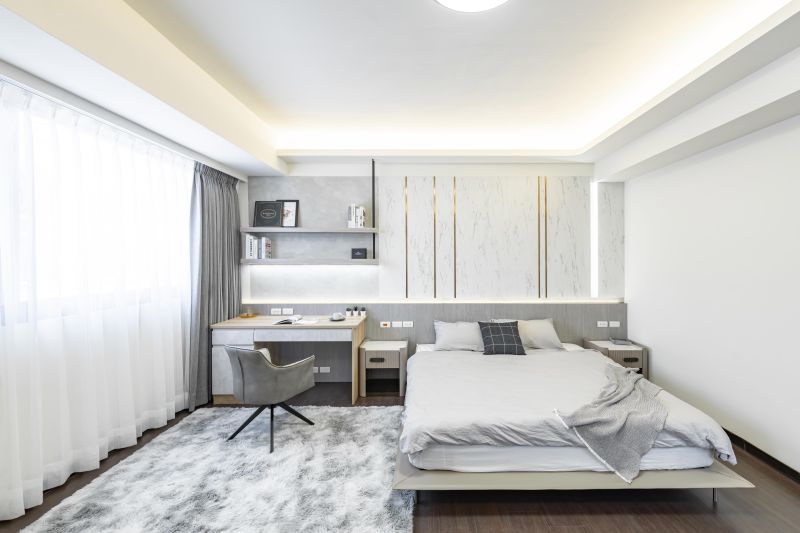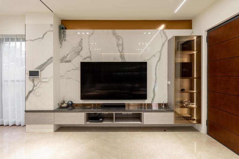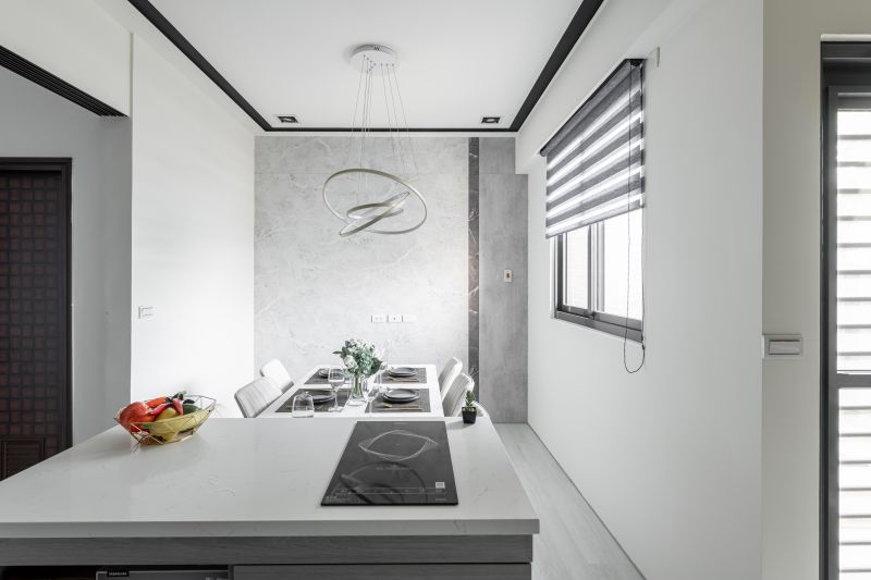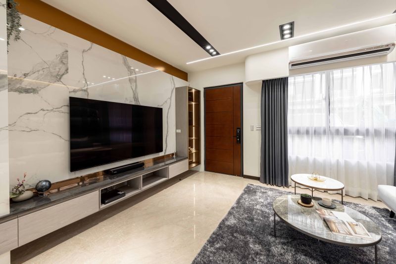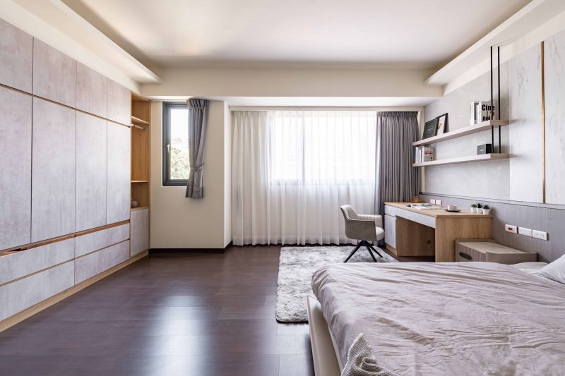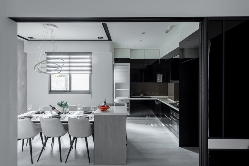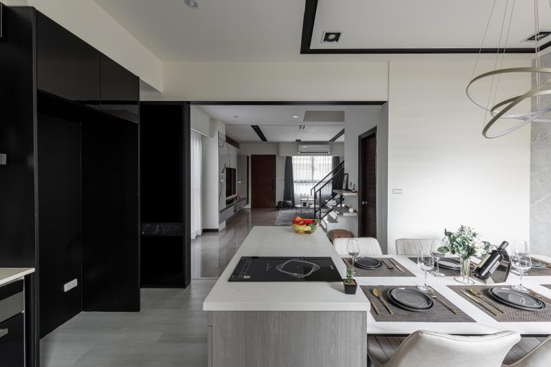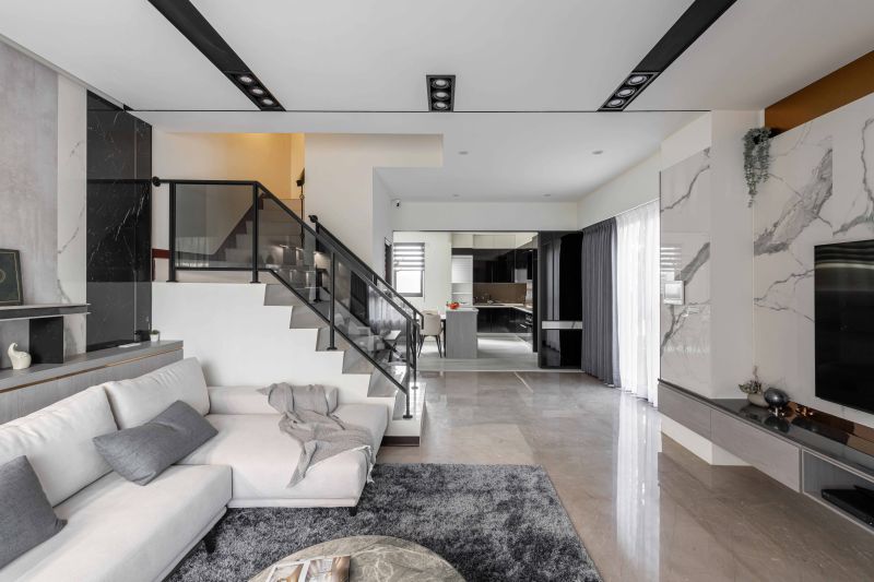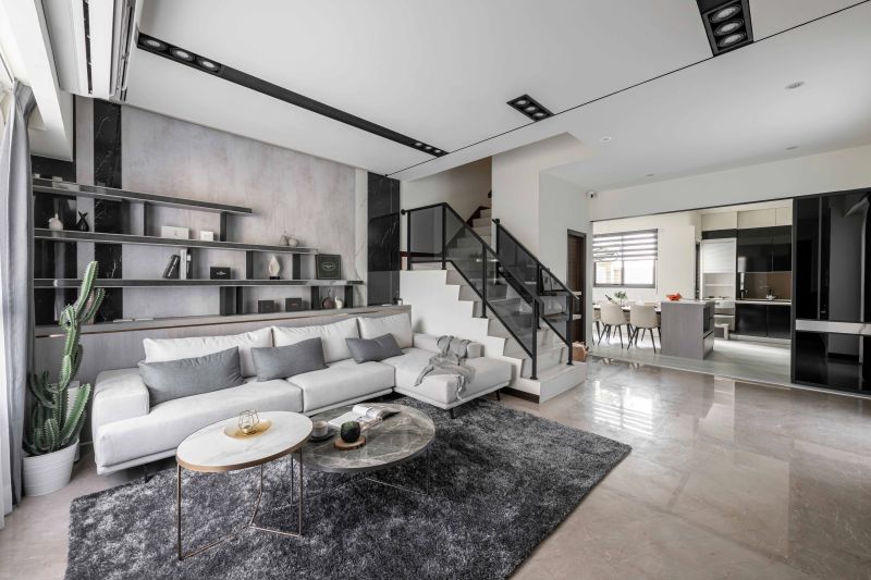 The ground floor is based mainly on the public domain shared by the family members, including the living room, the dining room, as well as the enlarged and combined kitchen area with the central island after removing one room. No standard separation is applied to the foyer by the entrance, but is rather directly incorporated into the living room area; the stairway by the sofa is replaced with grey glass railings for an even lighter and more open sense of vision.