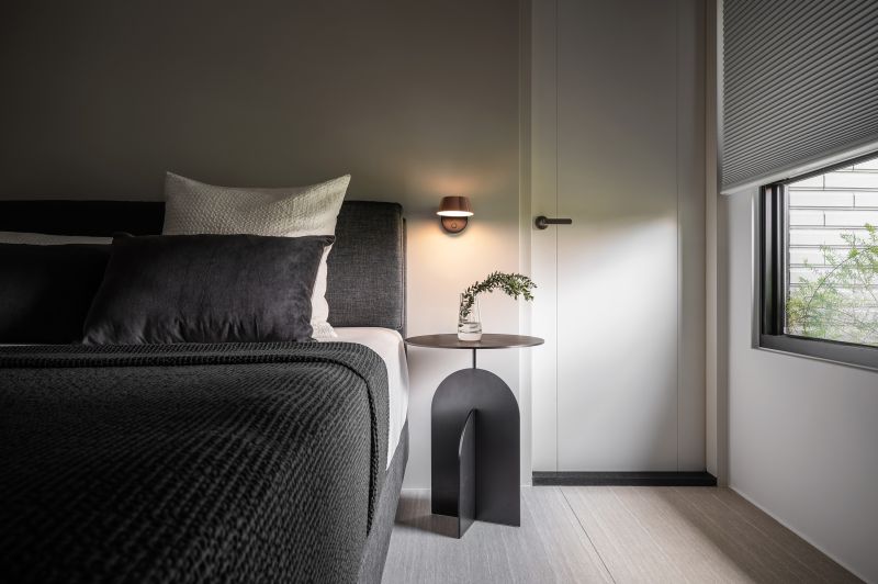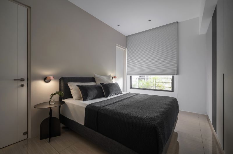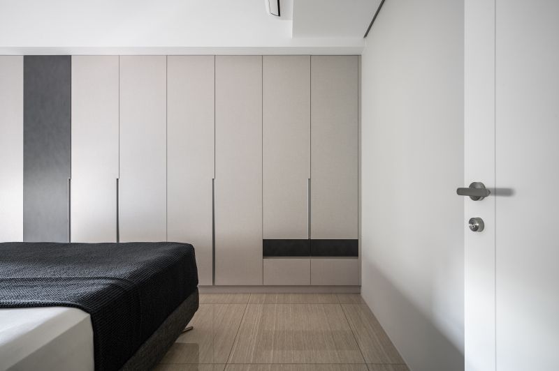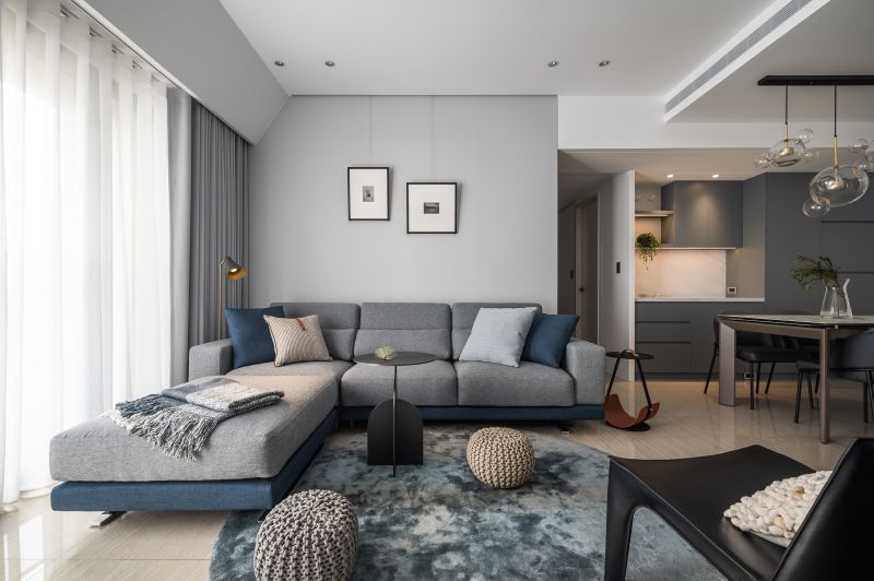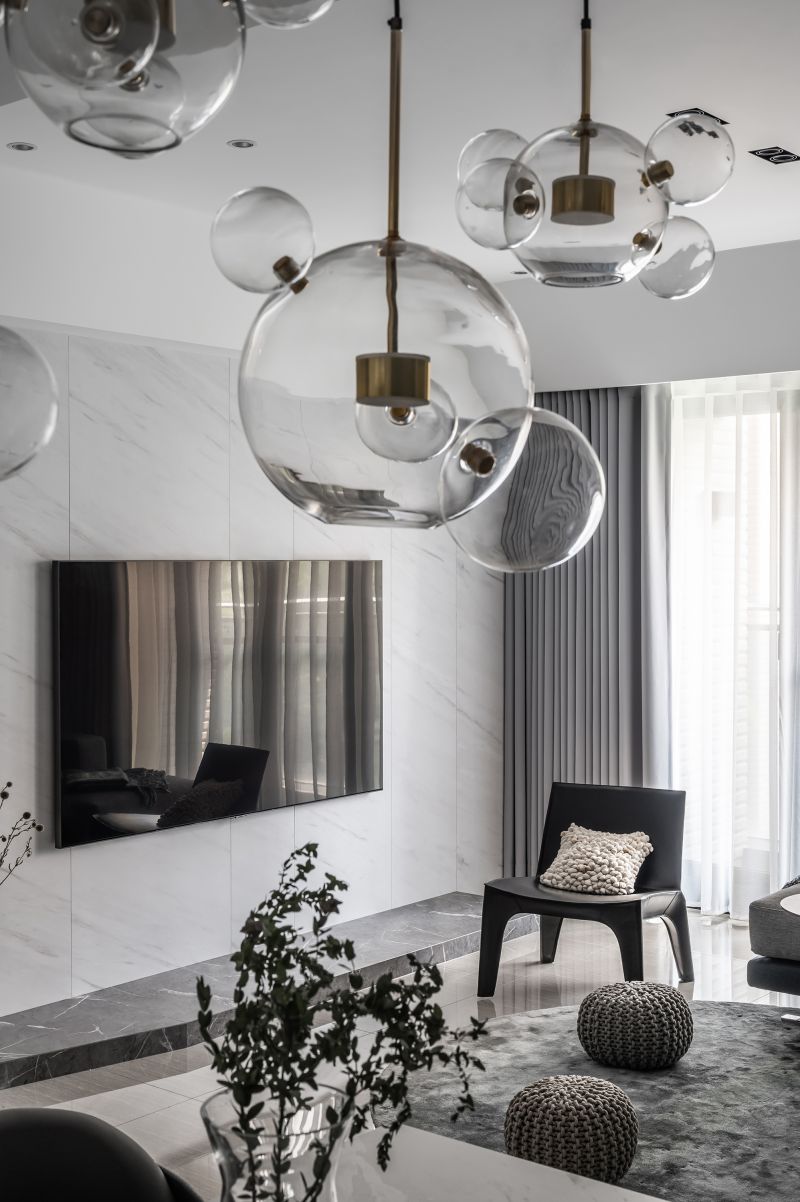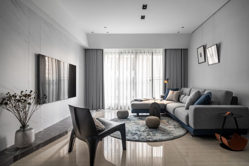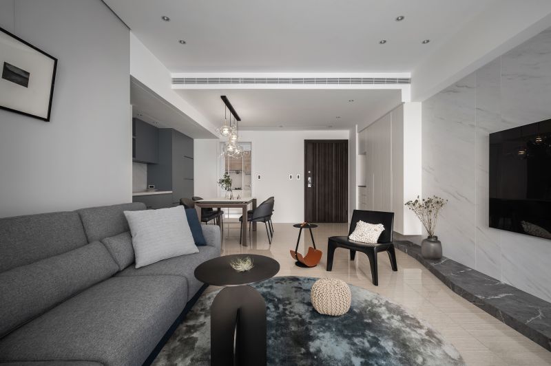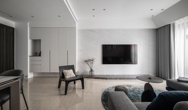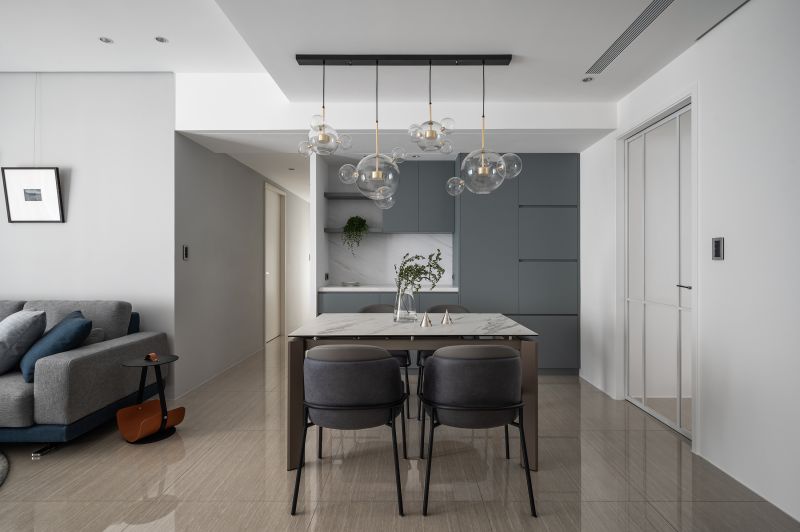 We adopt an off-white hue as the base tone and complement a faux marble grain TV wall to fulfilling an avant-garde, simple style, ideally agreeing with the couple homeowners' characteristics who engaged in the high-tech industry and caring profession. Meantime, design plain interior facades to preserve blank spaces for decorating children's art creations in the future. And furnish the house with a greyish-blue sideboard and identical-colored soft trim, ultimately revealing a clutter-free, calm, and comfy ambiance.