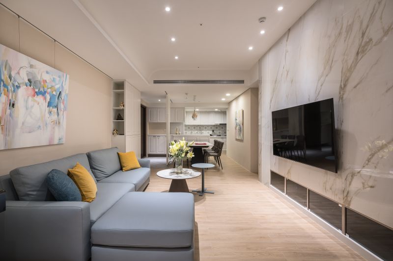 We finish the faux ceiling with white coatings and arc molding edges to ease the pressure brought by the low crossbeams in the living room while presenting a picture of waves. Then, set up a corresponding stone-patterned TV wall and grayish-blue sectional sofas to bring out a natural scene.