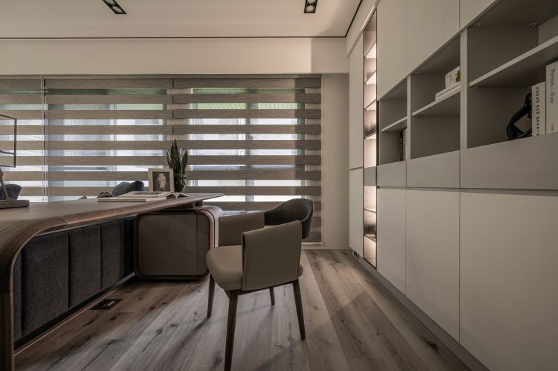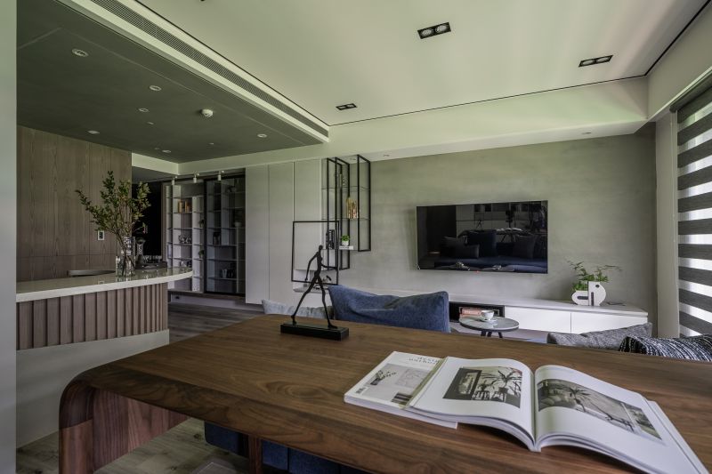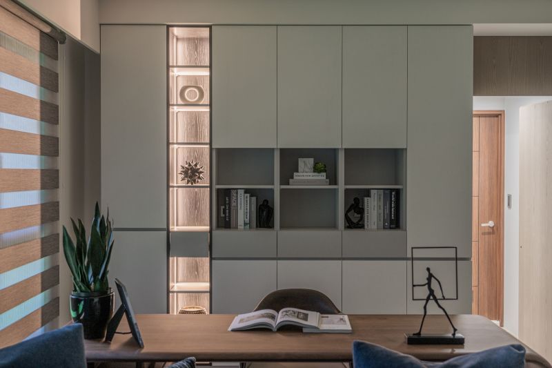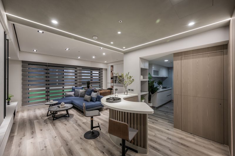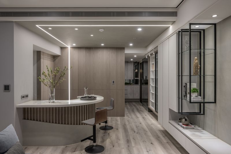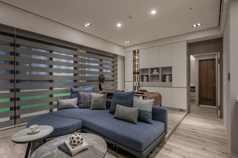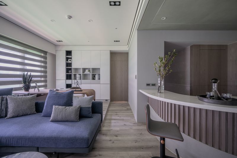 Balmy wooden flooring and pleasant fair-faced concrete realize a modern and high-tech-style ambiance, where the ceiling strip lights with clean linear features are carefully coordinated. We artfully perform a simplicity and cleanliness pattern for the single owner that matches his personality and temperament through black, white, and gray color palettes and couples with dark-blue furnishing. Additionally, agreeably reconfigure an open floor plan of living, dining, and study area, which provide flexible settings whenever the holder is alone or spend time with friends and family.