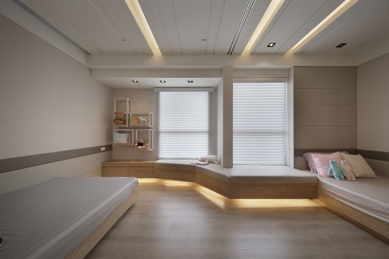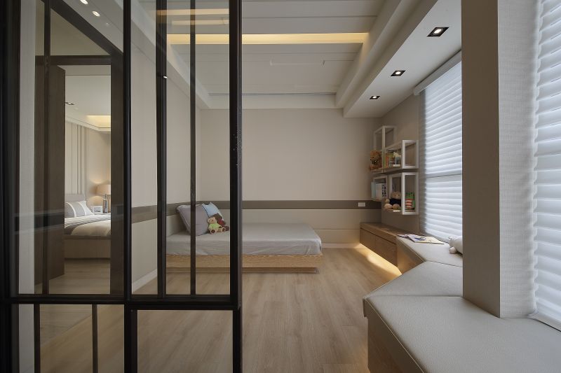 Considering that the owner couple cherishes time being with their children, it takes the living room and the dining area as the main interacting space. Then, we arranged open, floating shelves to display family souvenirs. For daily life convenience, plan smooth flows to connect different areas. And install sliding doors in the entryway and the kid’s room to activate more function and flexibility of space. Overall, the family of four enjoys happiness in this balmy and cozy home finished with laminated flooring.