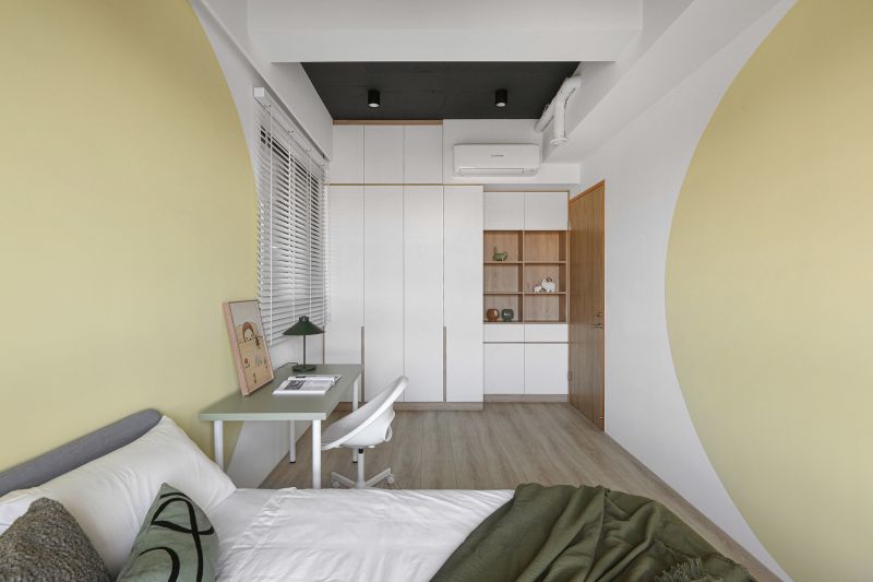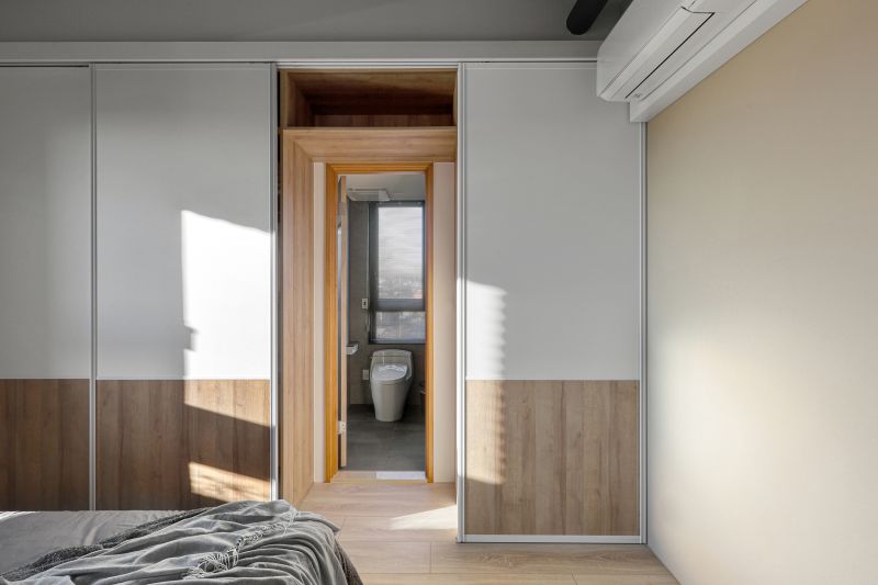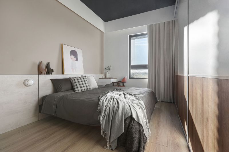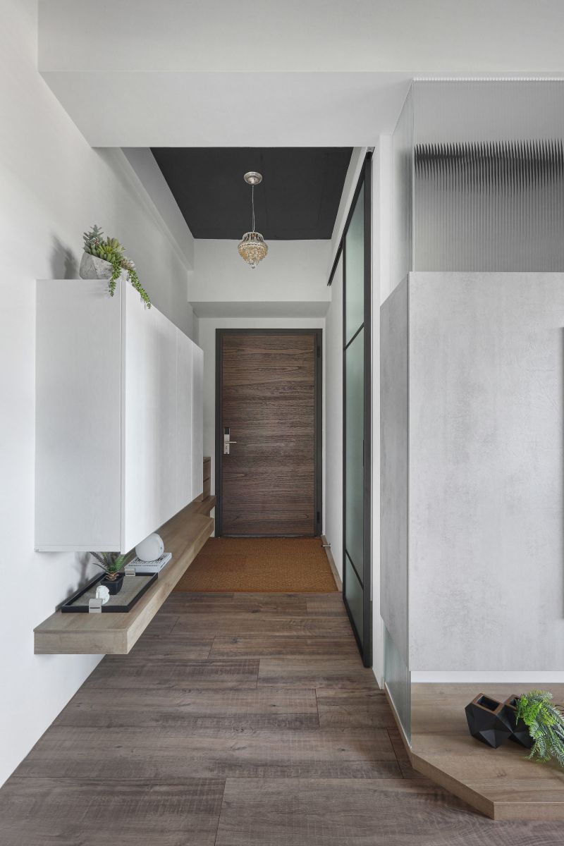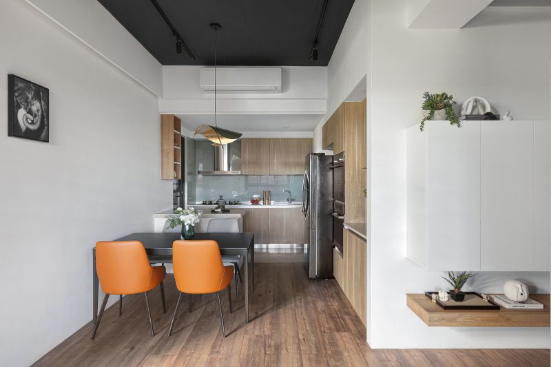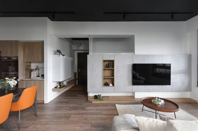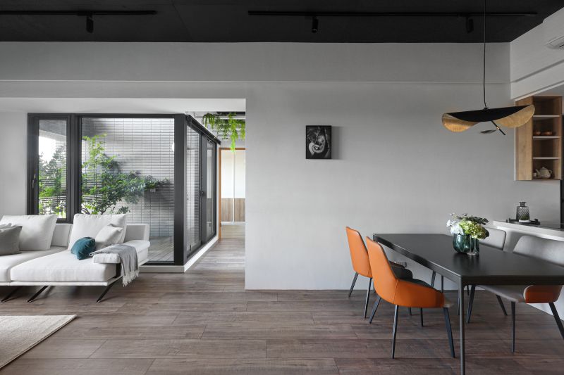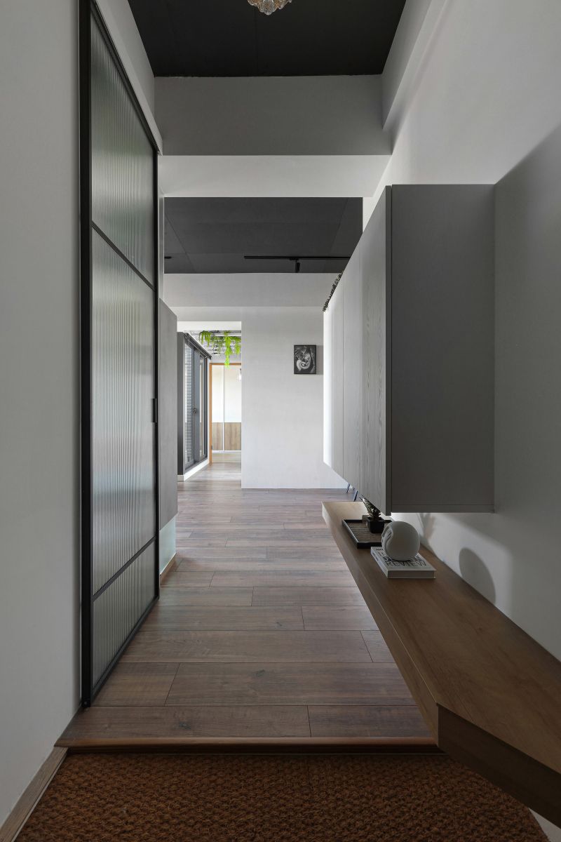 The layout of the site in the downtown area is unique, with its balcony inside and elevated. Like in a forest, the space is decorated with rustic wood grain and an elegant gray tone to highlight the greenery outside. The natural wood is painted with a mottled texture, and the ceiling is kept in its original form and painted black so that the gray is evenly spread in every corner to create a modern and stylish residence.