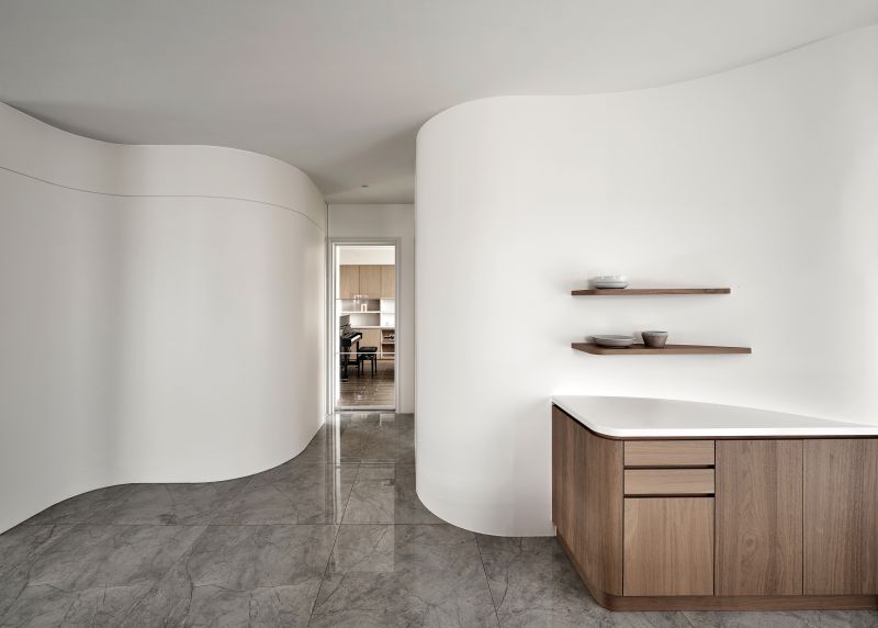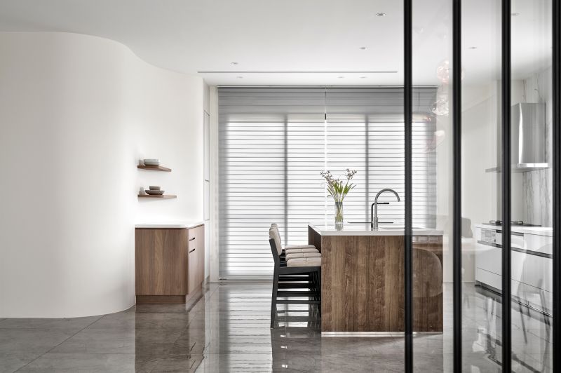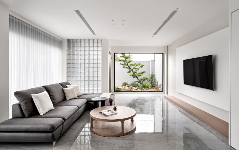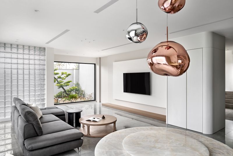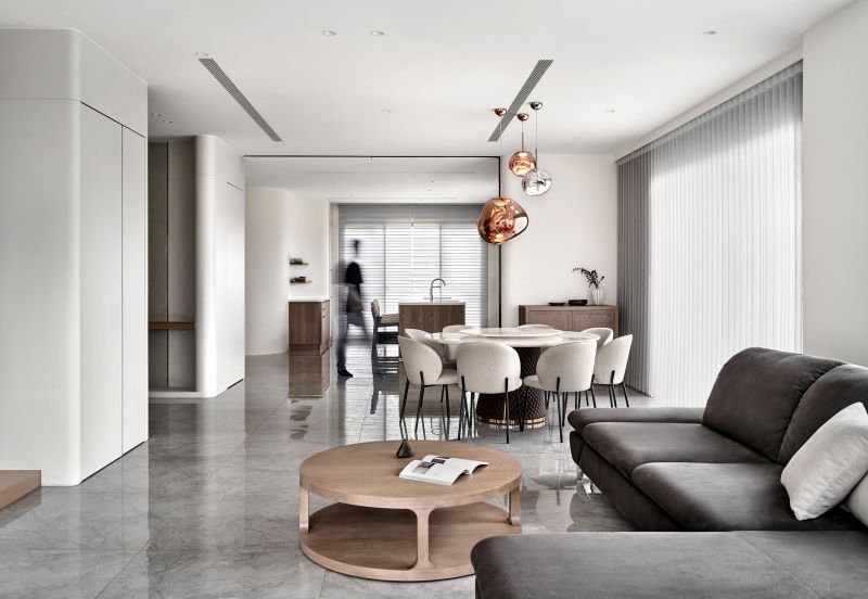 The house features an open-plan shared area complemented by numerous floor-to-ceiling windows, inviting abundant natural light and framing mesmerizing garden vistas. The design creates an unimpeded and cozy living environment while reducing the need for artificial lighting during the day. The walls are elegantly adorned with a clean palette of gray and white, performing a grand and inviting ambiance. Elements of balmy wood tones and diverse furnishings enrich the visual depth, imbuing every heartwarming family moment with delightful splashes of color.