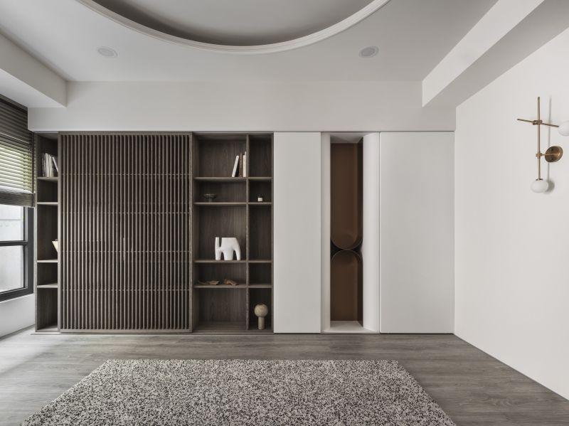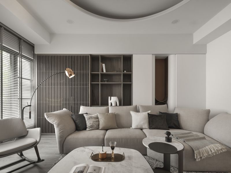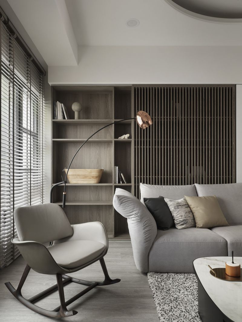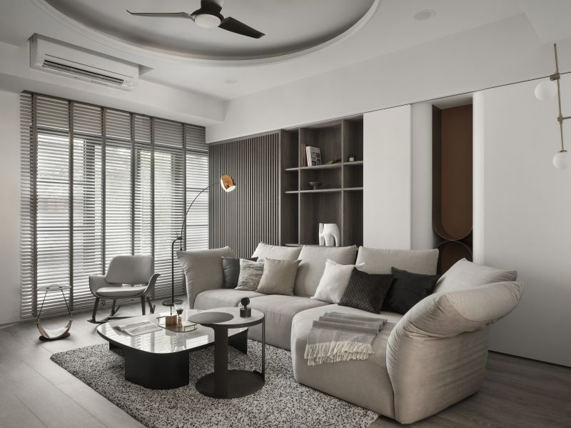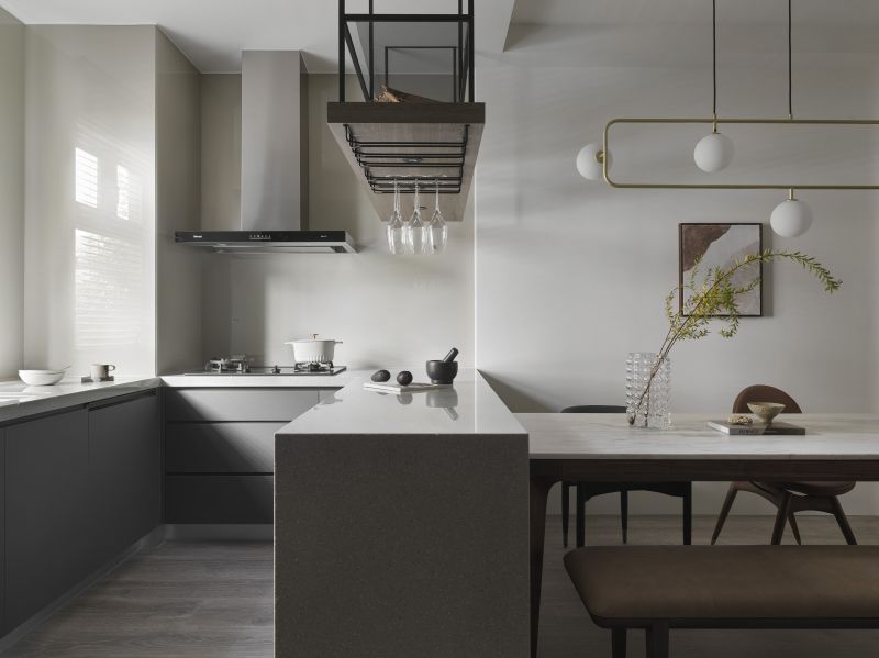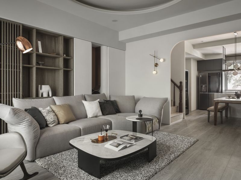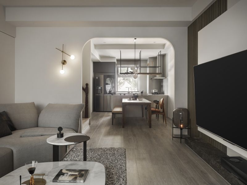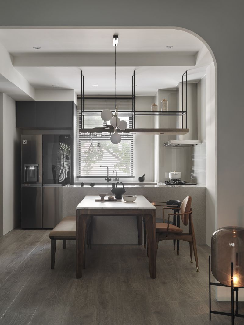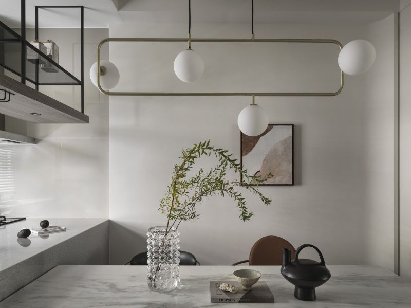 Considering the high-pressure nature of the homeowner's work in the medical aesthetics industry, we meticulously employ low-saturation colors such as off-white and light gray to create a visually and mentally soothing situation. Additionally, we carefully reconfigure the layout of the existing house, removing partitions to create an expansive open floor plan. The previously enclosed kitchen now boasts an open window, inviting abundant natural light while promoting optimal airflow alongside the floor-to-ceiling windows in the living room.