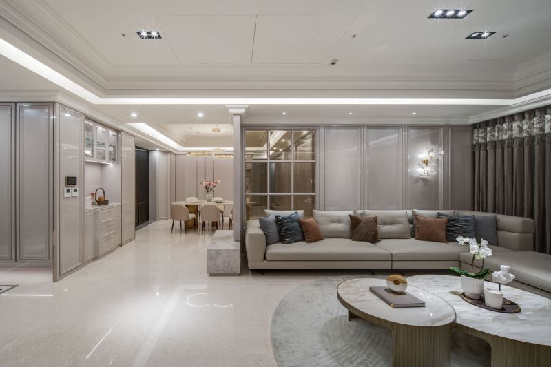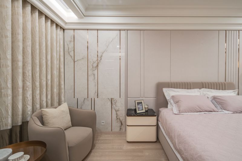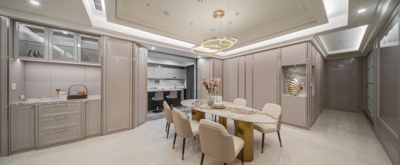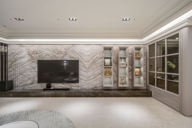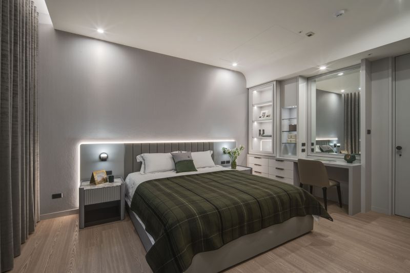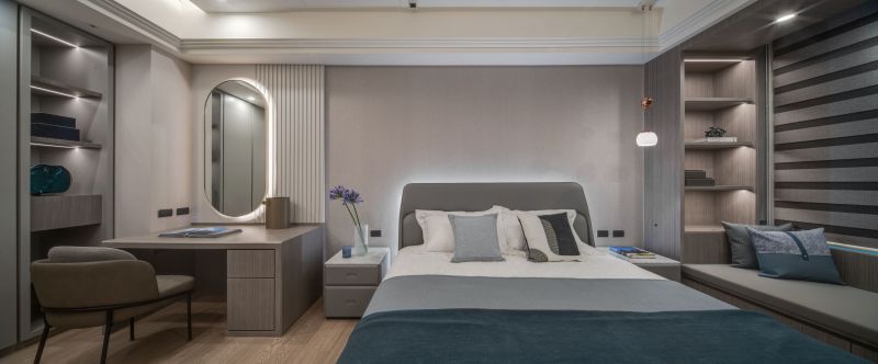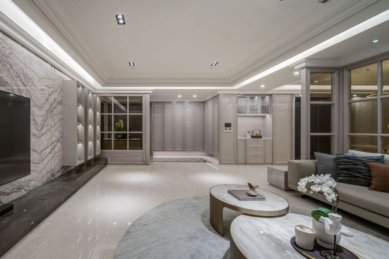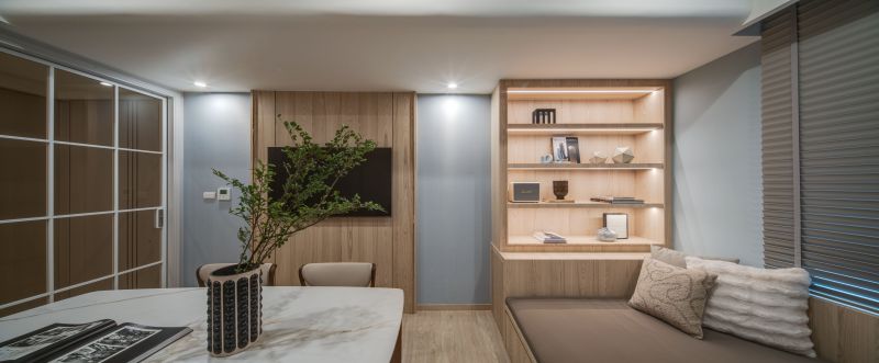 The aesthetic of this project is characterized by a shared living space that emanates a contemporary sense of luxury through the clever integration of different types of marble textures, resulting in a brightly-lit and welcoming spatial style. In contrast, the private living area employs warmer, more inviting wood tones and soft, comforting elements to set a cozy, stable atmosphere that's perfect for unwinding and relaxing.