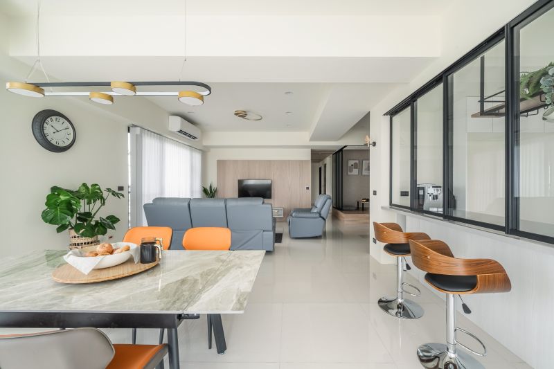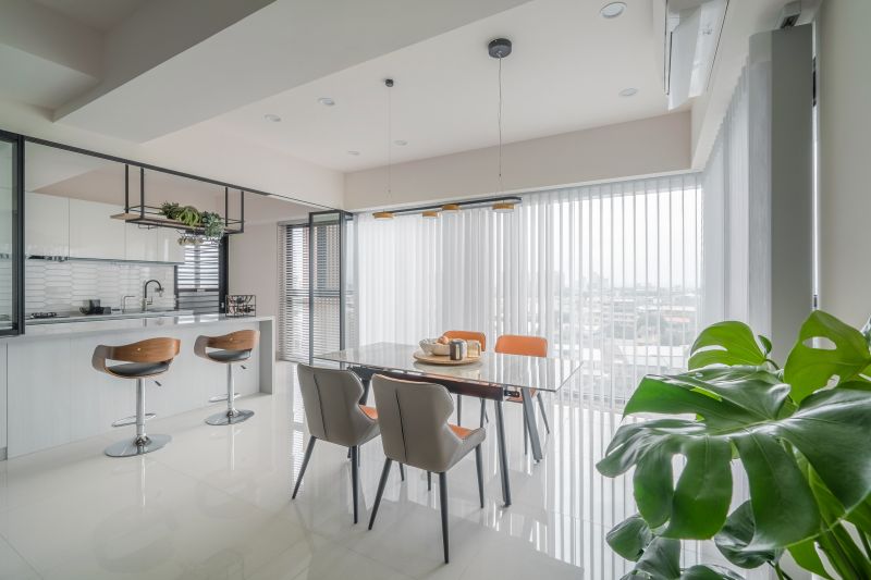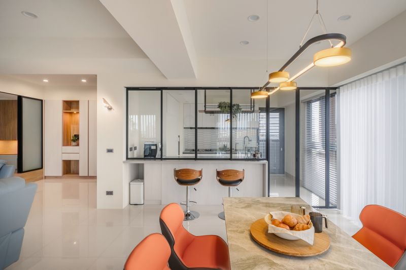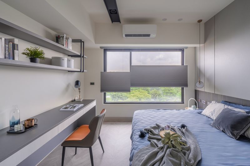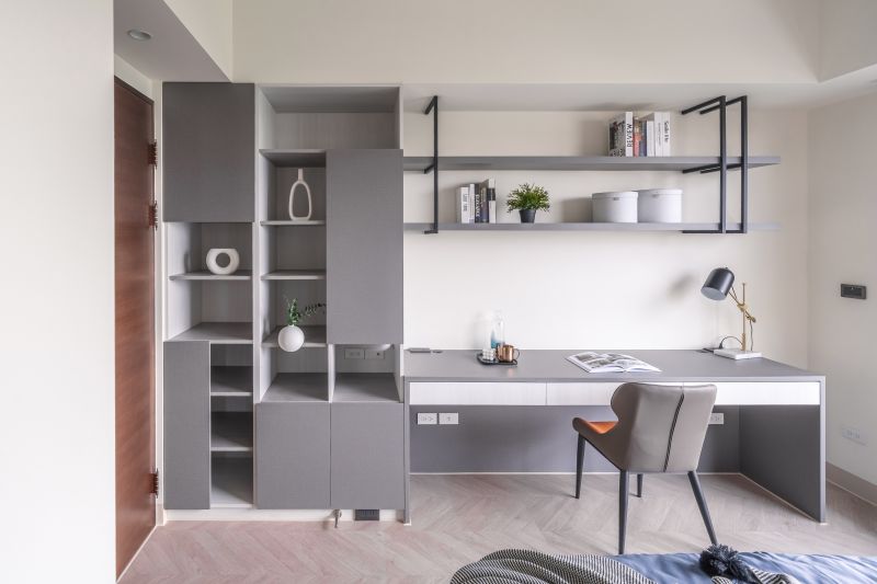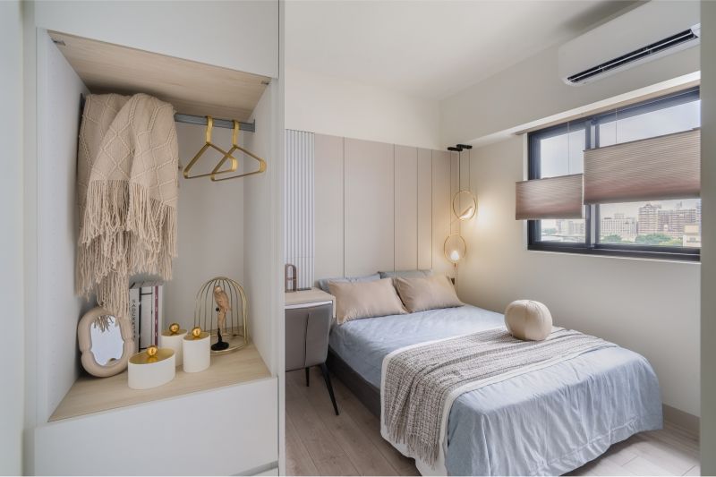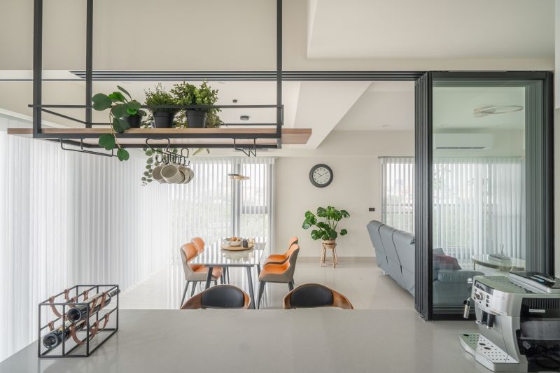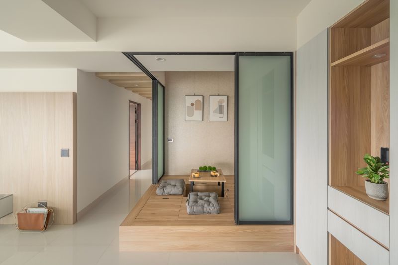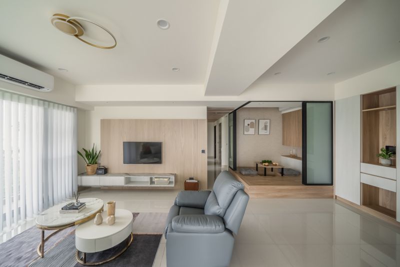 The owners love the simple atmosphere and living with their parents. Considering the needs of three generations living together, the designer creates white and light wood tones in the 64 sqm space; it also tries to reserve spacious walkways to facilitate the elders to enjoy unimpeded movement when they need to push wheelchairs in the future. The public area has an open layout, which combines the guest room, dining room, Tatami room and the kitchen all in one. Master bedroom is matched with grey wood grain and stone grain to create a calm atmosphere.