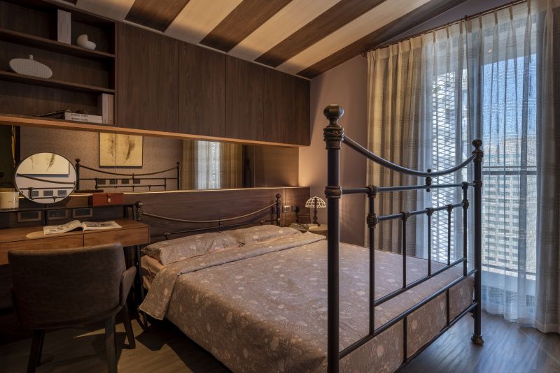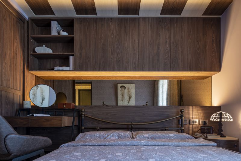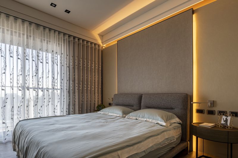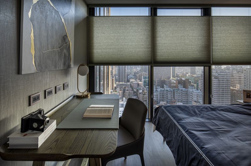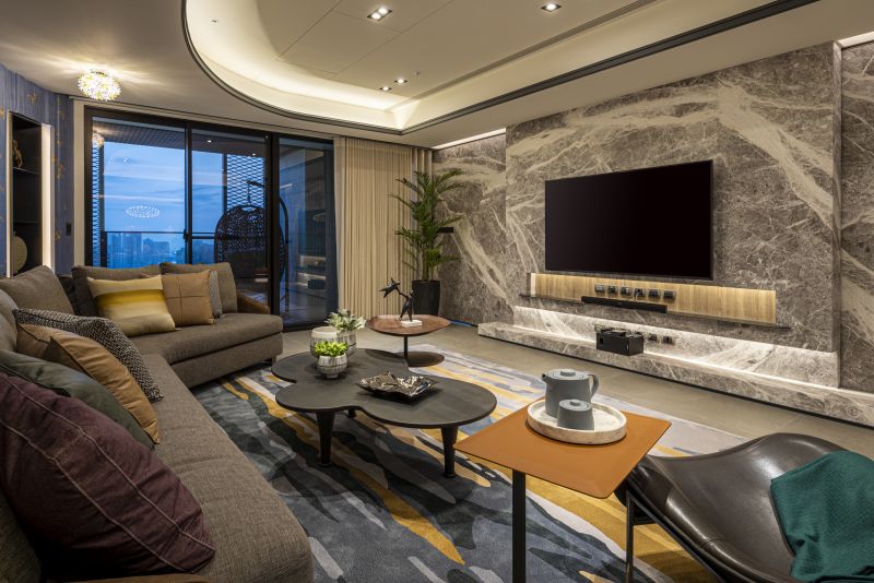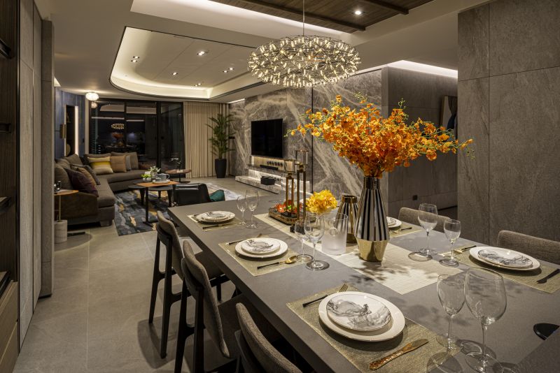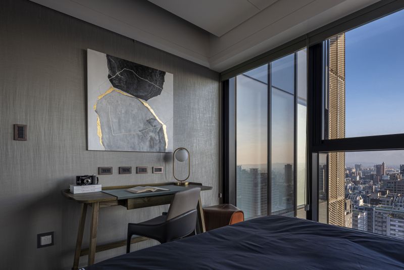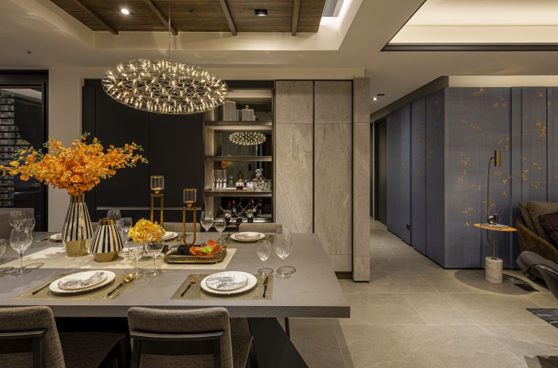 Incorporating Japan's "Wayo" aesthetics, this home melds Western and Eastern design. The living room highlights folding-screen-inspired walls and Ginkgo wallpaper for a tranquil atmosphere. Ceilings are reimagined as visual anchors through material diversity and rounded forms. A chrysanthemum-themed chandelier centers the dining area. Bedrooms range from minimalistic with panoramic views to attic-like coziness. Ample natural light illuminates each space, highlighting the benefits of high-rise living. Windows link residents to nature, even in a high-rise.