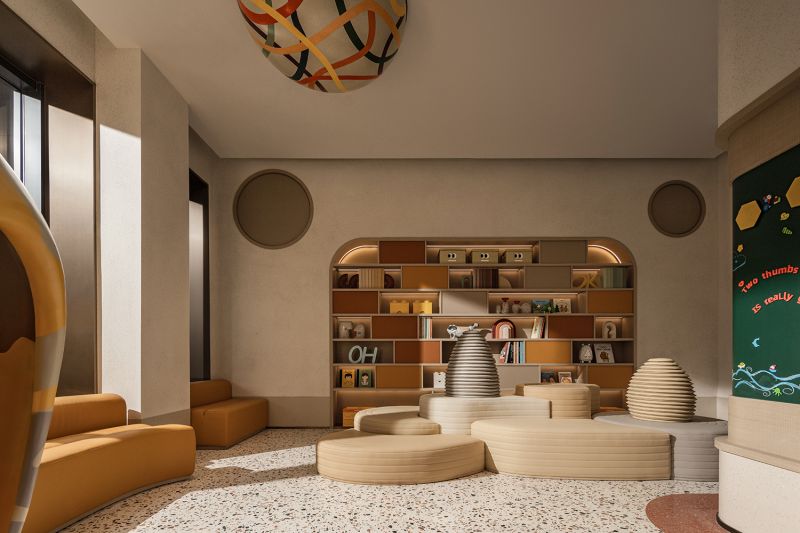 The interior design concept of the River Palace is inspired by the traditional south china culture and the winding flow of the Pearl River. As the purpose, an all-age community public space paradigm for intergenerational assistance in the Greater Bay Area is created. In designer’s opinion, the public space should not only be the second living room, but also be a living field that make people feel relax and comfortable.There is a book bar, a bistro and a children's activity area in the reception. According to the different needs of these places, a variety of atmosphere is set off.