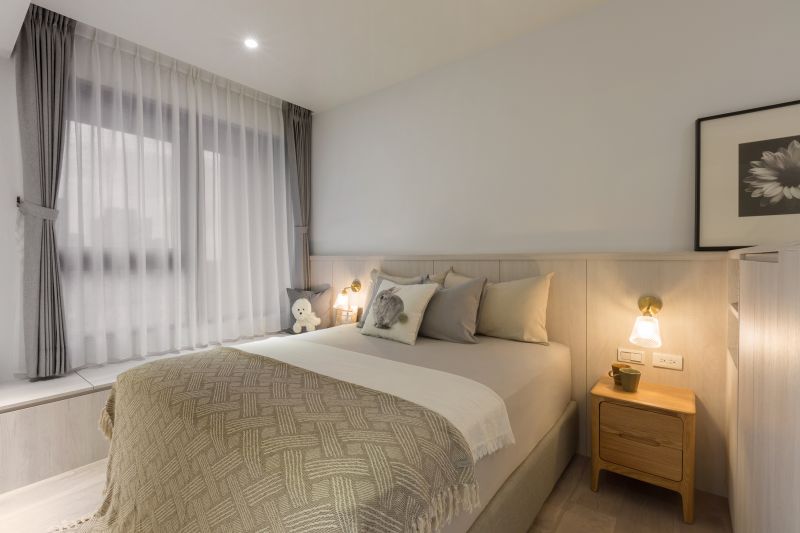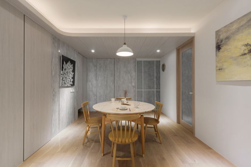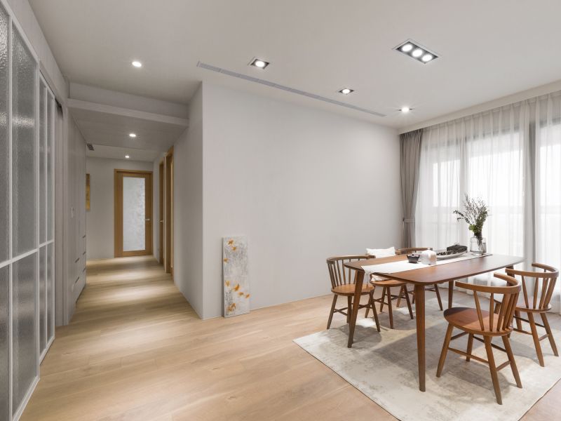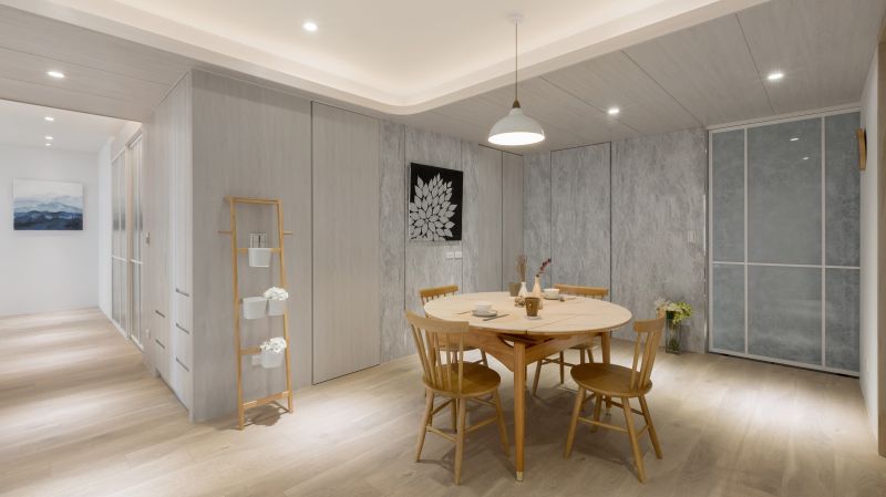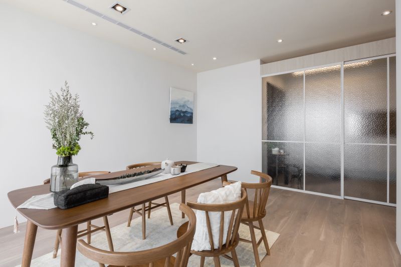 We've embraced a minimalist approach in our design, removing unnecessary decorations and furniture. A neutral color palette of creamy, light gray, and wood tones achieves an elegant minimalist appearance. Rustic-textured mineral paint complements various shades of wood grains and fabric-covered doors, creating a rich layering effect in the pristine ambiance. French windows and patterned glass doors welcome natural light into every corner of the public spaces. We've created a compelling representation of Japandi aesthetics by seamlessly blending Nordic minimalism with Japanese tranquility.