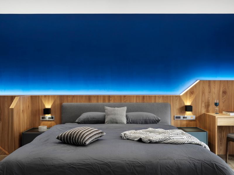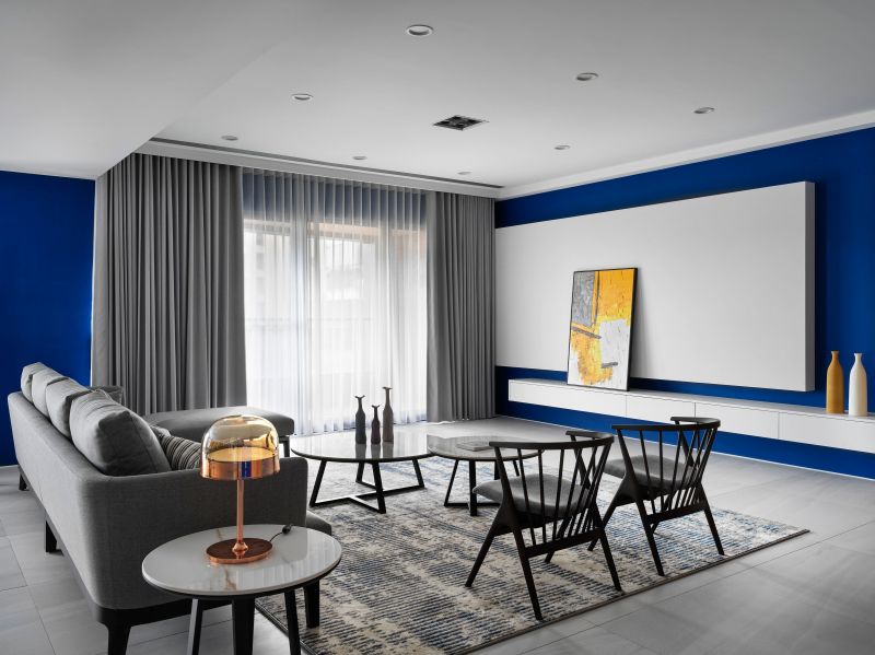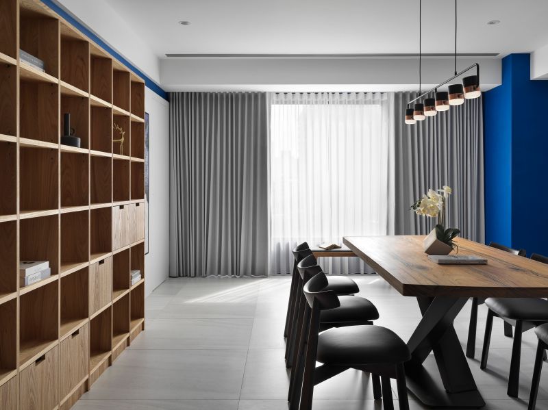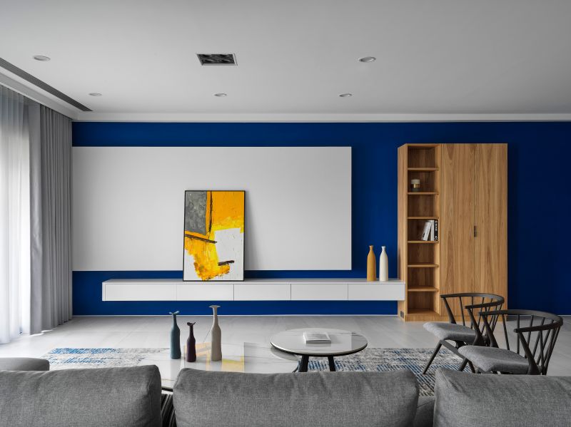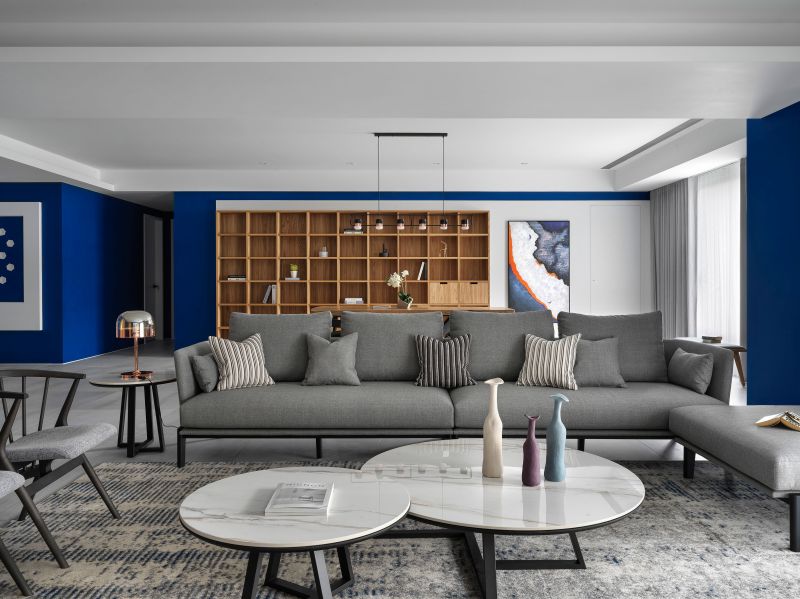 In the public spaces, partial navy blue walls set off white paint and oak wood cabinets with striking grains. A warm and cold texture combination combines grayish furnishings and curtains to complement a favorite style of homeowners’ vivid vs. understated.