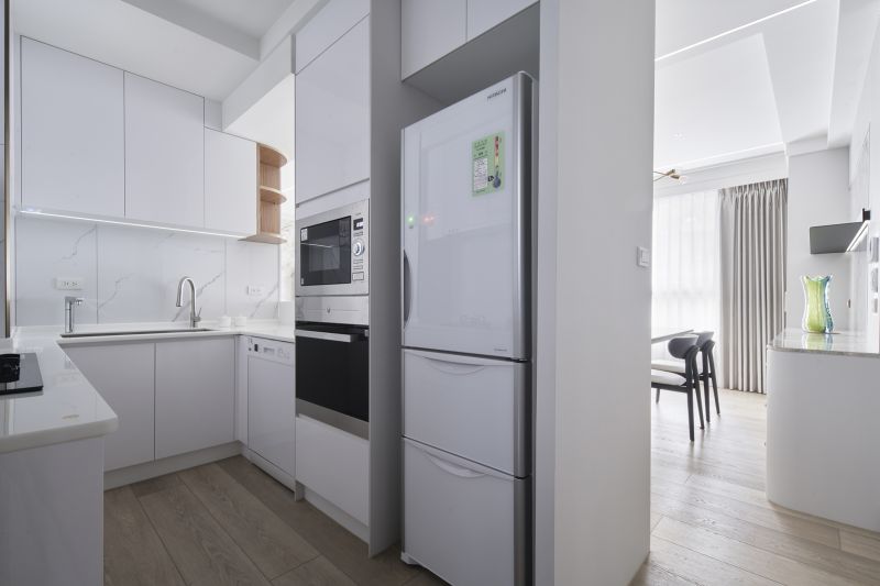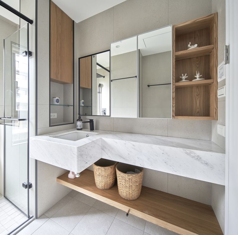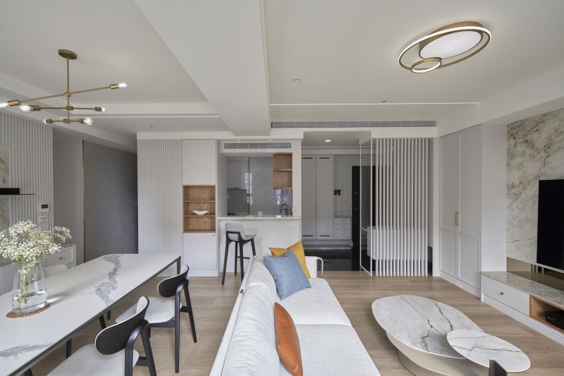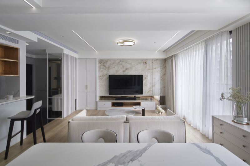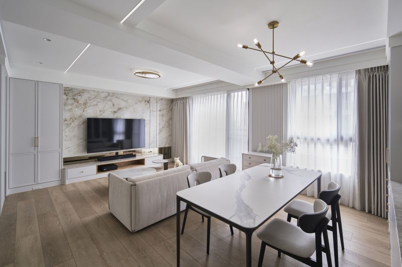 Natural light from the large floor-to-ceiling windows illuminates the interior with shades of light along the contours of the ceiling, floor, and walls, while the soft screen windows filter the blazing sunlight. People can step barefoot on the warm wooden floor to feel the brightness and temperature of the sun. The open plan of the social area conveys an image of openness. With an innovative idea, the project's living room and dining room are planned as one. The same pattern of marble creates the delicate TV wall and sideboard, the grille gives the rhythm of breathing-like lighting.