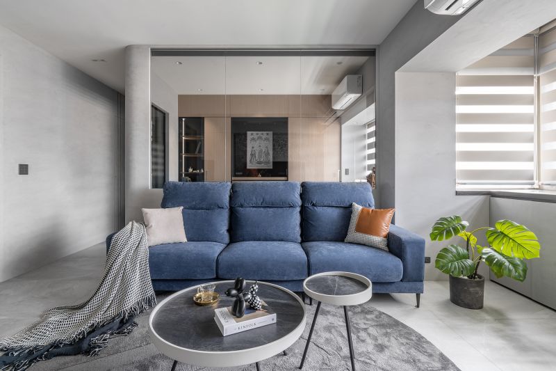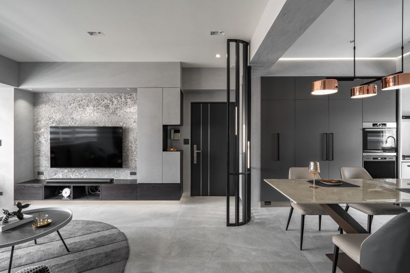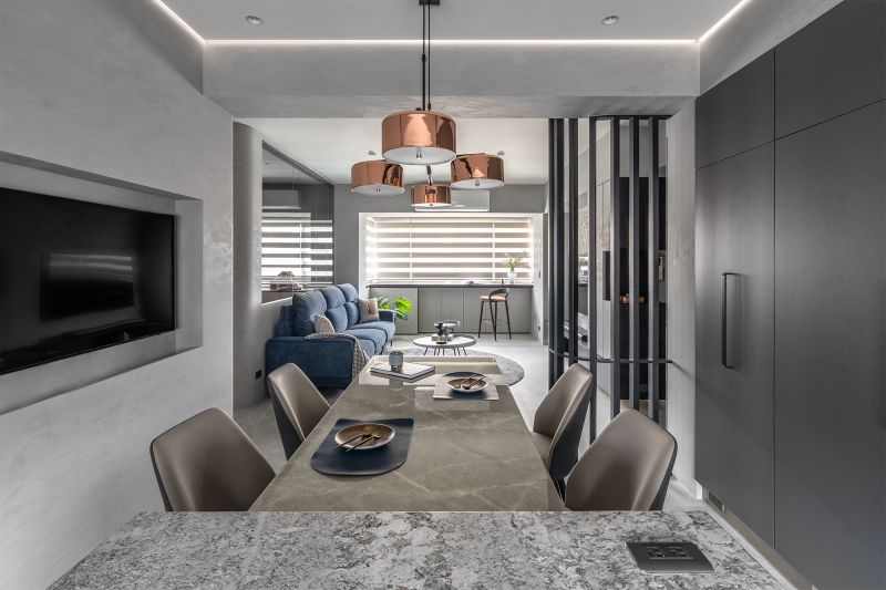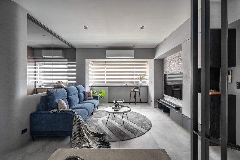 The grayscale color scheme serves as the backdrop for the public areas, Incorporates a blue-orange color scheme enhanced by soft lighting. Various harmonious building materials, including iron, lacquer, stone, The entire project incorporates durable and easy-to-maintain materials, such as ceramic flooring with textured finishes, Silestone, and dark-schemed wood, allowing older residents to care for the environment easily.