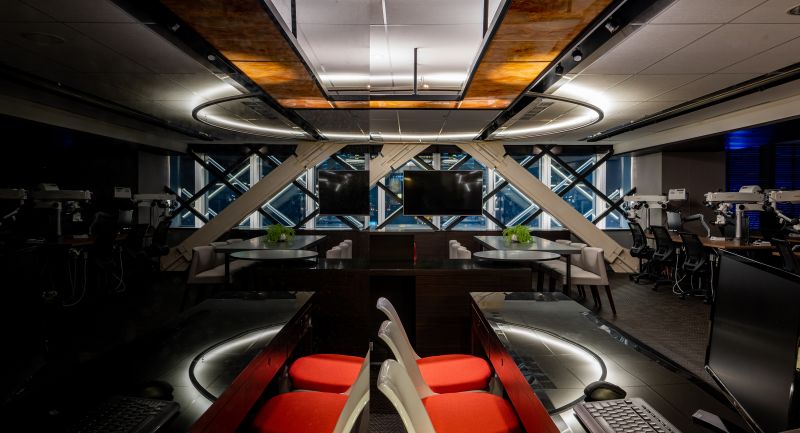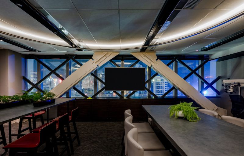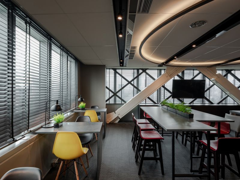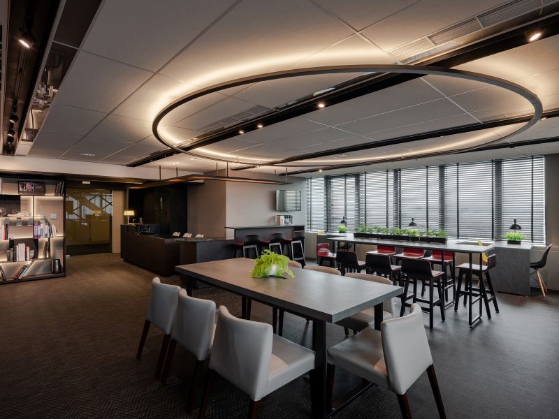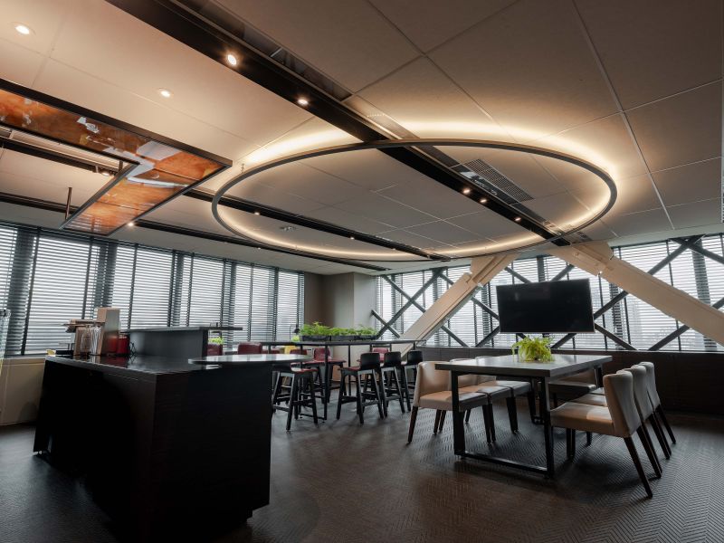 Besides signifying the core business value, the ceiling design with transparent acrylic panels allows the original ceiling height to be completely exposed.