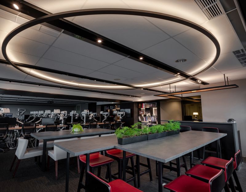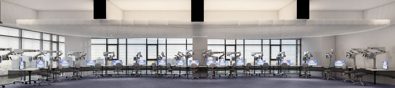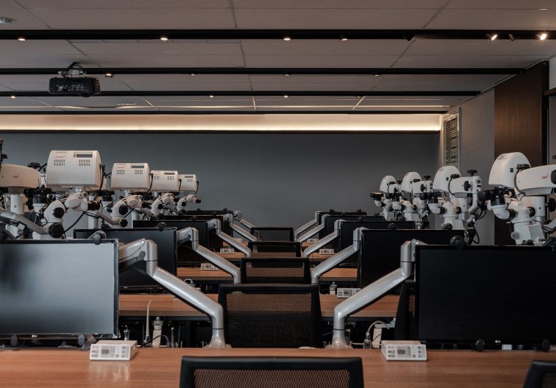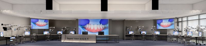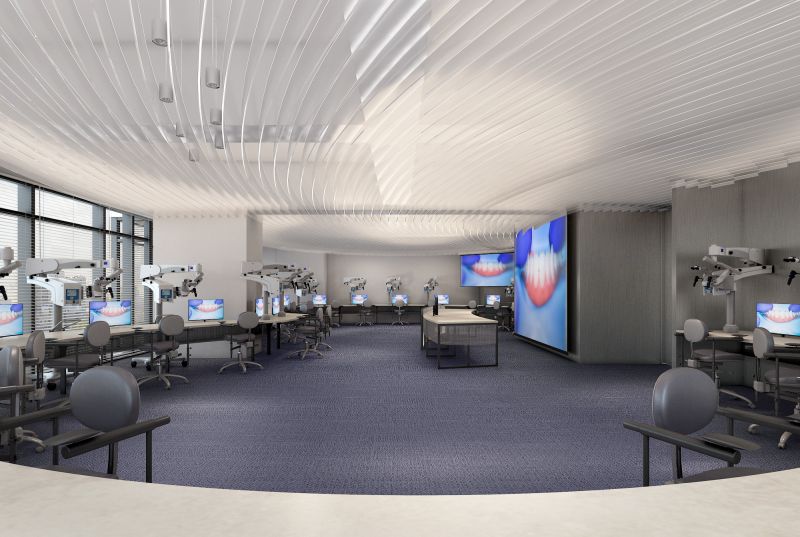 The design team shapes the rounded false ceiling to simulate the motif of dentition as the project serves as a dental microscope surgical training center.