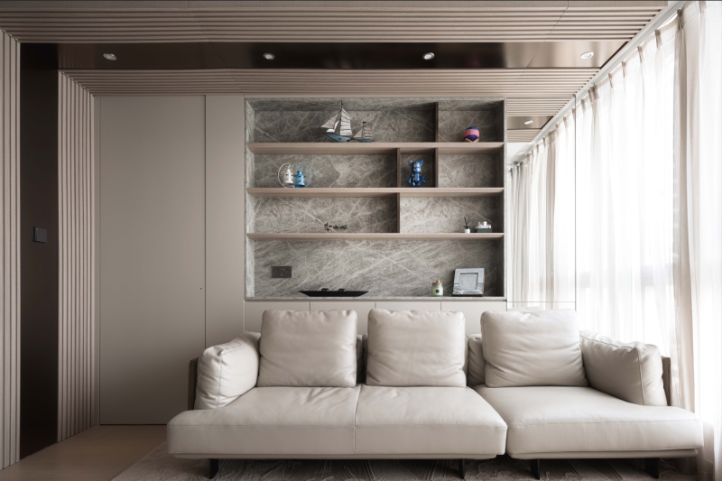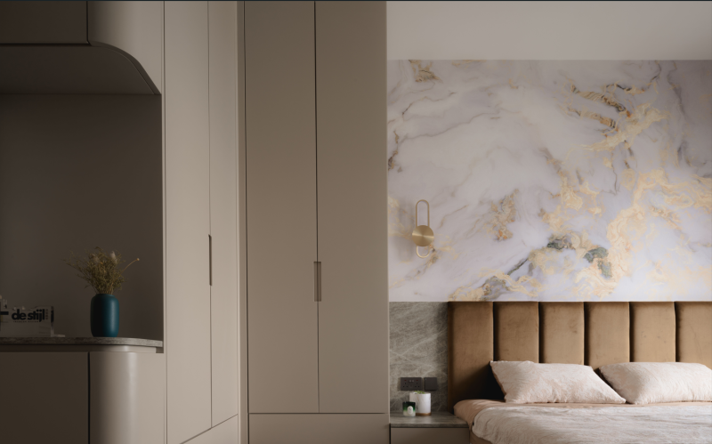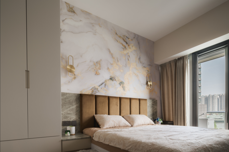 The headboard of the master bedroom is decorated with stone-patterned wallpaper, adding texture and depth to the space and fully showcasing the unique style and taste of the master bedroom.