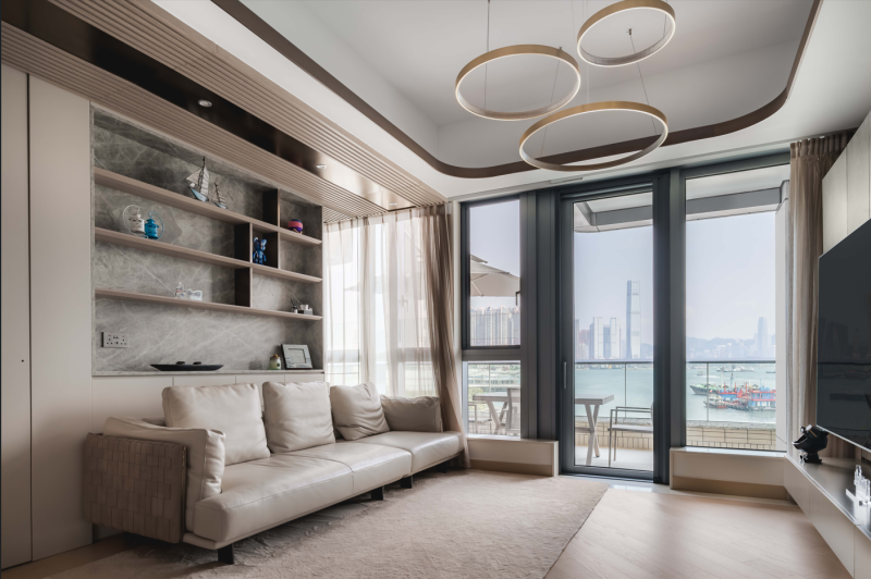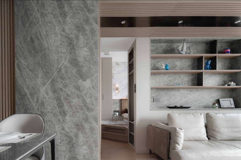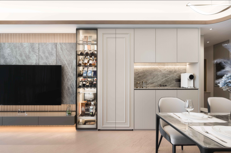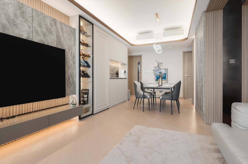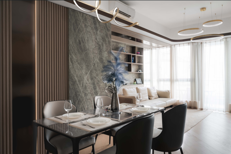 The space features a cool-toned wooden design throughout the living room and dining area, complemented by marble textures and lighting effects to create an elegant and luxurious atmosphere. Create visual extension and depth using line elements in design.