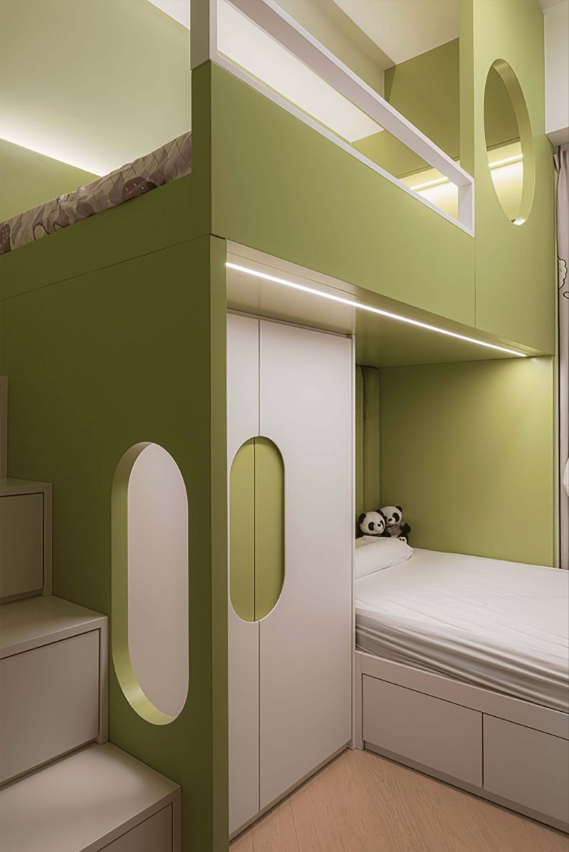 The children's room is dominated by refreshing green tones, creating a natural and comfortable atmosphere. The circular cutout design of the wardrobe adds